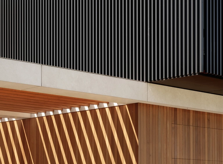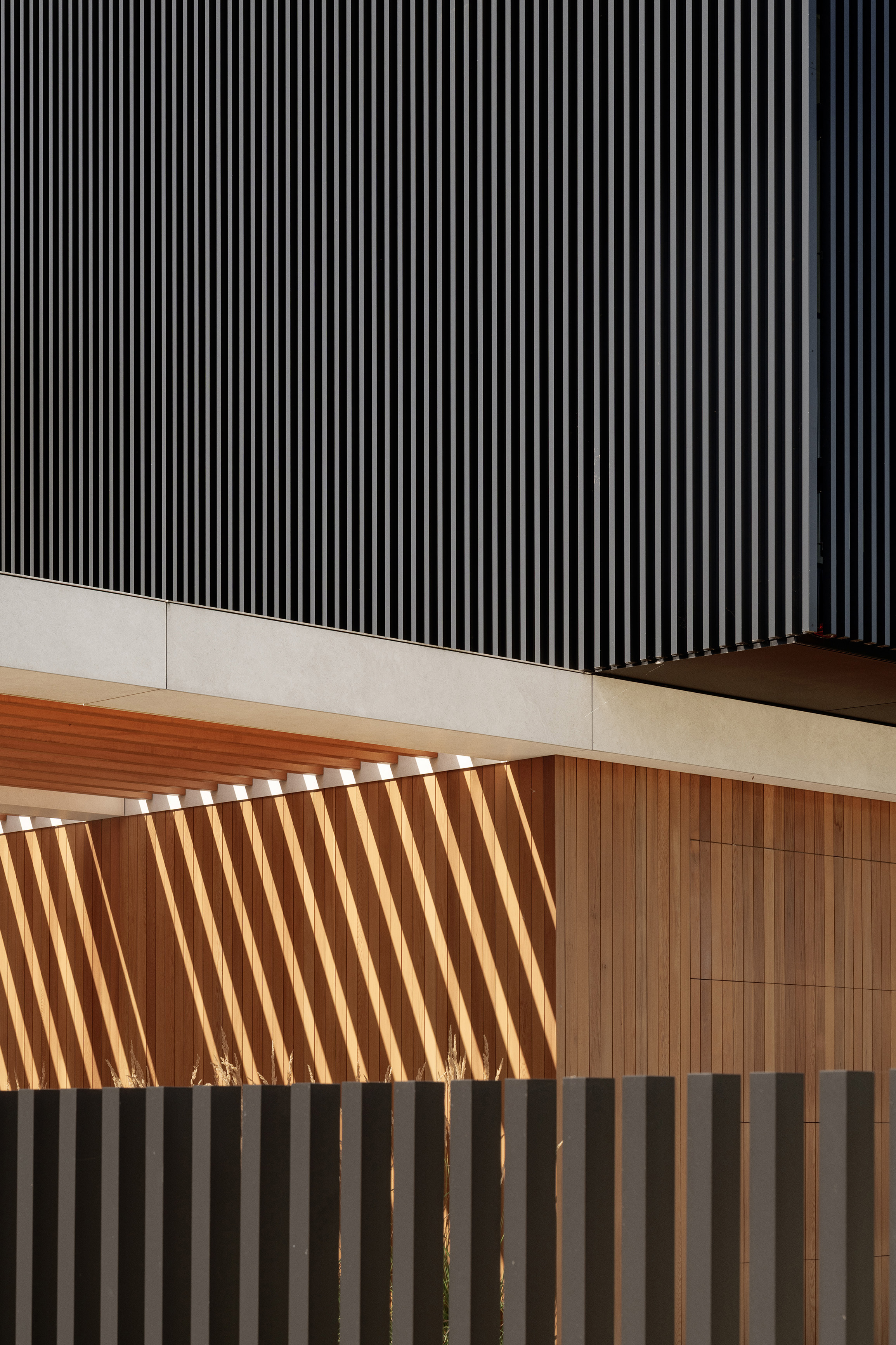 Bryła budynku została wyraźnie podzielona na dwa kontrastujące ze sobą poziomy. Masywniejszy, ciemny moduł górny zdaje się unosić nad lekkim, niemal w całości przeszklonym parterem. To wrażenie potęgują rytmicznie rozmieszczone pionowe panele, które nie tylko zdobią elewację, ale, dzięki ukrytym wśród nich ruchomym żaluzjom, pozwalają na inteligentne zarządzanie prywatnością mieszkańców.
