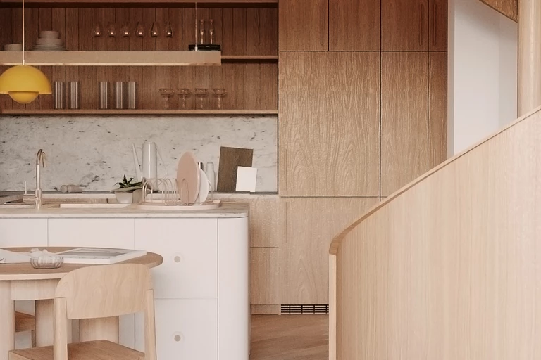 Istotnym elementem projektu jest drewno – forniry, okładziny ścienne i klasyczna jodełka na posadzce w całym mieszkaniu grają tu główną rolę. Proste, minimalistyczne formy zostały zestawione z obłymi kształtami – łukowymi nadprożami w dziennej strefie, kręconymi schodami oraz zaokrąglonymi ścianami w łazience oraz detalach mebli. Do dawnej klasyki w wydaniu retro nawiązuje lastryko, ale w nowoczesnym wydaniu połączone z drobną, prostą mozaiką ścienną.