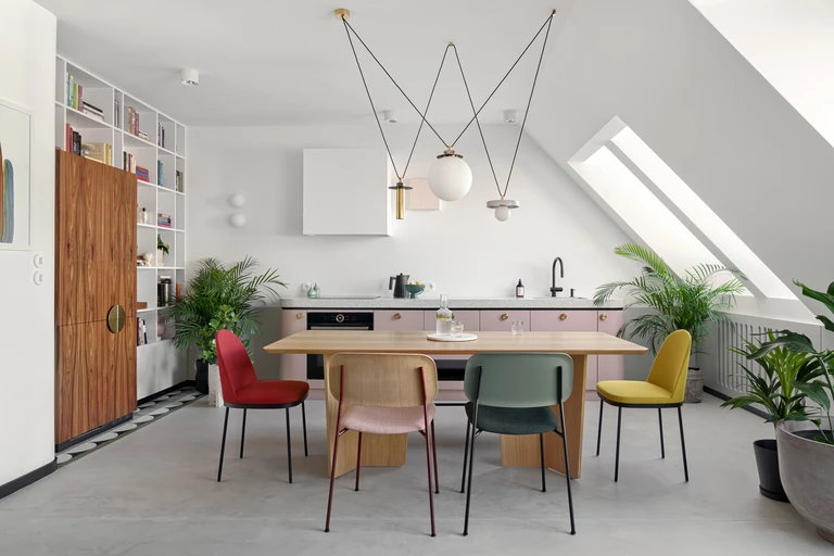Układ zaproponowany przez dewelopera zakładał mało praktyczny aneks kuchenny we wnęce za kominem, dlatego przekształcono rzut tak, aby zmieściła się tu w pełni funkcjonalna kuchnia. Ciąg kuchenny usytuowano na ścianie szczytowej jako wolnostojący, lekki mebel w delikatnym różowym kolorze z pogrubionym blatem z terazzo. Tym samym we wnęce za kominem powstało idealne miejsce na obszerny regał na książki, w którym ukryto lodówkę i wysoką szafkę cargo. Front lodówki z forniru palisandrowego otwiera się dzięki jednemu z czterech mosiężnych uchwytów w kształcie ćwiartki koła.