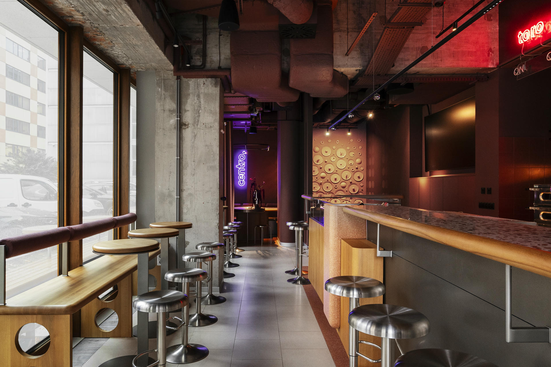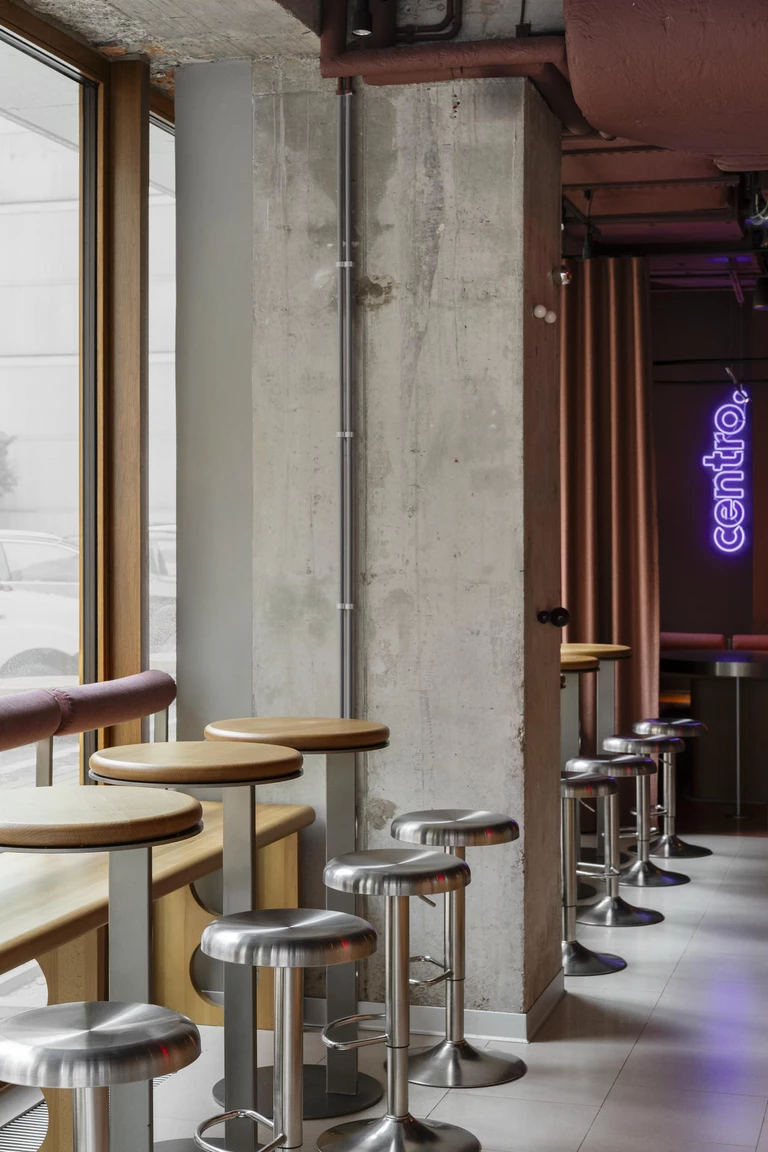 Kontrast pomiędzy surowością betonu a ciepłem drewna buduje atmosferę lokalu. Drewno pojawia się w siedziskach, ławkach i wykończeniu baru, a metalowe detale dopełniają modernistyczną kompozycję. Dzięki temu wnętrze zachowuje ducha miejsca, jednocześnie nabierając nowoczesnej lekkości.