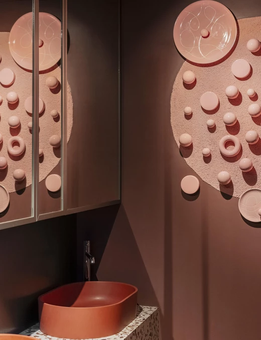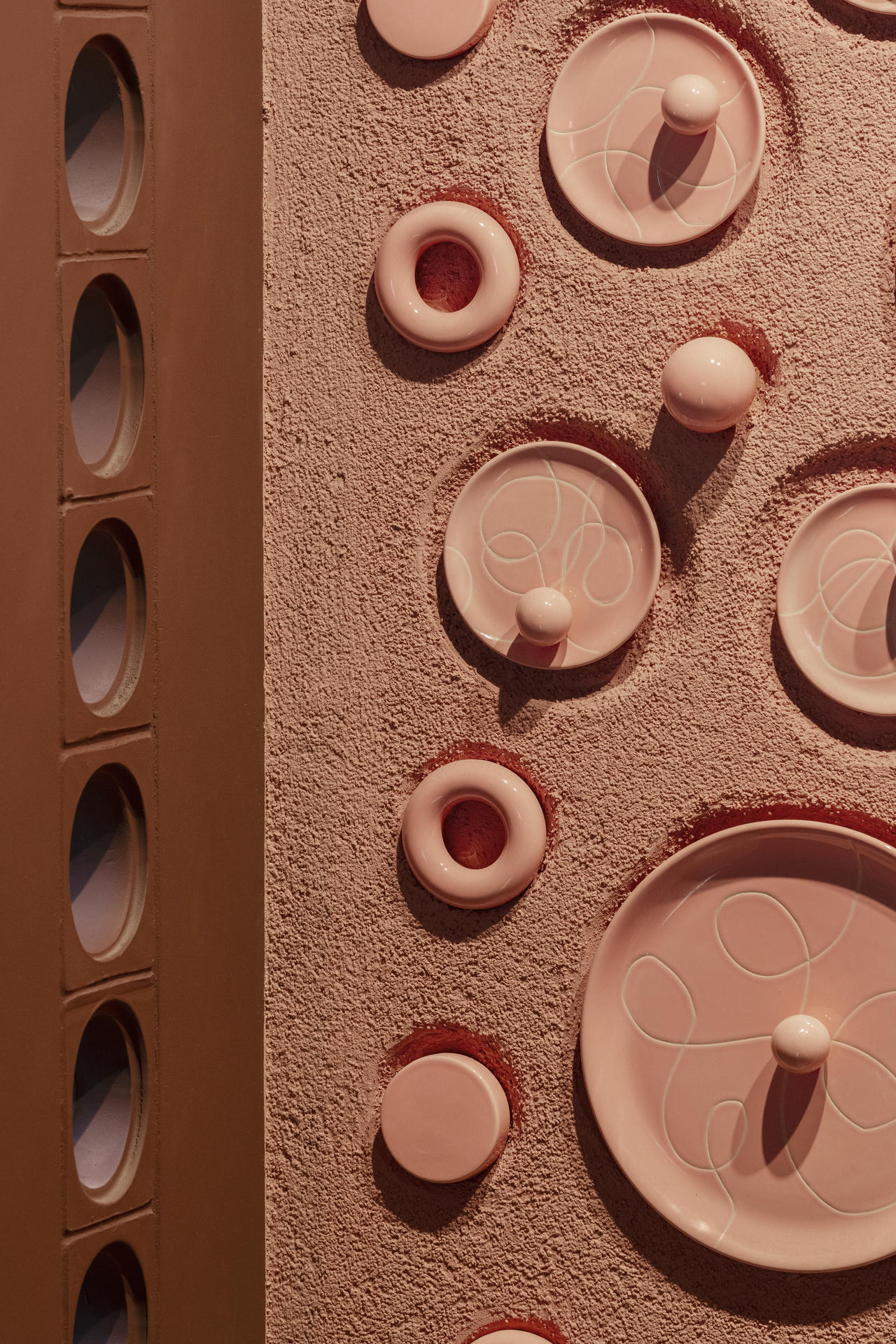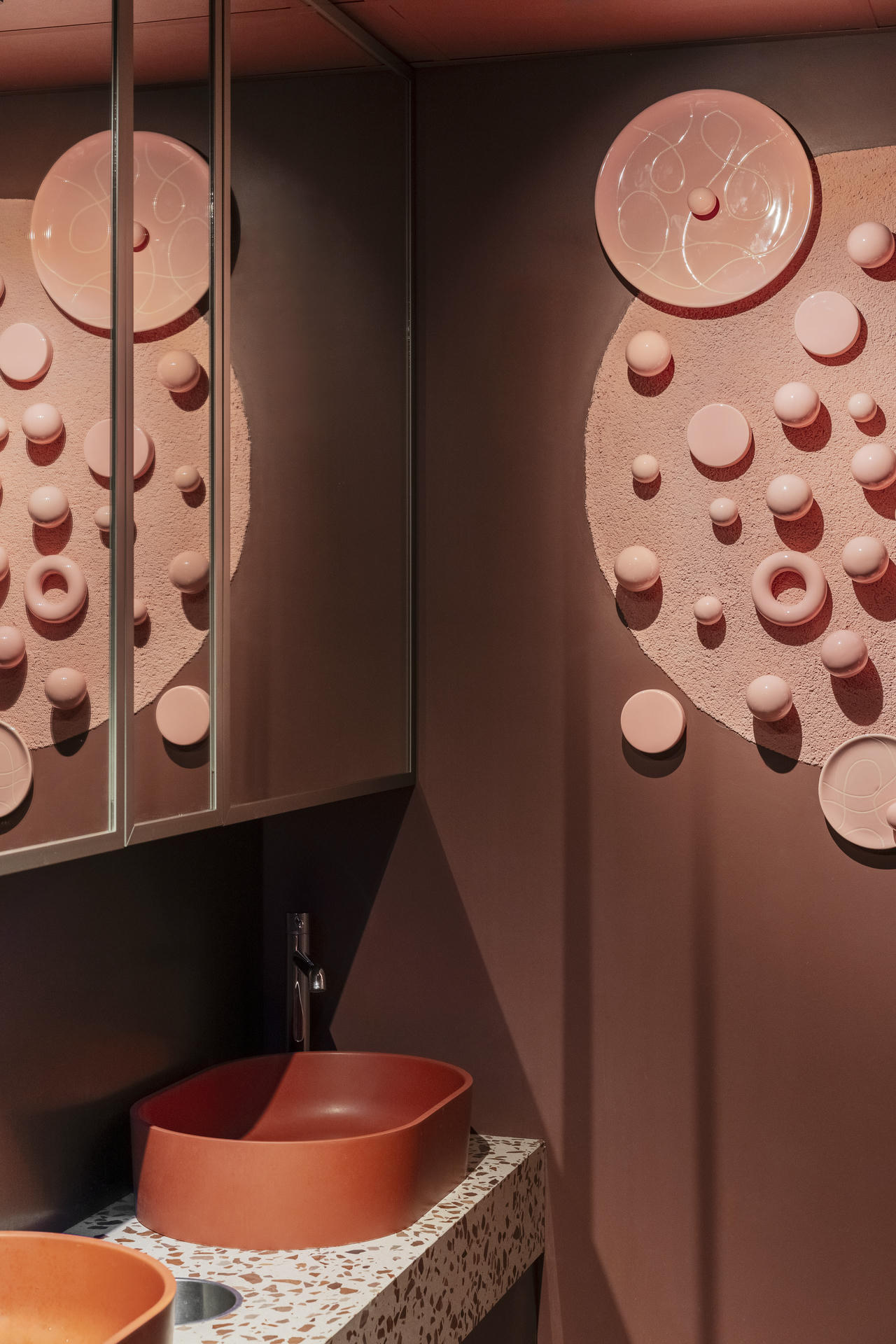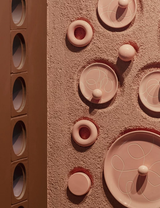 Nie można nie wspomnieć o różowej elewacji budynku. Tynk typu „baranek” w charakterystycznym, różowym odcieniu stał się dla nas punktem wyjścia do pracy nad paletą barw – dodają projektantki z mow.design. To właśnie róż stał się tłem dla ceramicznej instalacji autorstwa Malwiny Konopackiej, znanej z połączenia rzemiosła, ilustracji i designu.