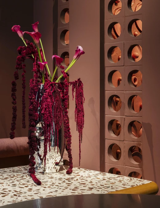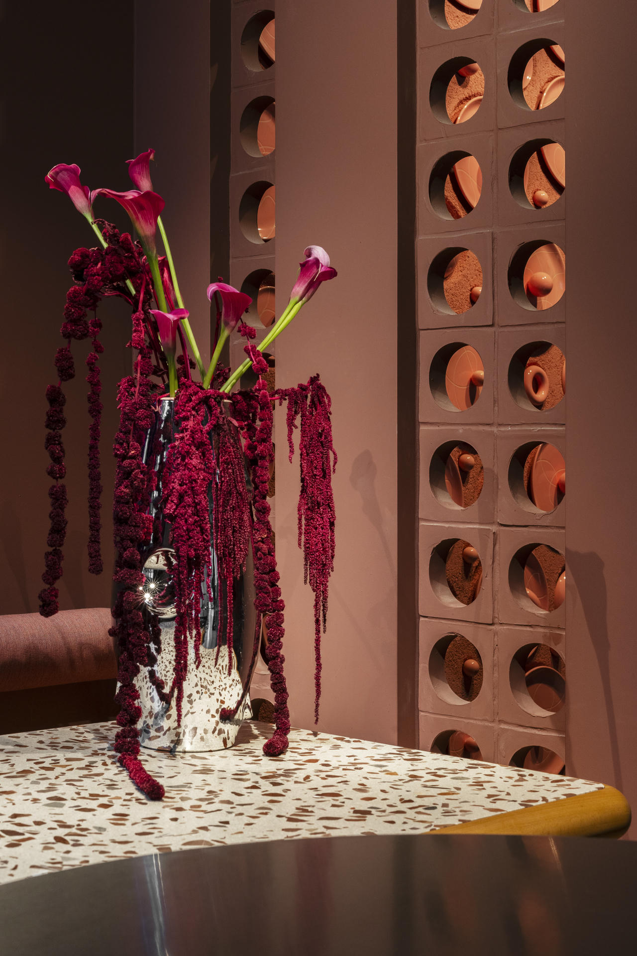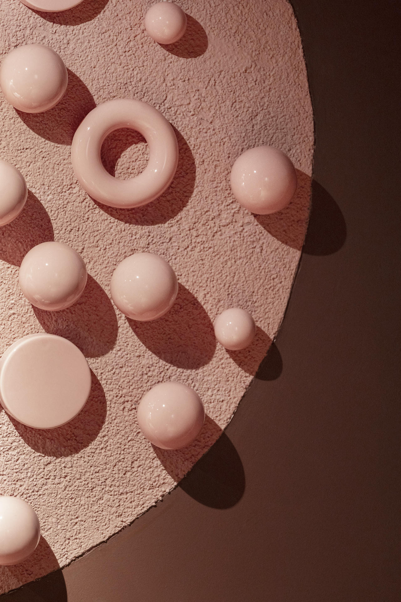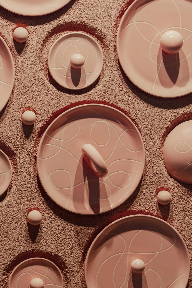 Nie można nie wspomnieć o różowej elewacji budynku. Tynk typu „baranek” w charakterystycznym, różowym odcieniu stał się dla nas punktem wyjścia do pracy nad paletą barw – dodają projektantki z mow.design. To właśnie róż stał się tłem dla ceramicznej instalacji autorstwa Malwiny Konopackiej, znanej z połączenia rzemiosła, ilustracji i designu.