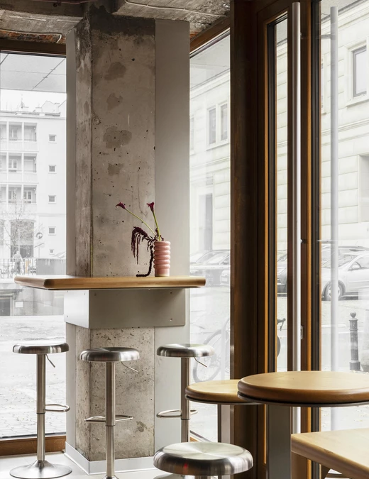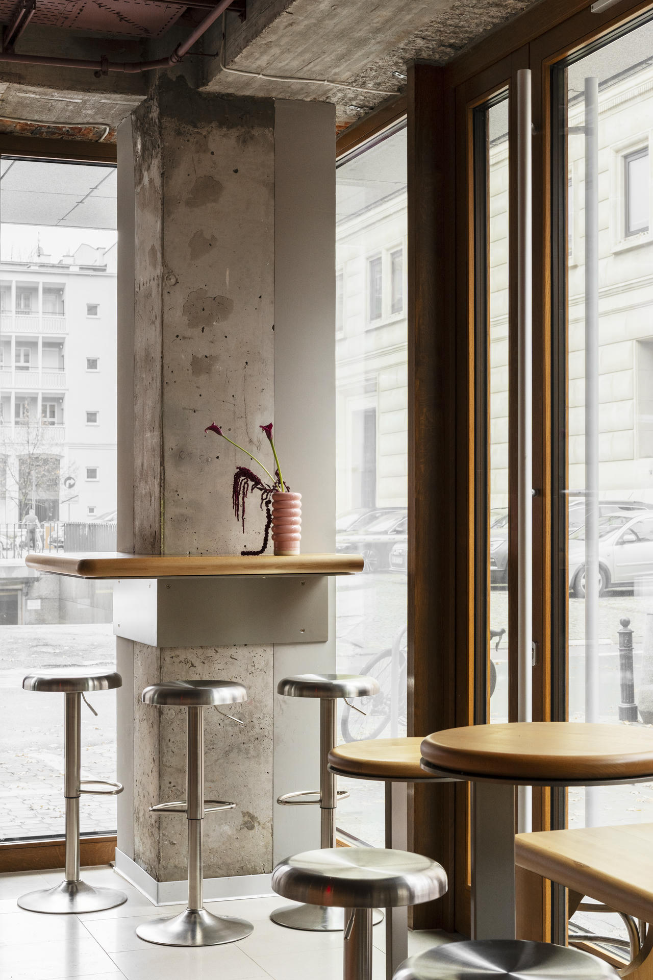 Nowy lokal mieści się w modernistycznej kamienicy z końca XIX wieku. Betonowe detale, metalowe balustrady i powściągliwość form stały się punktem wyjścia dla projektu mow.design. Dla nas, architektek, zawsze kluczowy jest kontekst przestrzeni – bryła, historia miejsca, otoczenie – zaznaczają autorki. Chciały, aby wnętrze bistro organicznie współgrało z architekturą budynku, a nie stanowiło przypadkowej dekoracji.