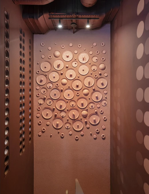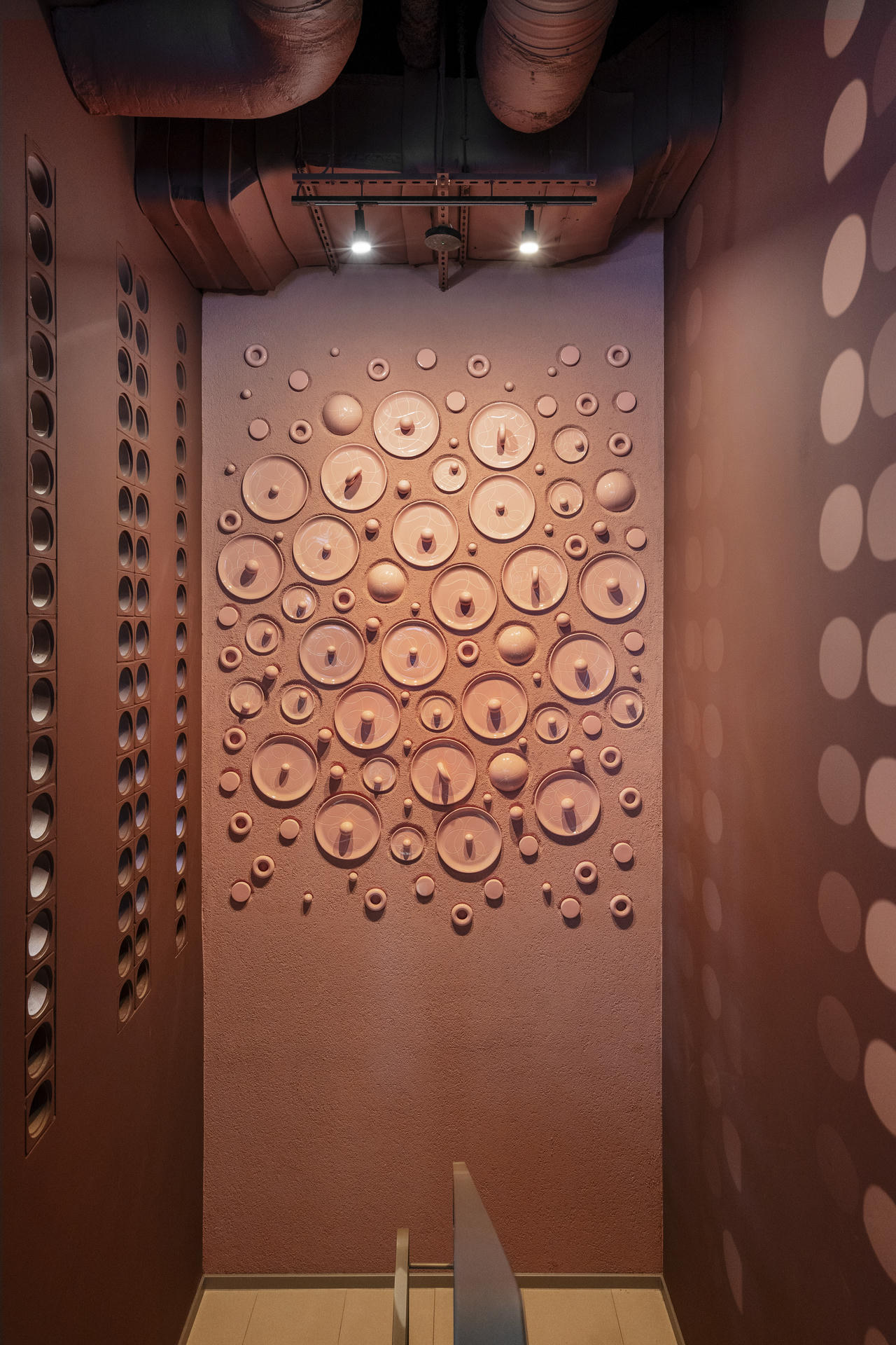 Artystka stworzyła mozaikę złożoną z talerzy, misek i pater zdobionych techniką sgrafitto – z motywami inspirowanymi włoską kuchnią i wirującym makaronem. Instalacja ożywia klatkę schodową, zamieniając ją w nietypową galerię.