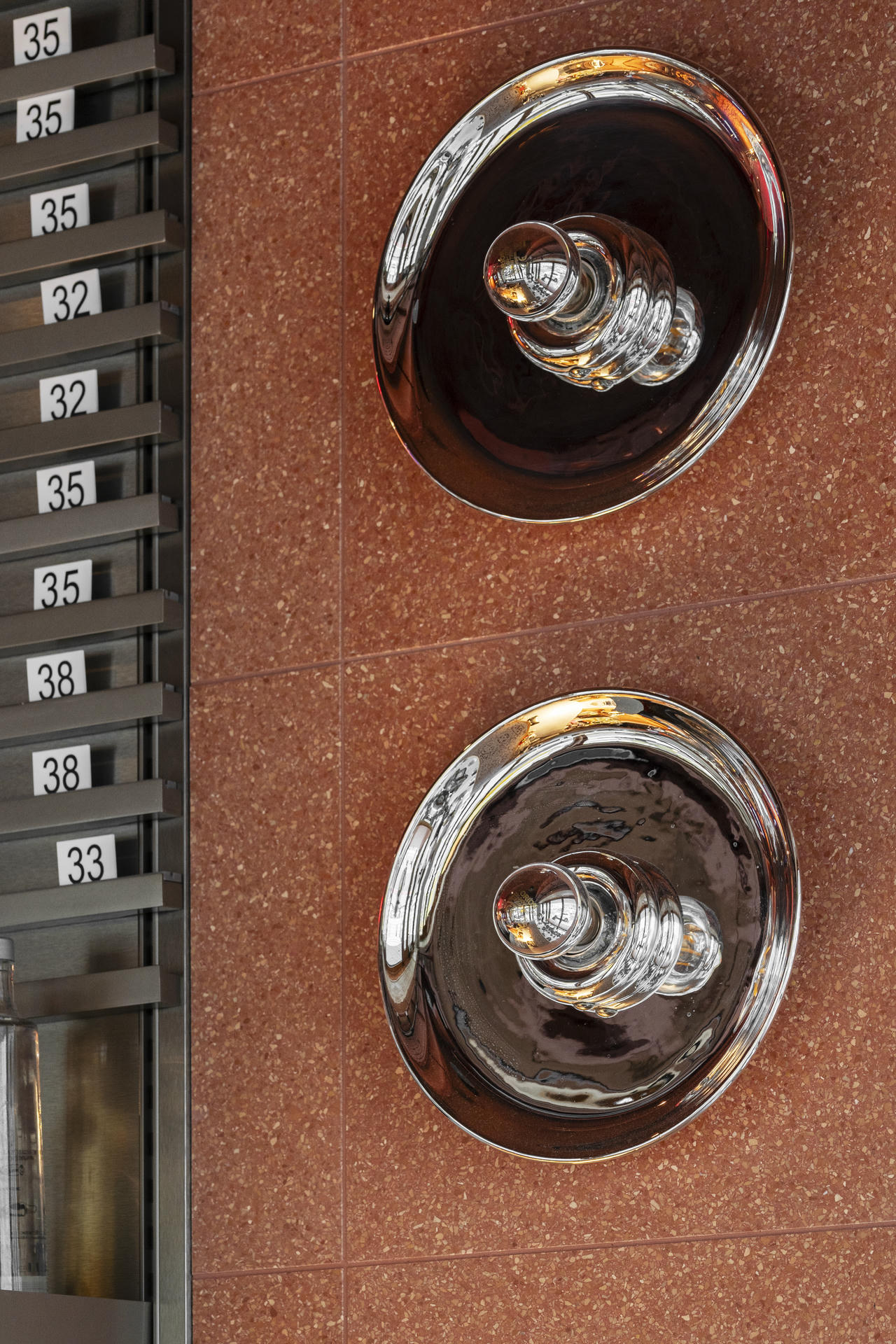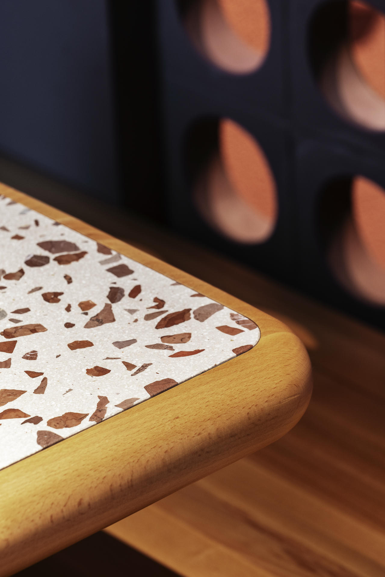 Wejście główne i cokołowa część narożnika obiektu wyróżniają się pasem lastryka, który postanowiłyśmy przenieść także do wnętrza – wyjaśniają architektki. Wysoki bar – serce lokalu – z miękko zaokrąglonym, drewnianym blatem i elementami z włoskiego terrazzo, przyciąga uwagę już od wejścia.