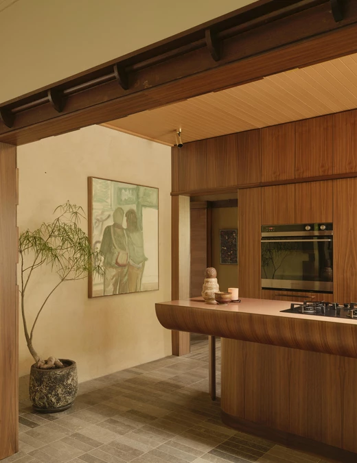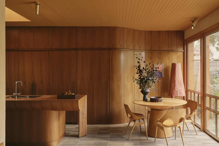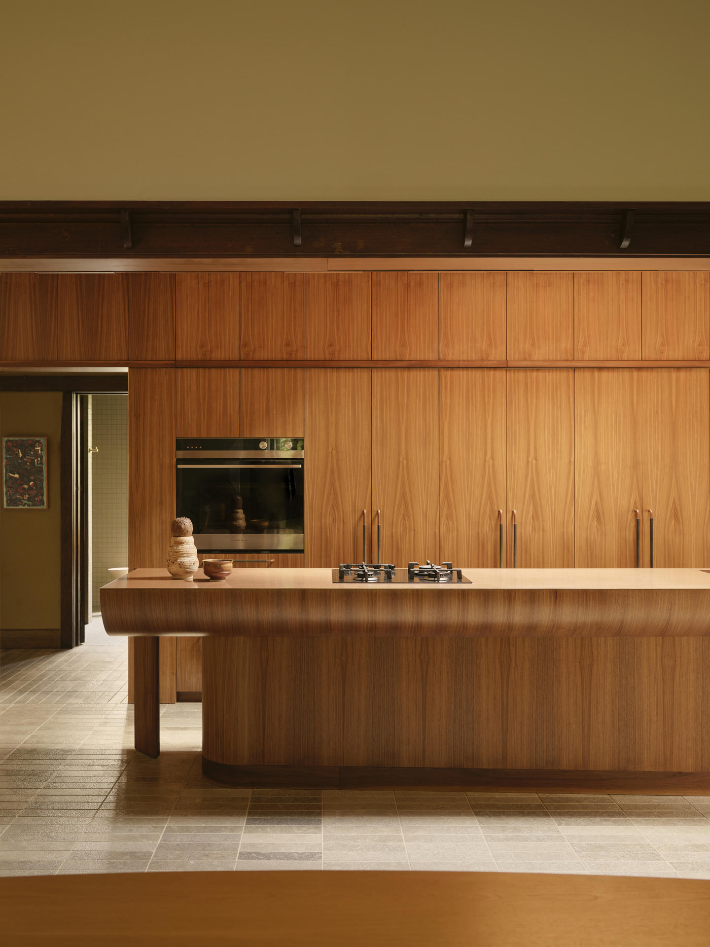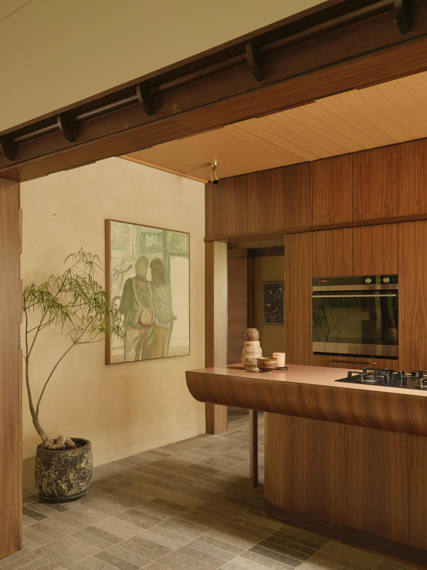 Wyspa kuchenna stała się jedną z najbardziej wyrazistych interwencji w całym projekcie. Była ona formalnym eksperymentem powstałym we współpracy z mistrzem stolarskim Guyem Phelanem. Każdą krzywiznę i detal dopracowano z wyjątkową precyzją, a szczególnej uwagi wymagało miejsce, w którym kamienny blat spotyka się z orzechowym drewnem. Zwykle jest to wrażliwy punkt, dlatego chroni go cienka, płaska listwa z mosiądzu, starannie wkomponowana pomiędzy oba materiały.
