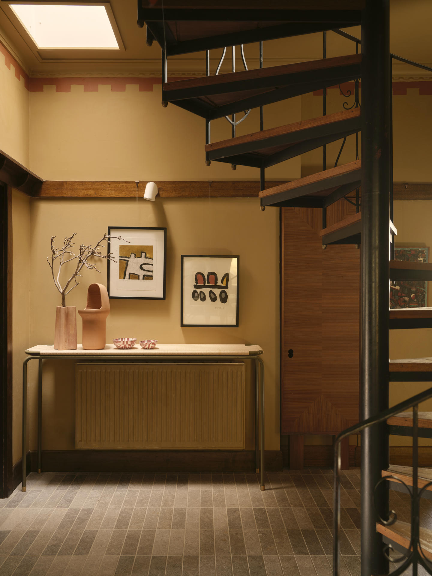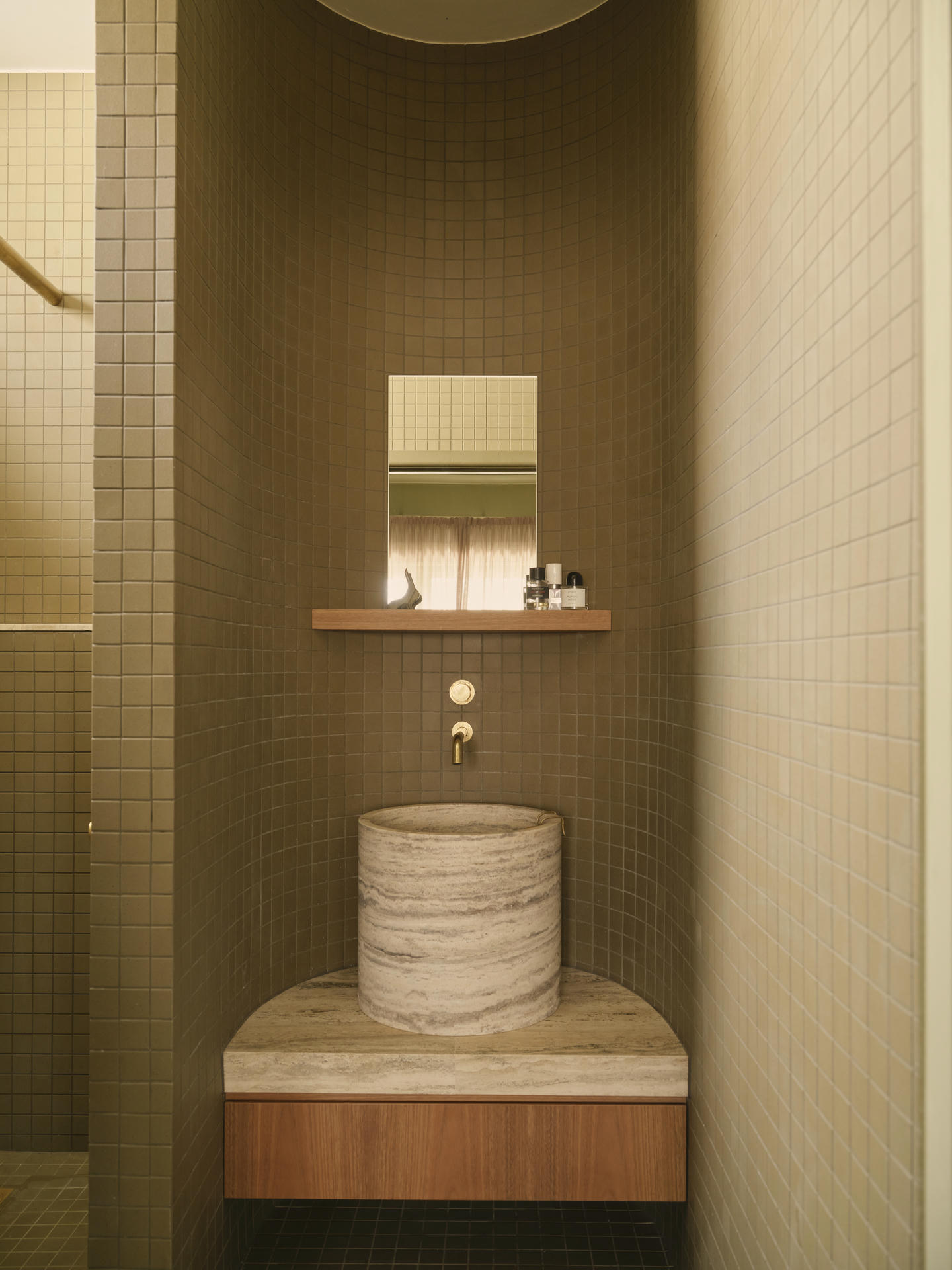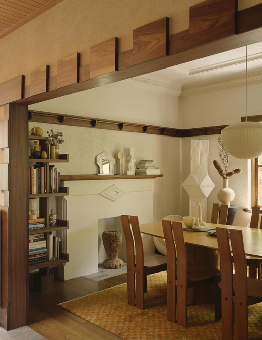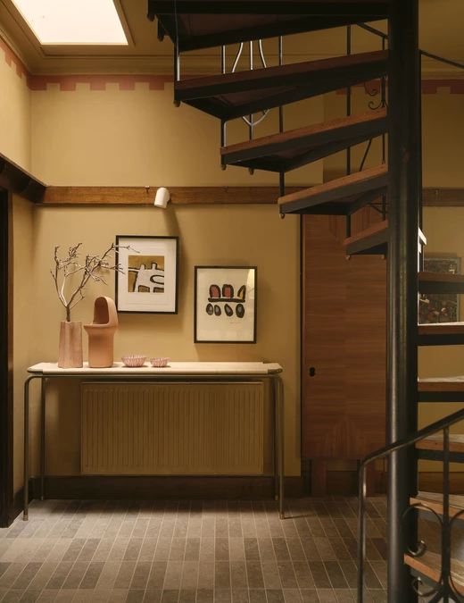 Wyspa kuchenna stała się jedną z najbardziej wyrazistych interwencji w całym projekcie. Była ona formalnym eksperymentem powstałym we współpracy z mistrzem stolarskim Guyem Phelanem. Każdą krzywiznę i detal dopracowano z wyjątkową precyzją, a szczególnej uwagi wymagało miejsce, w którym kamienny blat spotyka się z orzechowym drewnem. Zwykle jest to wrażliwy punkt, dlatego chroni go cienka, płaska listwa z mosiądzu, starannie wkomponowana pomiędzy oba materiały.