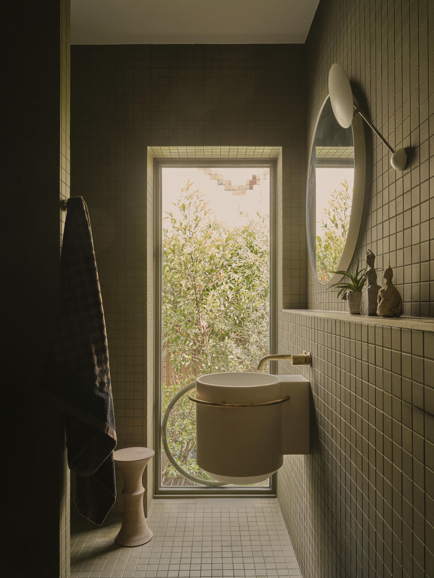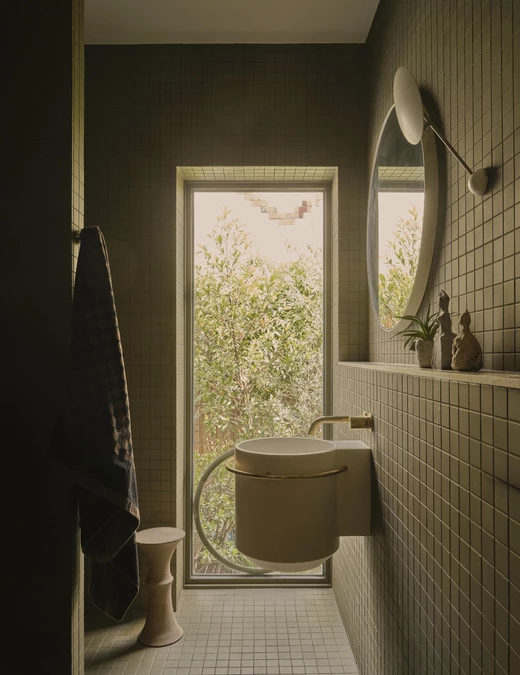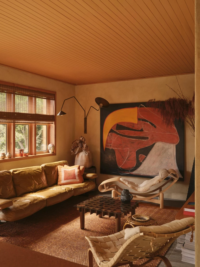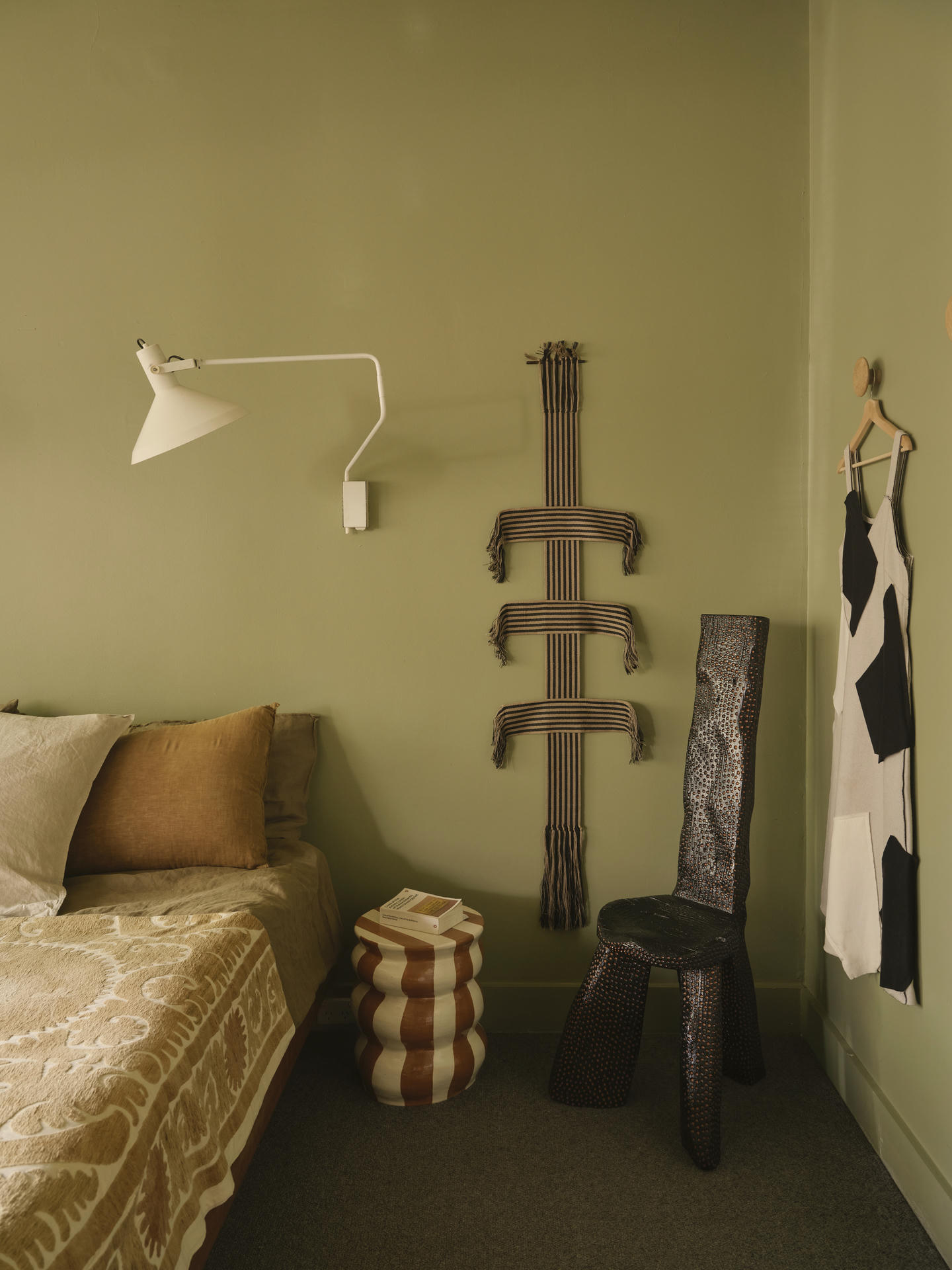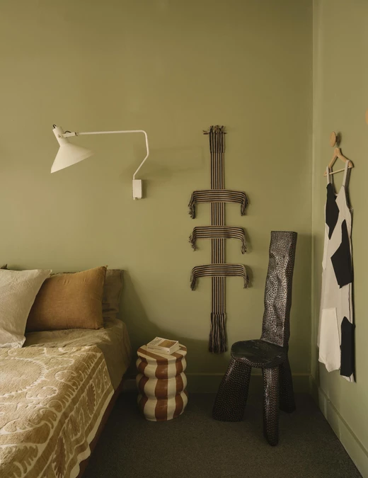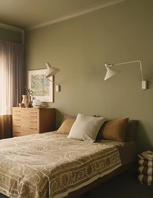 Architektka wzbogaciła przestrzeń sypialni o prace australijskich twórców i artystów. Starannie dobrane tekstylia, rzemieślnicze detale i ręcznie wykonane elementy wyposażenia nadały wnętrzu miękkości oraz wyciszającej atmosfery, tworząc harmonijną, osobistą przestrzeń.
