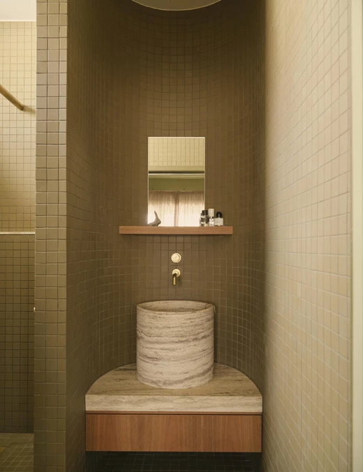 Blat kuchenny wykonano z terrazzo Artedomus – unikatowego z lat 90. – a na podłodze ułożono egipski wapień w dekoracyjnym, fakturalnym układzie. Detale z ciemnego drewna korespondują z oryginalną stolarką, tworząc wyważony dialog między dawnym a współczesnym.