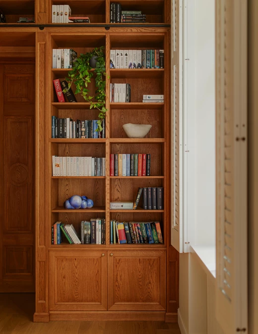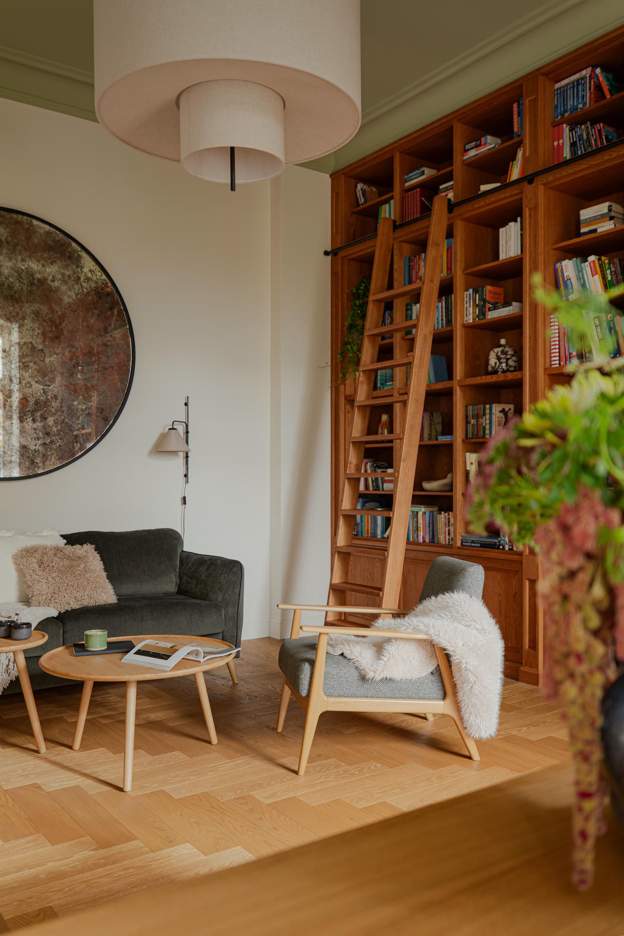 Następnie zaprojektowano od podstaw, w najdrobniejszych detalach, wybrane elementy wyposażenia. W taki sposób powstał autorski barek, który stał się punktem wyjścia do indywidualnych projektów pozostałych mebli w salonie. Starannie opracowano również zabudowę biblioteki oraz schody.