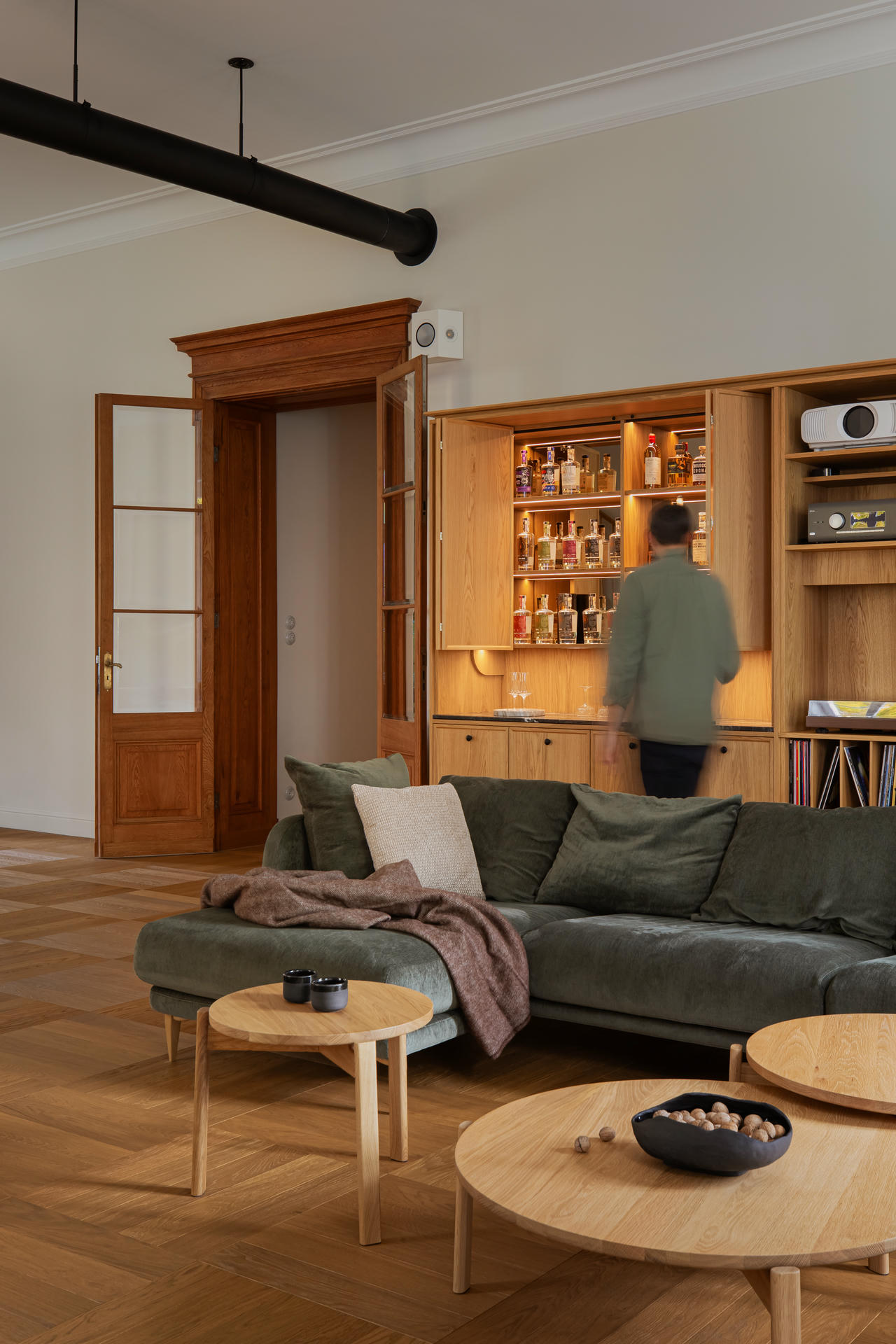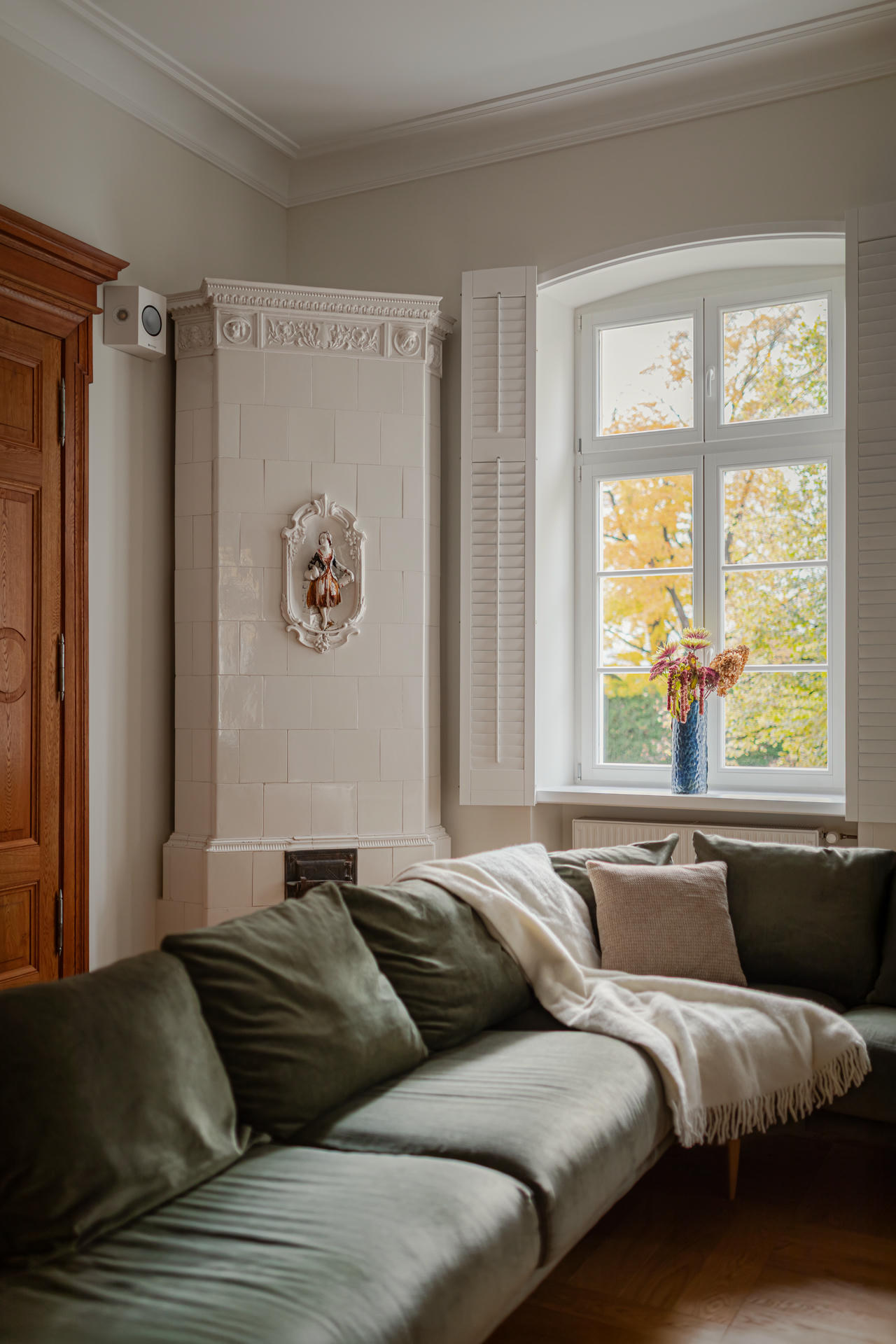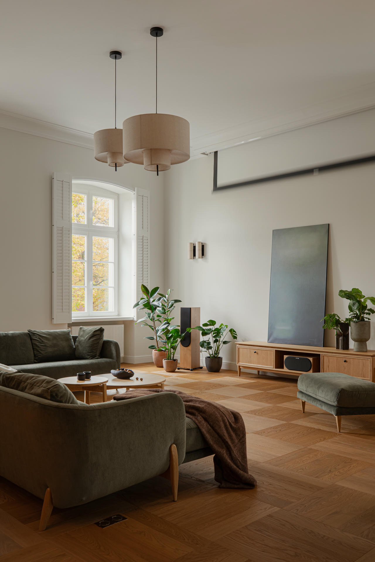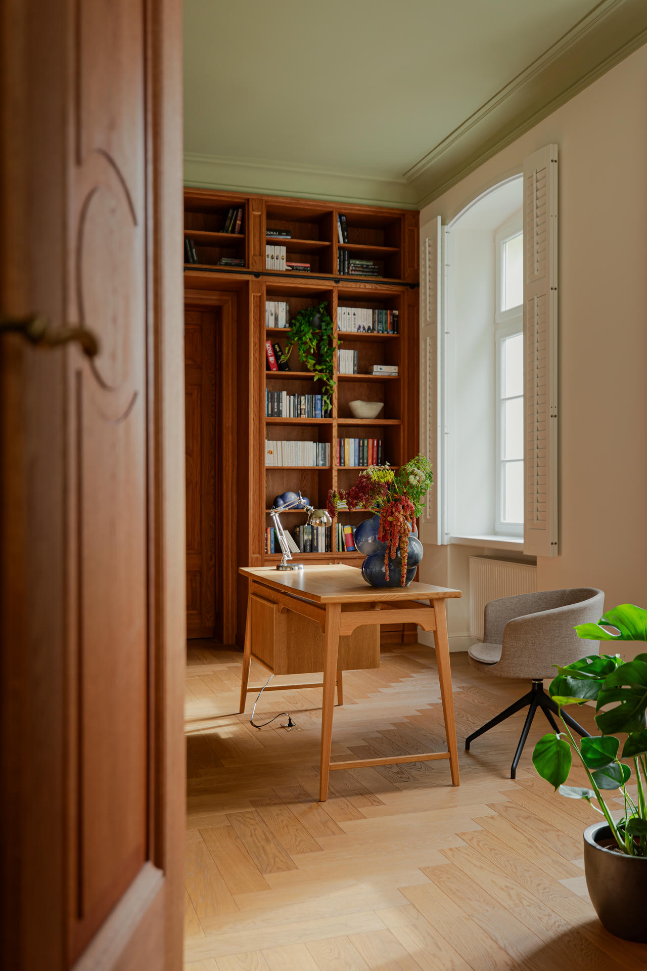 Klienci pragnęli przestrzeni przytulnej, funkcjonalnej, a zarazem eleganckiej oraz – co w kontekście tego wnętrza niezwykle istotne ze względu na lokalizację – szanującej historyczny charakter pałacu. Ważnym elementem projektu stała się też konieczność wkomponowania w nową aranżację oryginalnych, odrestaurowanych z inicjatywy gospodarzy drzwi wraz z portalami oraz pieca kaflowego.