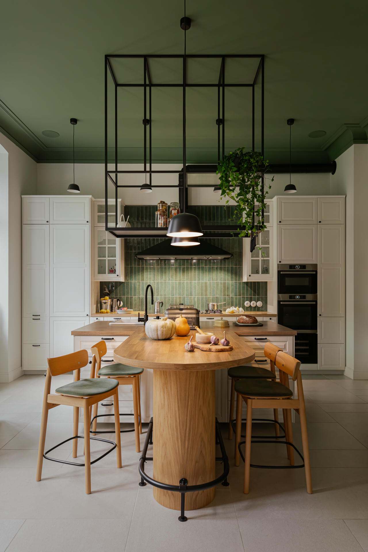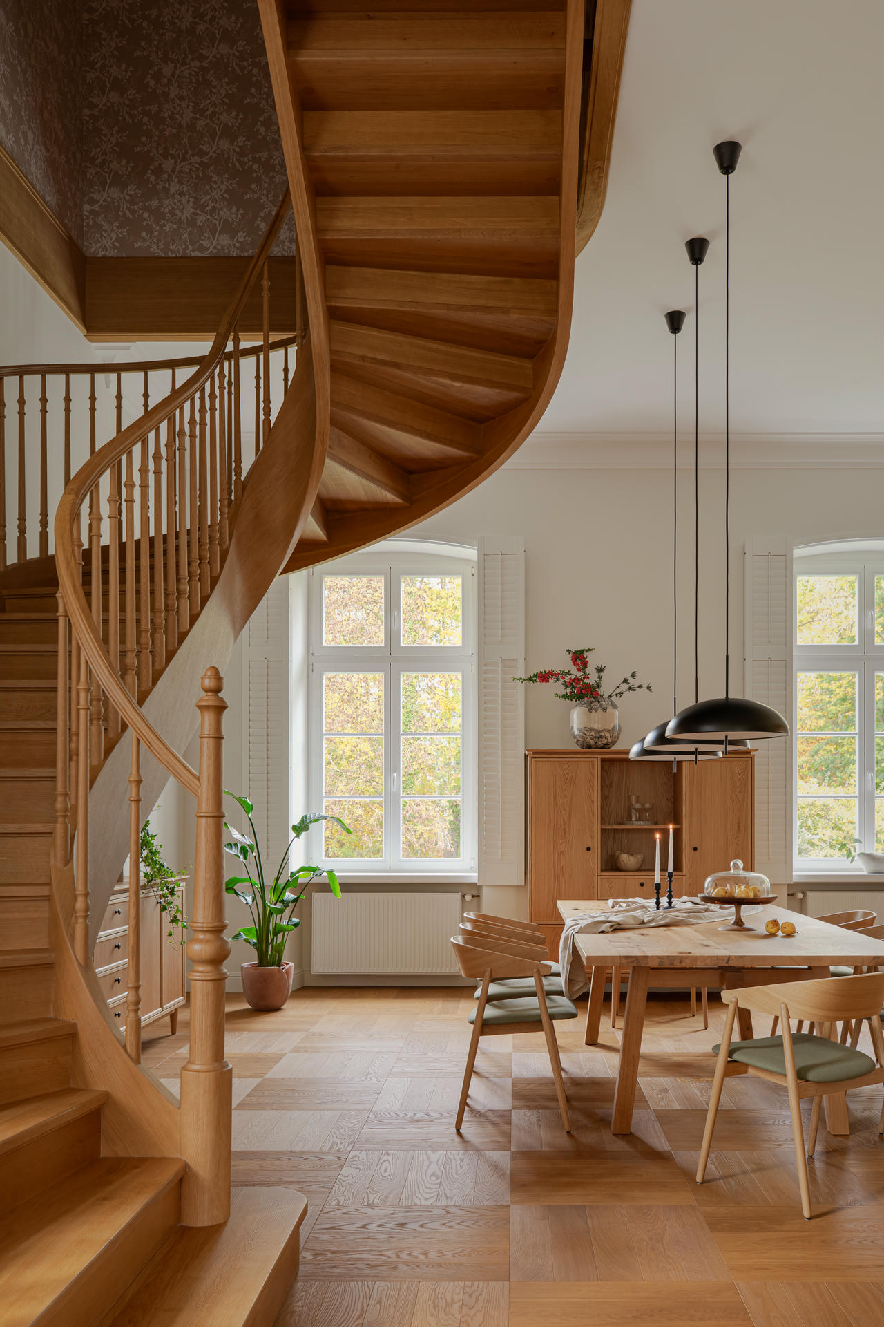 Wnętrze utrzymano w stylistyce modern classic z elementami modern farmhouse. „Połączyliśmy graficzne, ostre elementy charakterystyczne dla stylu klasycznego oraz obłości pojawiające się między innymi w liniach schodów, mebli wypoczynkowych czy krzeseł. Tym zabiegiem nadaliśmy wnętrzu wyrazistej szlachetności, która pozostaje w równowadze z atmosferą relaksu”. Pojawia się też duża ilość zieleni, ulubionego koloru klientów, zestawiona z drewnem i bielą.