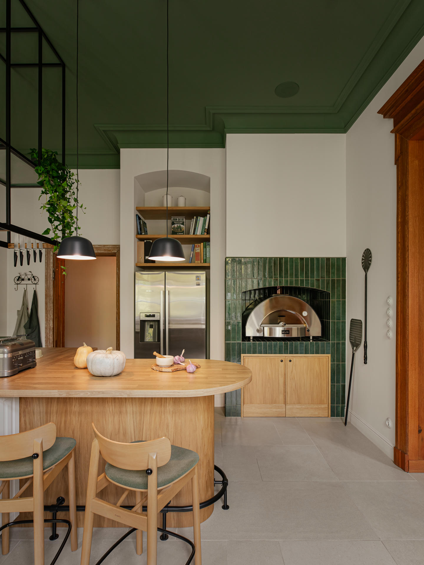 Jednak proces projektowy nie ograniczał się do warstwy estetycznej. Prace rozpoczęto od reorganizacji układu – zlikwidowano nieużywany sanitariat, dzięki czemu możliwe było powiększenie kuchni. Następnie wyznaczono miejsce dla istotnych elementów, takich jak piec do pizzy, kominek, kino domowe, schody czy biblioteka. To one w dużej mierze określiły dalsze decyzje aranżacyjne.