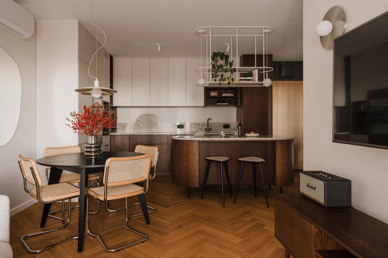 Serce mieszkania tworzą salon z kuchnią oraz owalna wyspa, gdzie odbywają się wszystkie spotkania towarzyskie mieszkańców. Poruszanie się w tej przestrzeni jest wygodne dzięki okrężnej komunikacji. Wisząca, metalowa półka akcentuje przestrzeń wokół wyspy kuchennej. Lustro przy stole w jadalni odbija światło lampy, wizualnie powiększając tę strefę oraz odciągając wzrok od klimatyzacji, która znajduje się zaraz nad nim. Obok znajduje się jasna sofa i stolik kawowy, którego blat został odzyskany ze starego mebla i docięty na kształt nowego. Narożnik razem z obrazem i wertykalną lampą zamykają optycznie pomieszczenie.