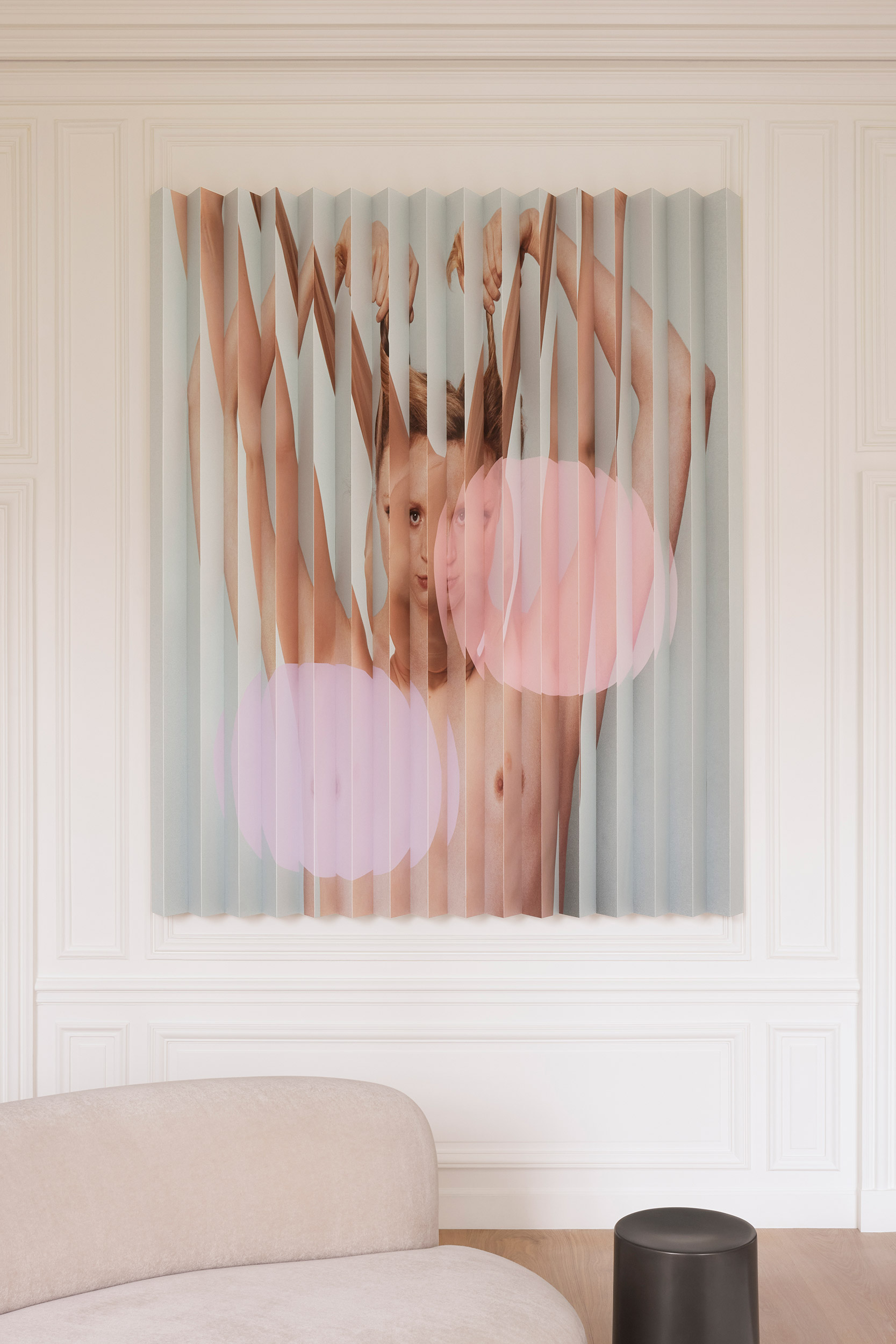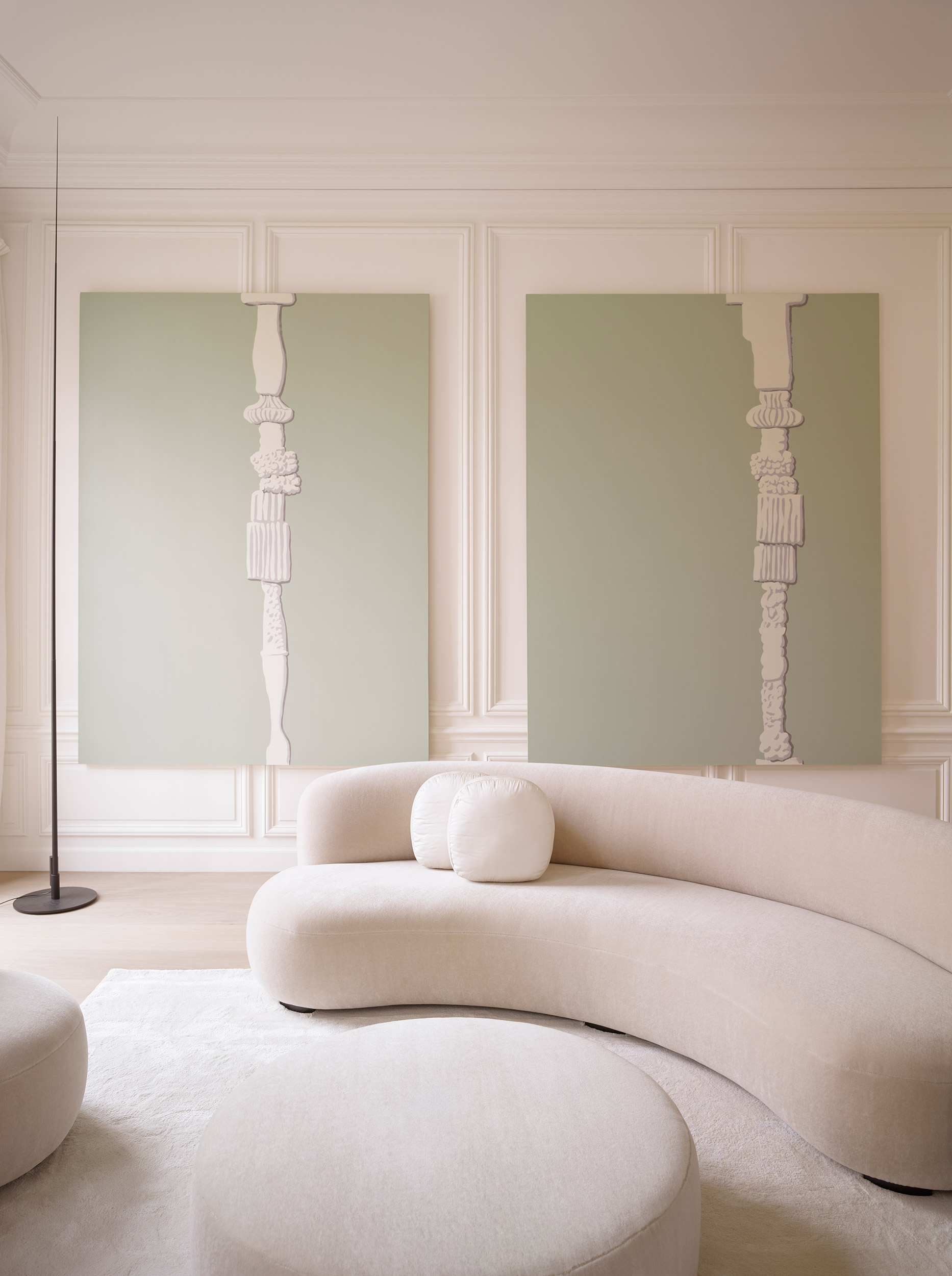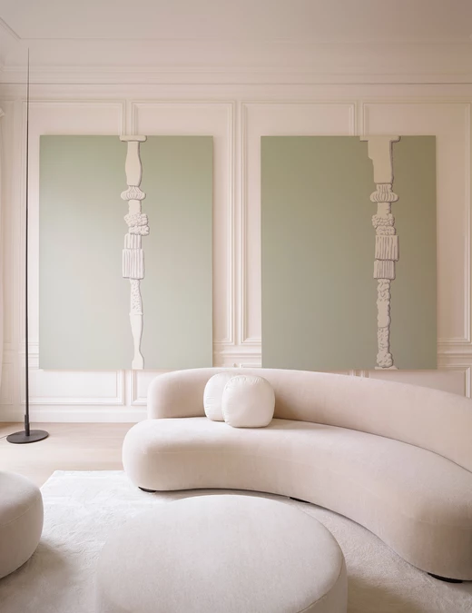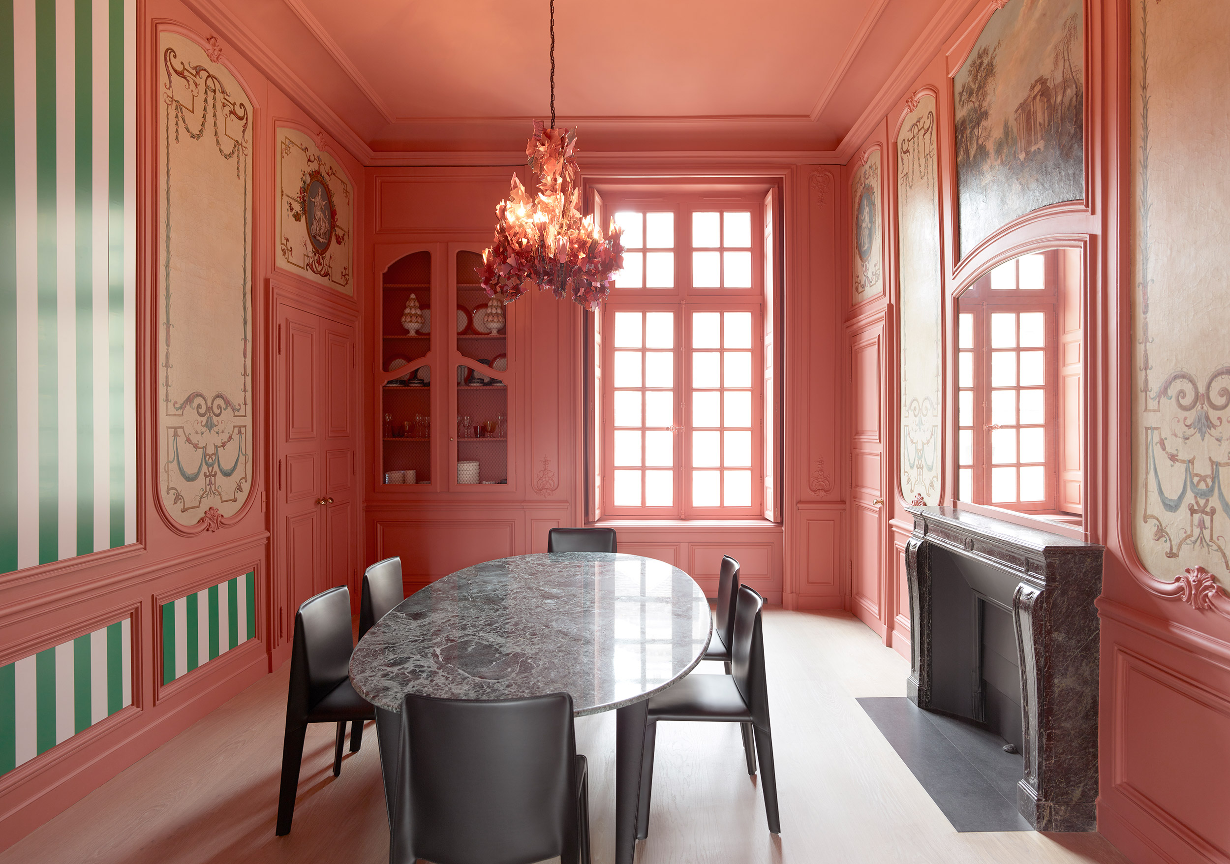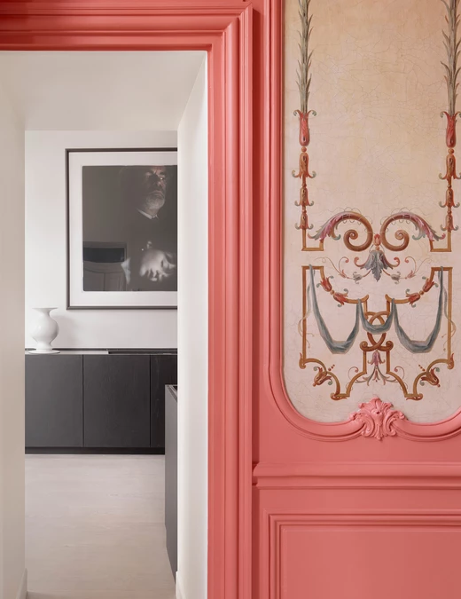 Formalna jadalnia to centralny punkt apartamentu. Z tego pomieszczenia rozchodzą się foyer, kuchnia i salon. Utrzymana w odcieniach łososia kolorystyka została zainspirowana barokowymi groteskami zdobiącymi oryginalne panele i sztukaterie. Nad stołem zawieszono autorski żyrandol Nathalie Ziegler Pasqua, który potęguje wrażenie elegancji i podkreśla teatralność przestrzeni.
