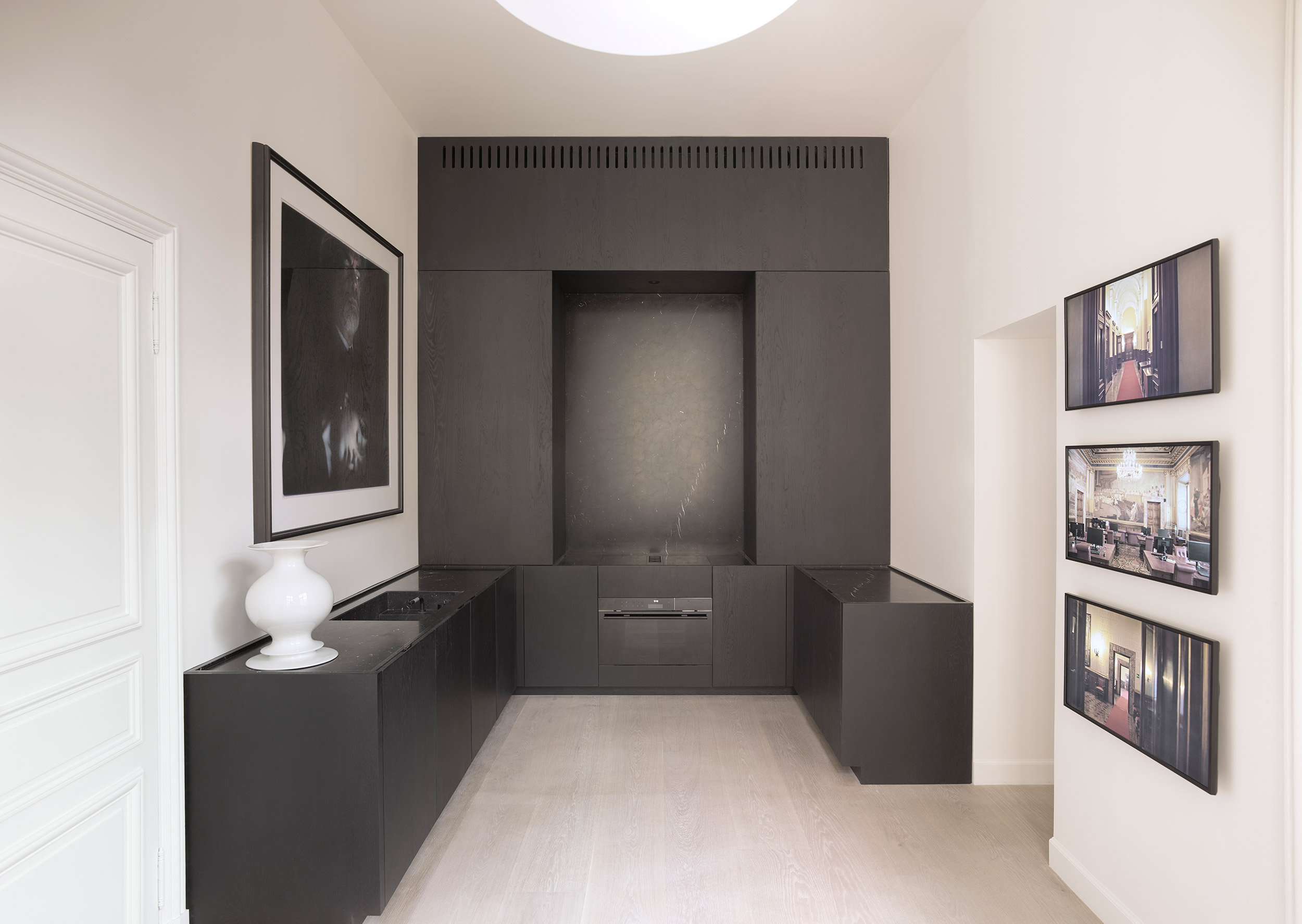 Kuchnia stanowi najbardziej współczesny akcent projektu. Jest utrzymana w czarnym drewnie i marmurze o geometrycznej, niemal rzeźbiarskiej formie. Zintegrowane urządzenia i ukryte detale nadają jej minimalistyczny charakter, a centralna nisza tworzy wyważoną, symetryczną kompozycję. W przestrzeni znalazło się także miejsce na drugą, niewielką jadalnię oraz dzieła sztuki.
