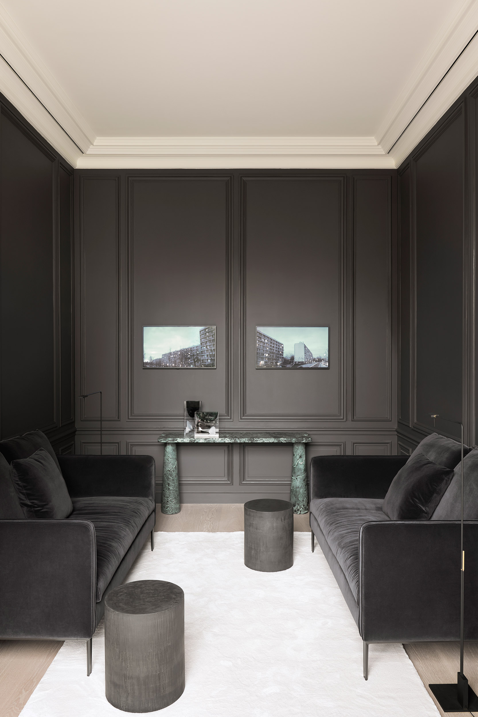 Gabinet, utrzymany w ciemnych odcieniach antracytu, pełni rolę pomieszczenia przejściowego między częścią dzienną a prywatną. Kameralny nastrój zapewnia wytchnienie i intymność, a jednocześnie jawi się jako elegancka strefa relaksu.