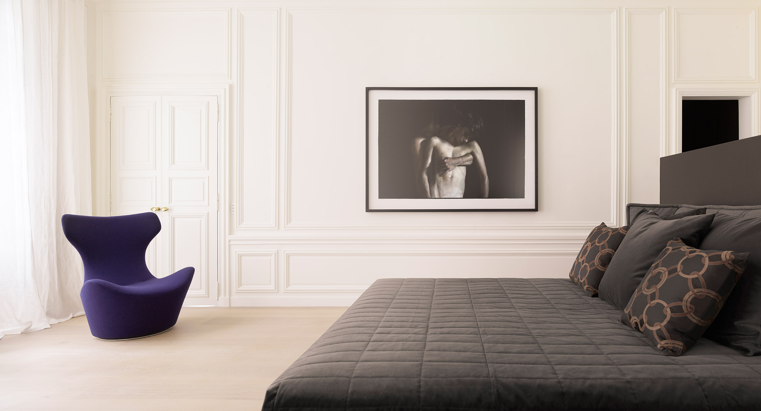 W sypialni głównej to łóżko, umieszczone centralnie, wyznacza oś przestrzeni, tym samym tworząc wrażenie eleganckiej monumentalności.