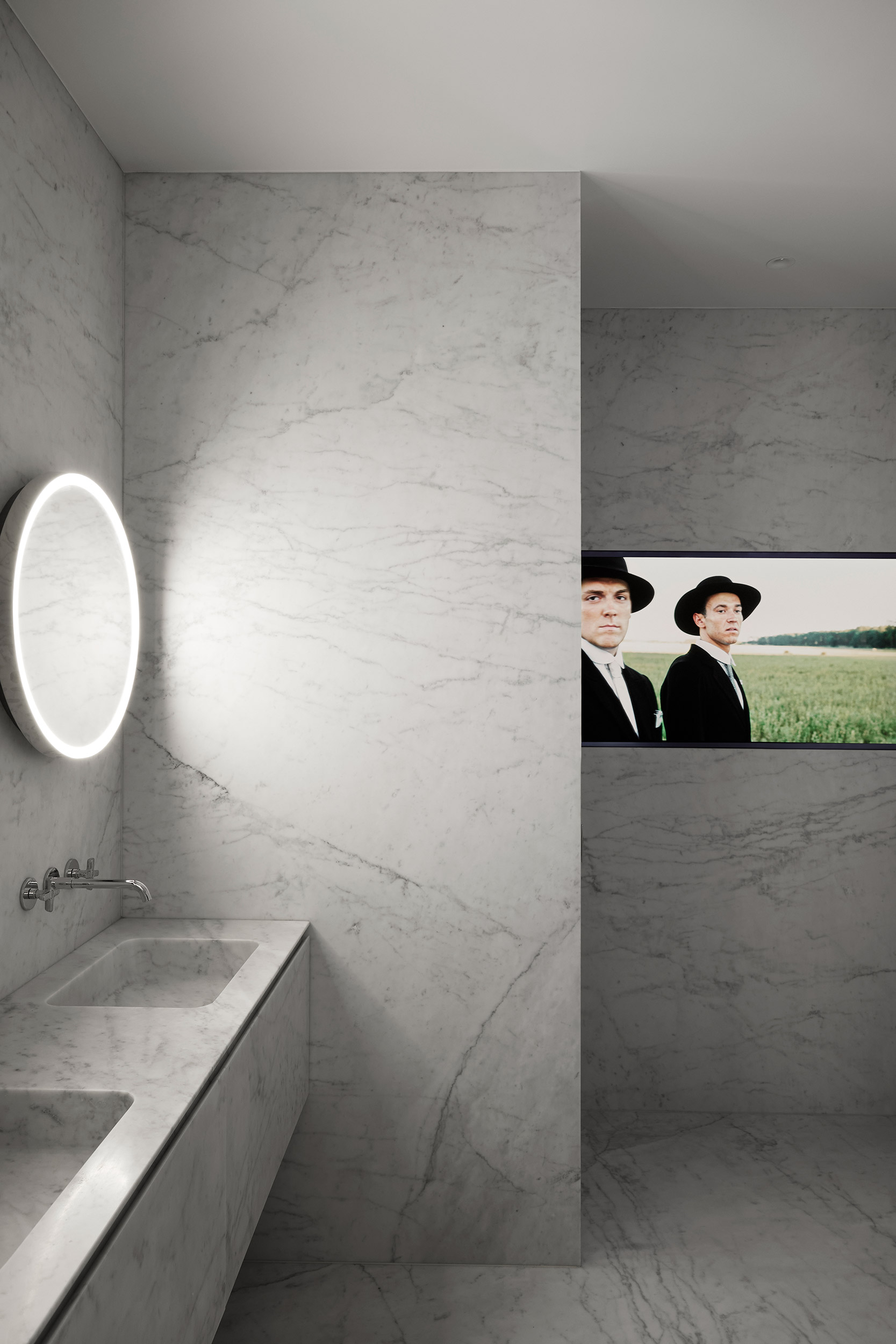 Przylegająca do sypialni łazienka została wykończona ultracienkimi płytami białego marmuru osadzonymi na aluminiowym rdzeniu – lekkim, a zarazem niezwykle trwałym materiale, idealnym do zabytkowych struktur o ograniczonej nośności.