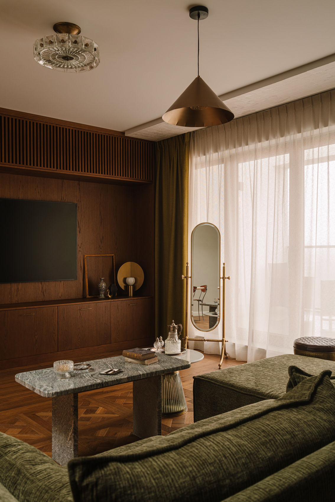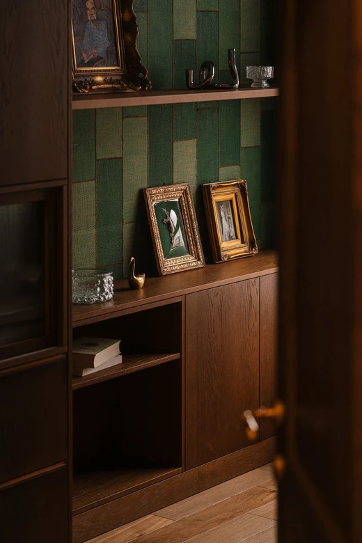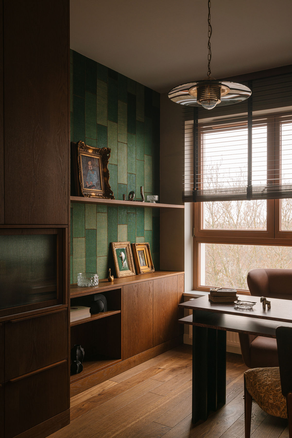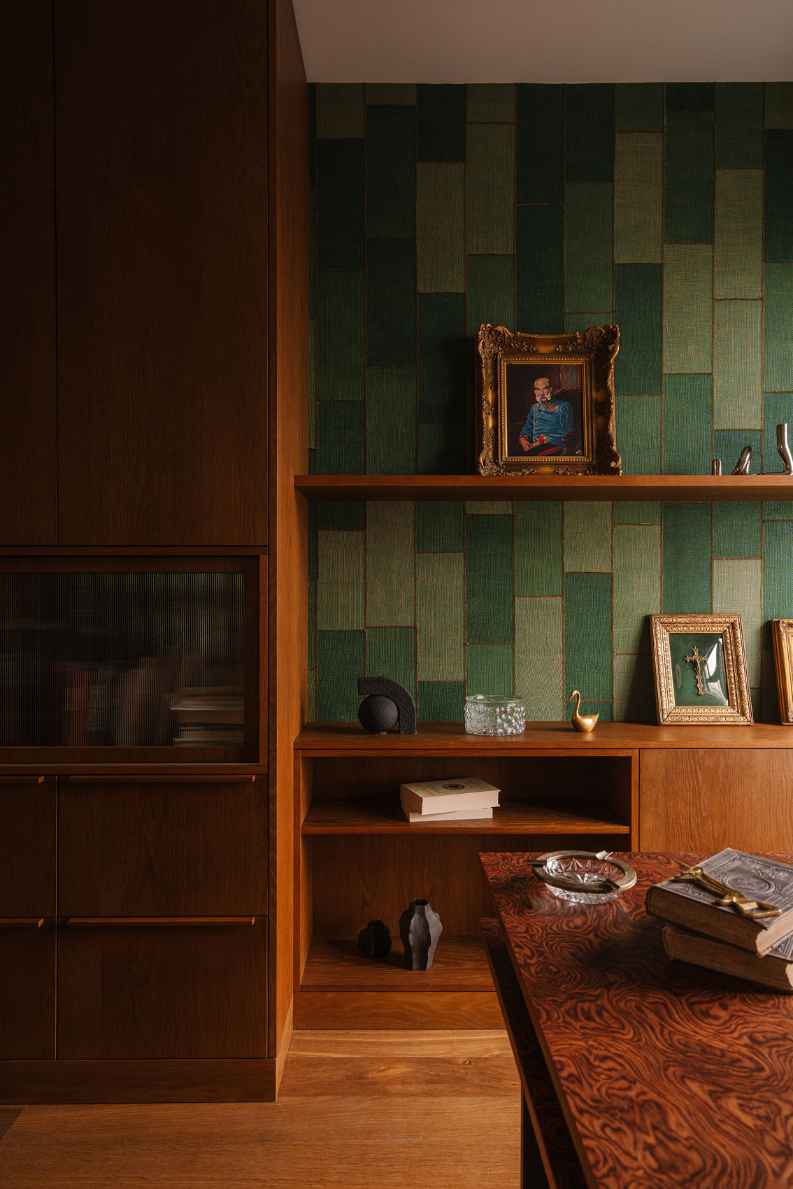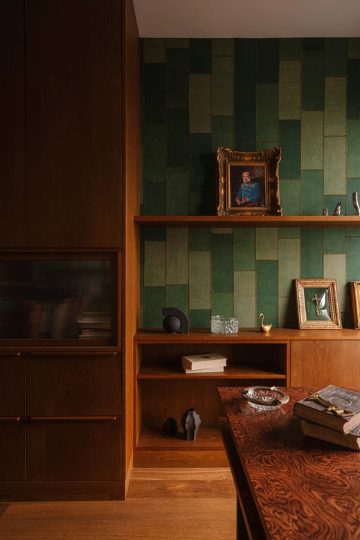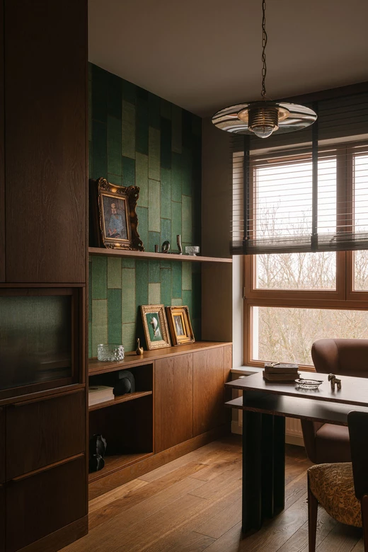 Gabinet został zachowany w klimacie całego mieszkania – zielona tapeta dająca efekt tkaniny, zabudowa z ciepłego forniru, ściana z postarzanych luster oraz biurko z ciekawym rysunkiem drewna firmy Tamo Design.