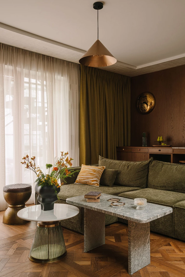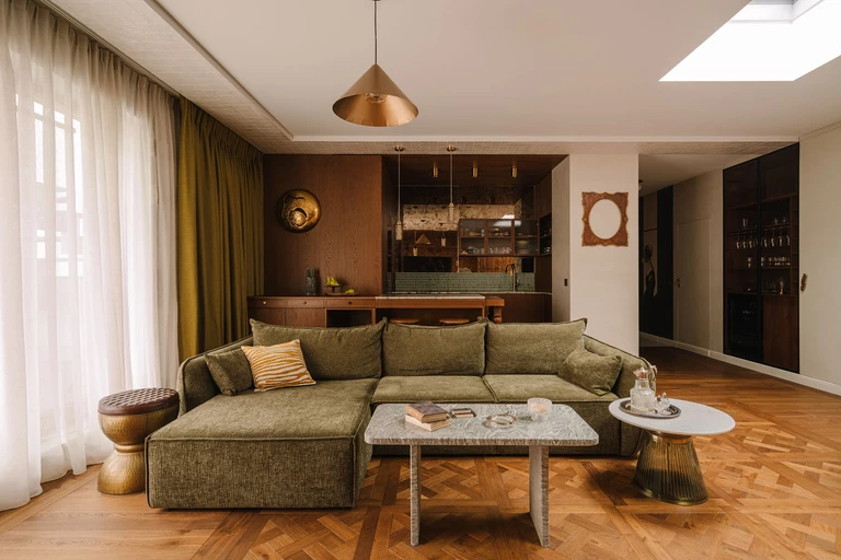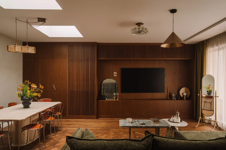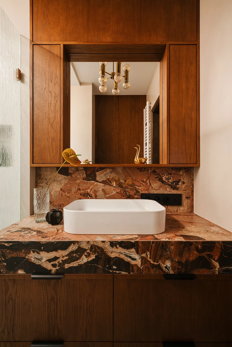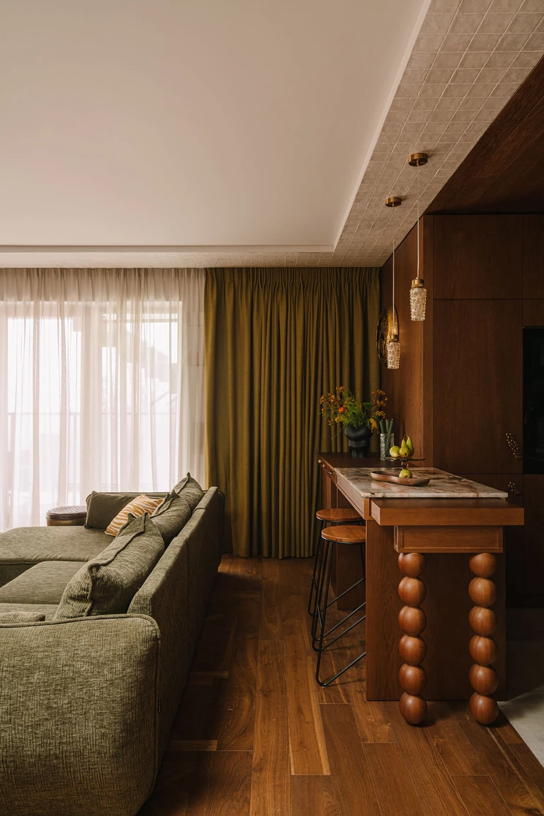 We wnętrzu króluje ciepłe, ciemne drewno – widoczne w meblach wykonanych na zamówienie ze szczotkowanego, barwionego forniru, na podłodze w formie dekoracyjnych kasetonów w salonie, a także na suficie nad aneksem kuchennym. Obok drewna pojawia się mikrocement otulający swoimi strukturami, kamienny blat kuchenny z ciekawym wzorem, płytki w przeróżnych kolorach i wielkościach oraz rzucające się w oczy tapety.