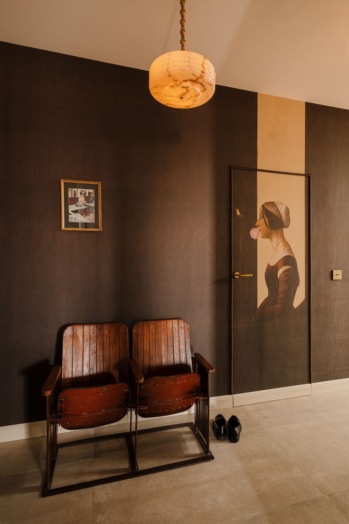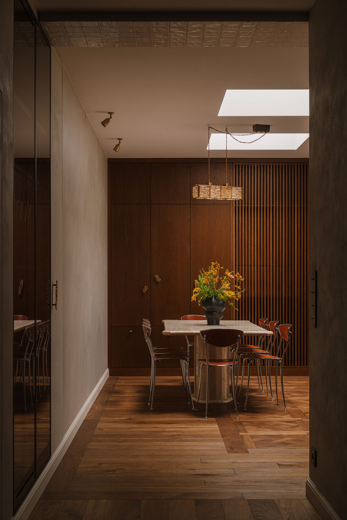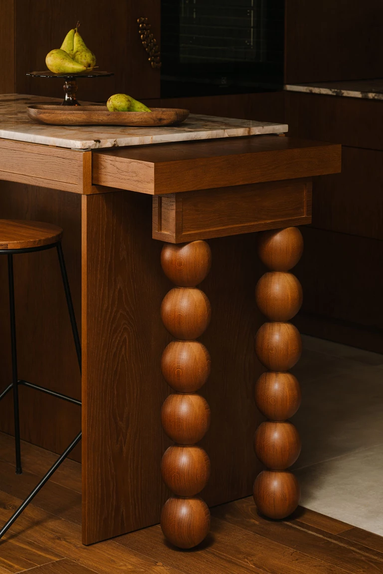 We wnętrzu króluje ciepłe, ciemne drewno – widoczne w meblach wykonanych na zamówienie ze szczotkowanego, barwionego forniru, na podłodze w formie dekoracyjnych kasetonów w salonie, a także na suficie nad aneksem kuchennym. Obok drewna pojawia się mikrocement otulający swoimi strukturami, kamienny blat kuchenny z ciekawym wzorem, płytki w przeróżnych kolorach i wielkościach oraz rzucające się w oczy tapety.