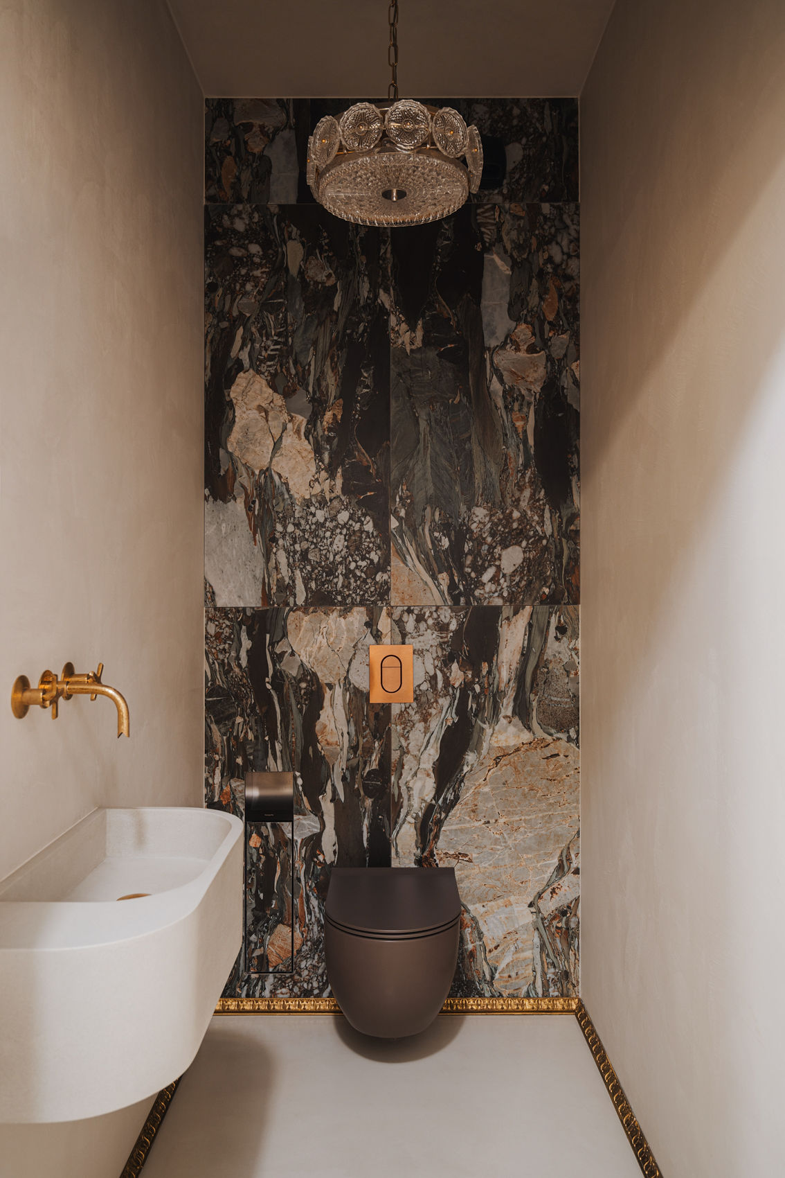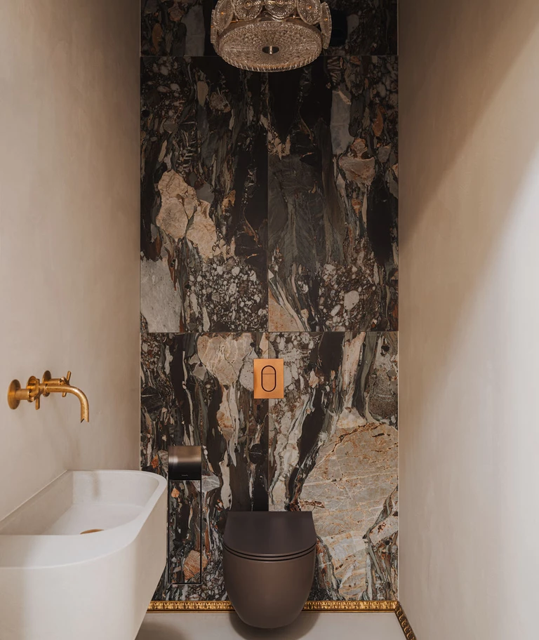 Z salonu ukryte drzwi wykończone w mikrocemencie prowadzą do małego WC dla gości. Pierwsze skrzypce gra tutaj zabudowa geberitu z płytek w mocnym, kamiennym wzorze, za którą ukryta jest szafka. Dookoła delikatne ściany w strukturze z mikrocementu, umywalka wykonana z betonu pod kolor ścian, wybijające się mosiężne dodatki oraz wisząca lampa Carla Fagerlunda.
