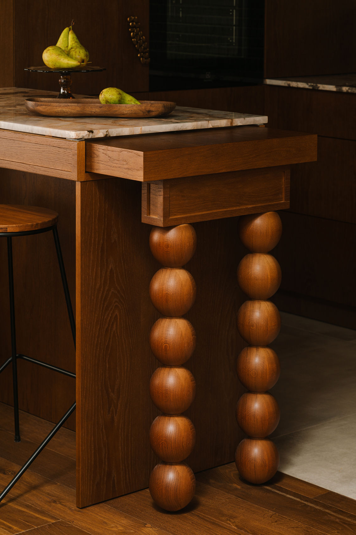 Kuchnia delikatnie wychodzi do salonu komodo-wyspą z wysuwnym blatem na zdobnej nodze, tworząc jednocześnie tło dla części wypoczynkowej.