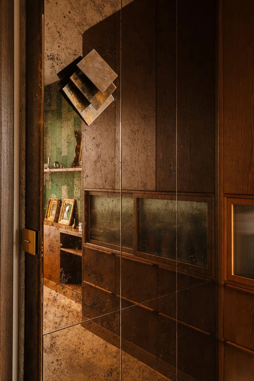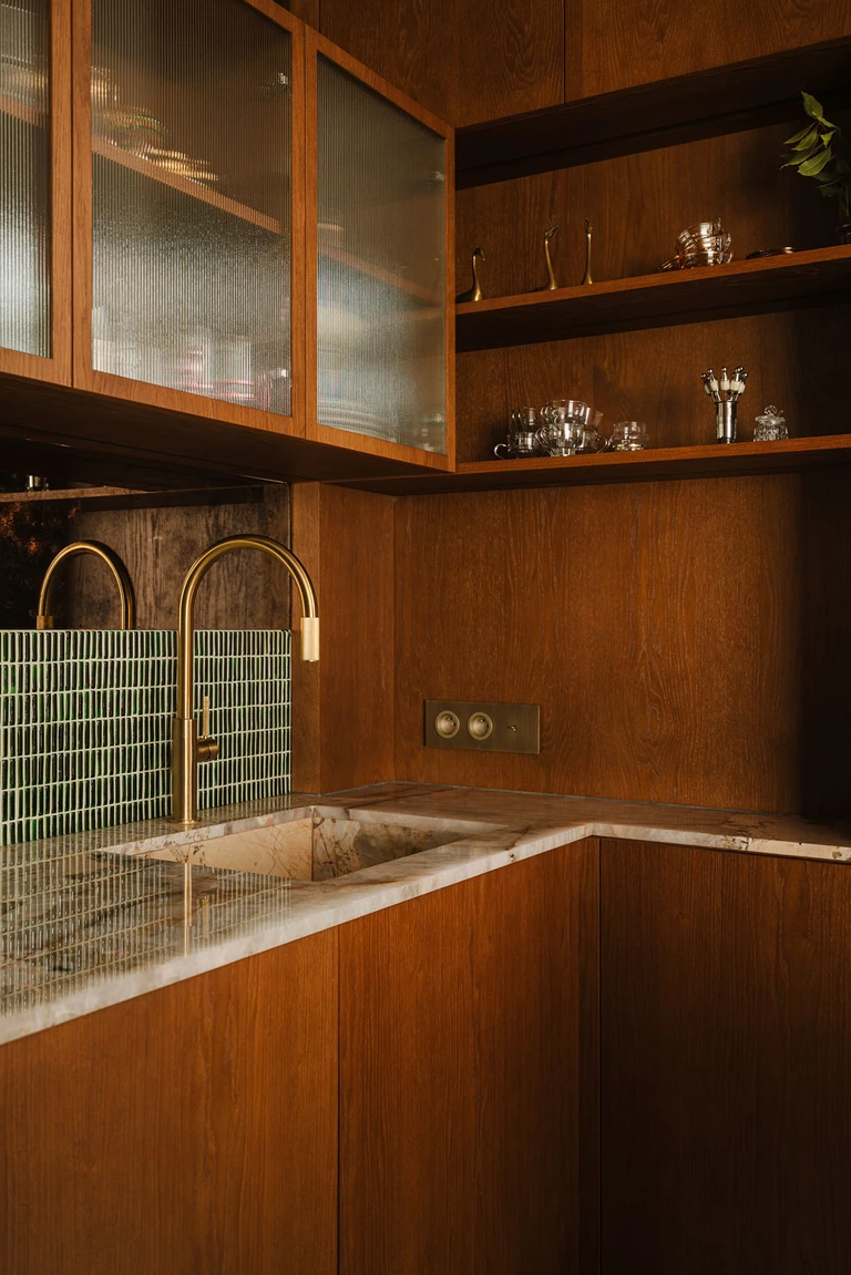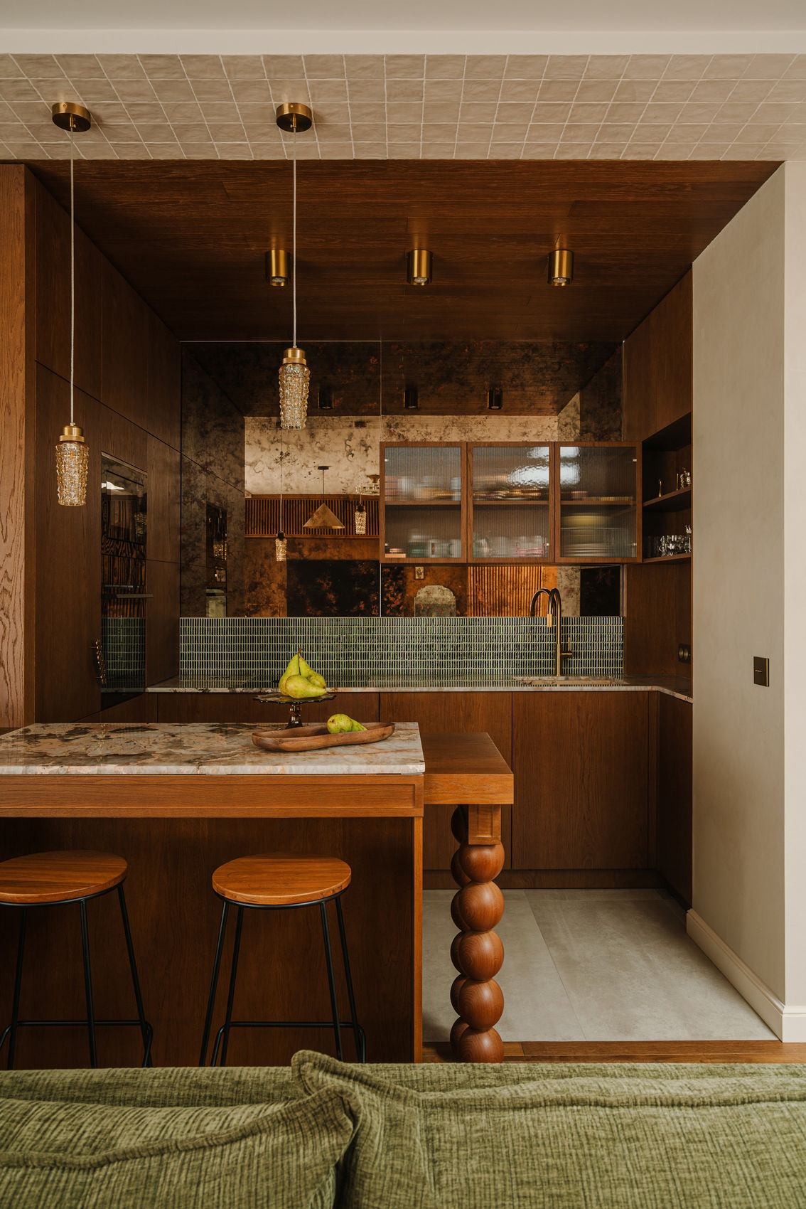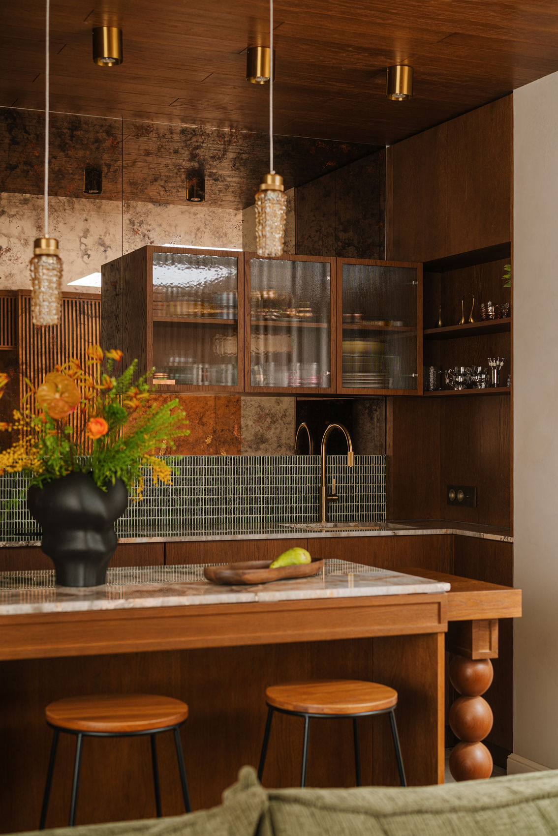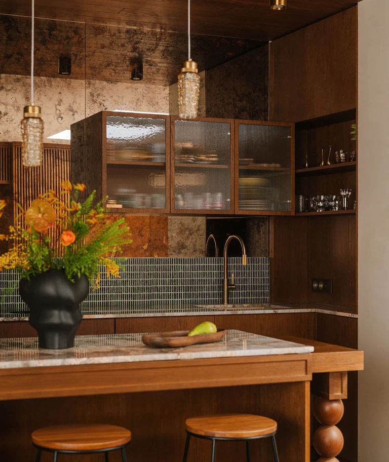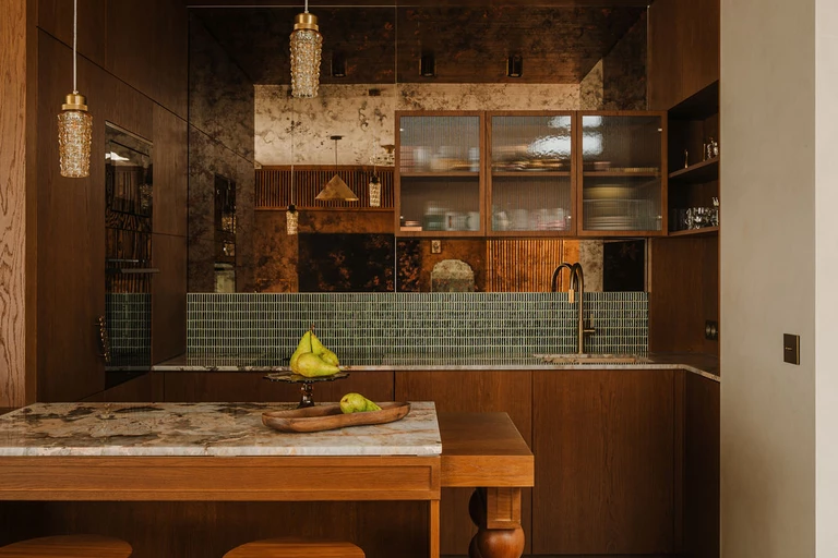 W kuchni postawiono na grę struktur – kamienny blat ze zlewozmywakiem, pas mozaiki z zielonych płytek, otulające drewno wchodzące na sufit oraz witryna ze szkłem ryflowanym, wisząca na ścianie wykończonej z postarzanych ręcznie, brązowych luster.