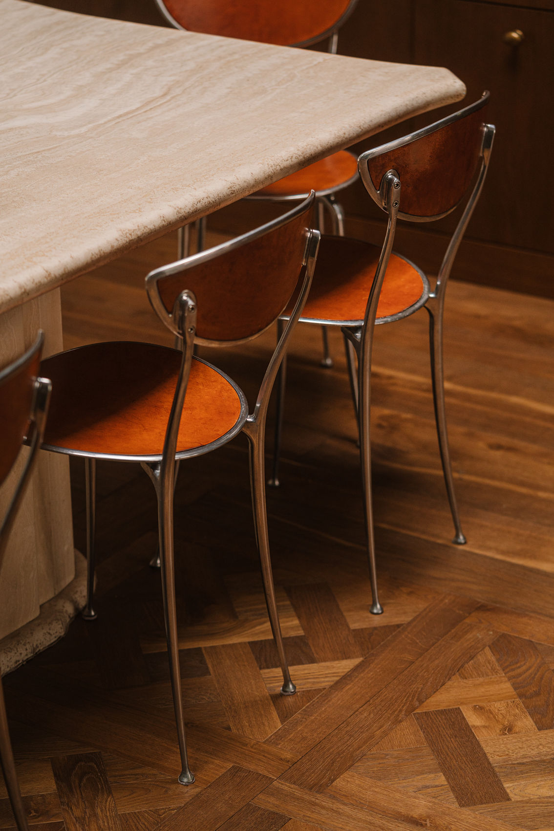 Lampy i stolik kawowy z kamienia to przepiękne znaleziska inwestorki, która uwielbia przedmioty z duszą i z drugiej ręki. Stół w jadalni to wyjątkowe znalezisko – w całości wykonany z trawertynu, stół z historią, a do niego krzesła wyszukane przez Krześlarza.