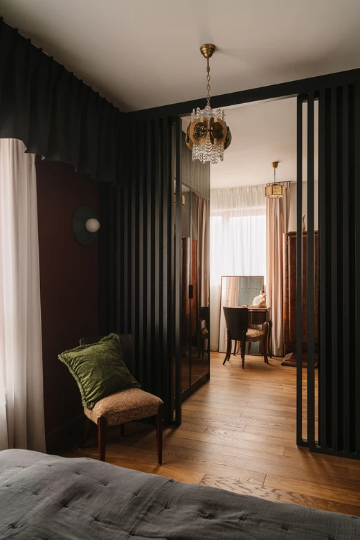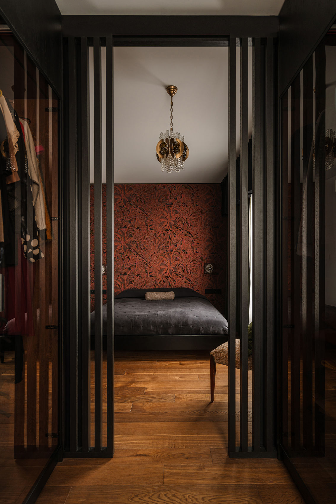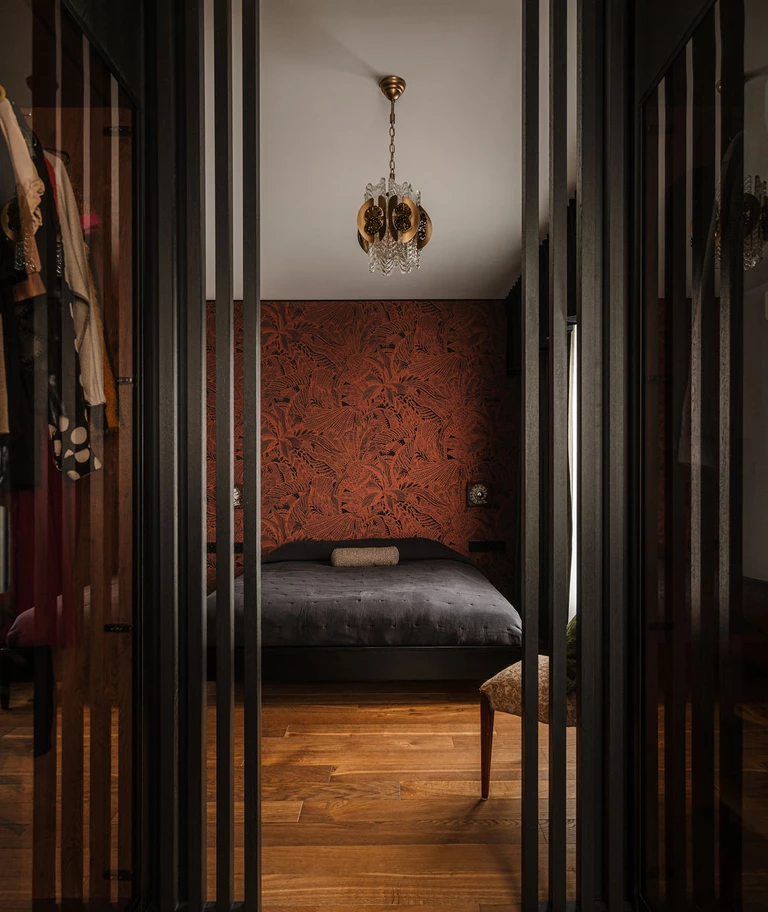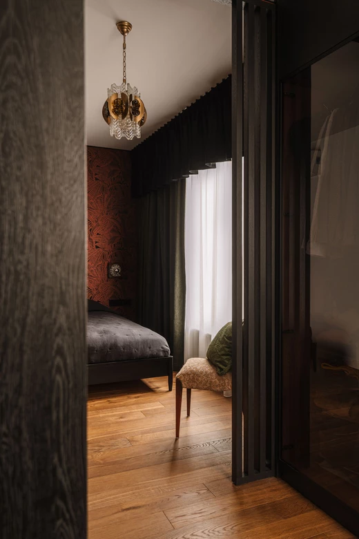 Sypialnia zanurzona jest w ciemnych kolorach – proste czarne łóżko na nóżkach, a wezgłowie stanowi wzorzysta tapeta. Za przesuwnymi drzwiami z czarnych lameli znajduje się garderoba, w której pierwsza rzuca się w oczy stara szafa znaleziona w internecie przez inwestorkę. Pozostałe zabudowy z przeszkleniami zostały wykonane na zamówienie.