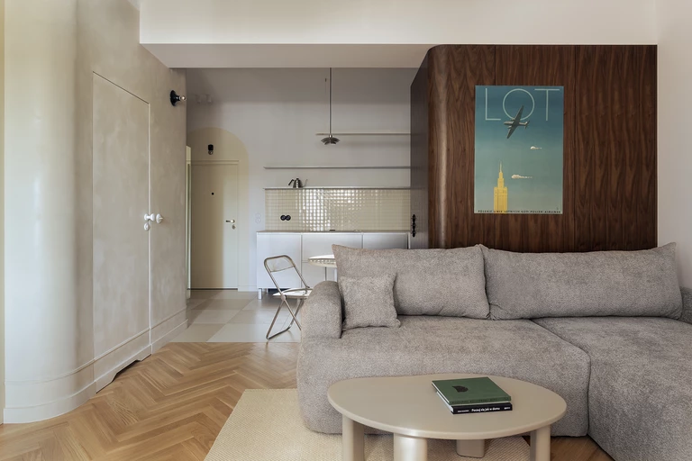 „Projekt miksuje ducha epoki PRL-u, jednocześnie wprowadzając nowoczesne rozwiązania, ale z zachowaniem charakteru miejsca i nawiązaniem do estetyki budynku oraz jego klatki schodowej” - tak o swojej ostatniej realizacji opowiada architektka Iza Koczanowska. Niewielką, wyposażoną w zaledwie jedno okno przestrzeń, udało jej się doświetlić i powiększyć dzięki kilku prostym zabiegom.