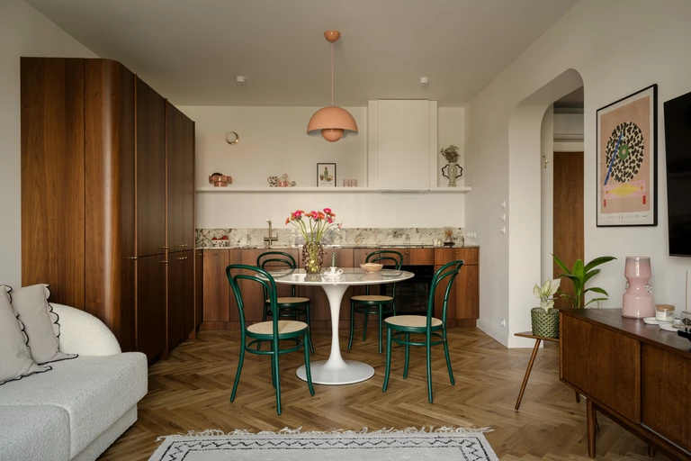 W strefie kuchni i salonu jasne barwy oraz surowy dębowy parkiet stanowią tło dla bardziej wyrazistych akcentów kolorystycznych. Dolna zabudowa, wykończona w ciemnym fornirze, harmonizuje z lekką, wiszącą częścią meblową. W centralnym punkcie przestrzeni znajduje się wysoka zabudowa, która ukrywa wszystkie funkcje kuchenne. W tej części mieszkania znalazły się także klasyczny stół Tulip oraz kultowe krzesła Fameg, których trawiaste odcienie wprowadzają do wnętrza świeżość.