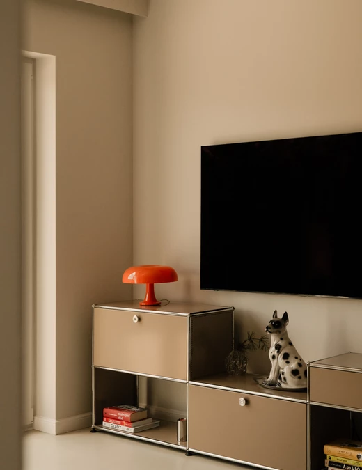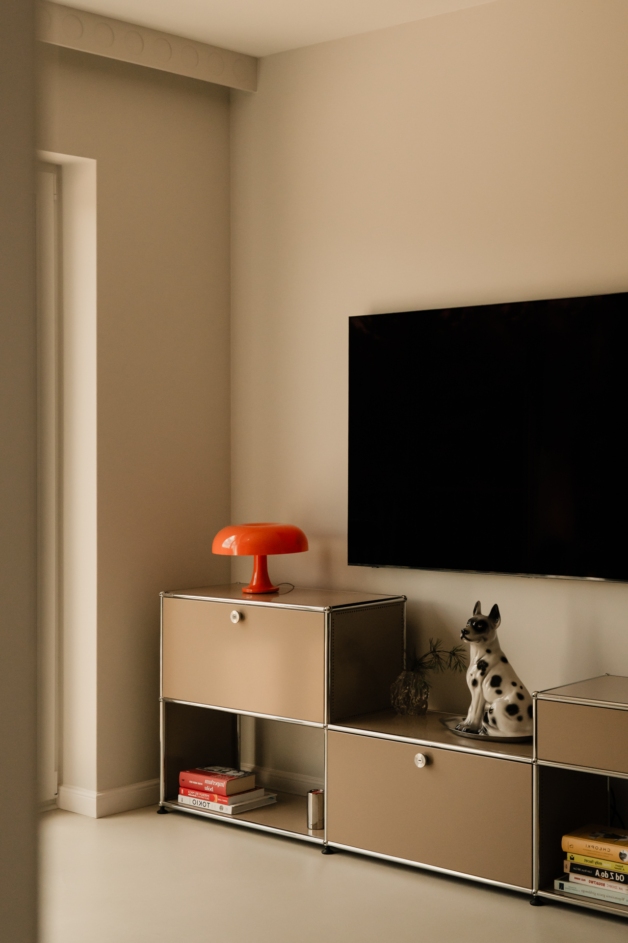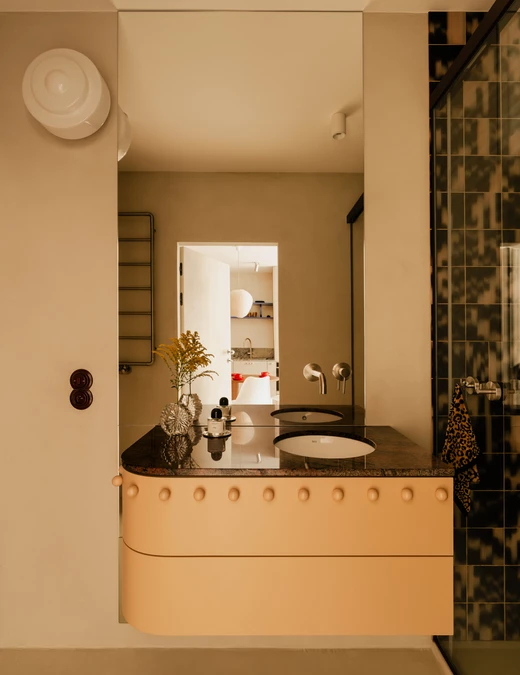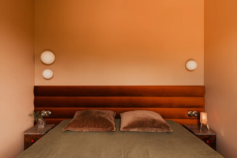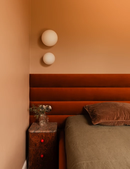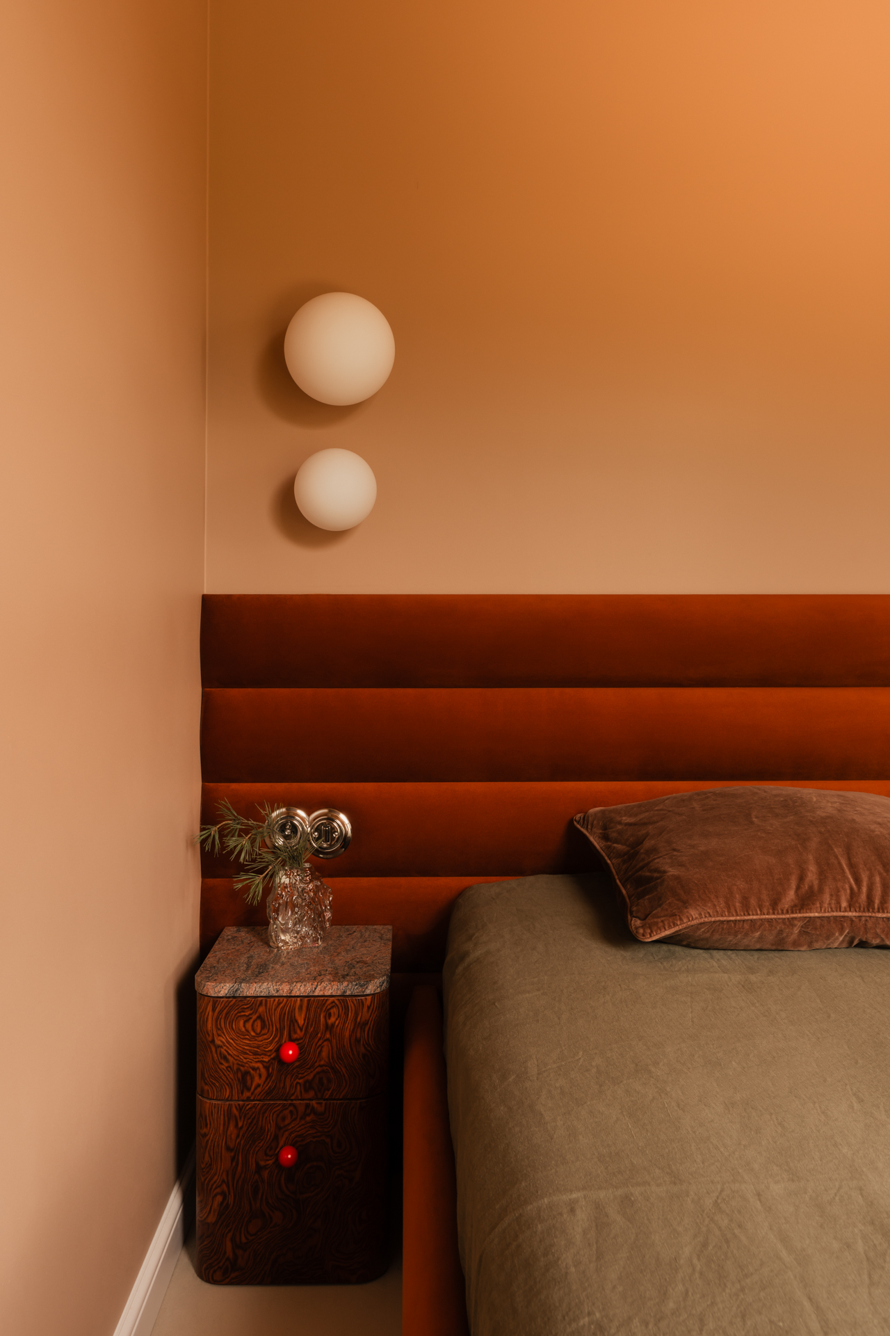 W łazience i sypialni projektantki postawiły na odważniejszą narrację. Połączenie pomarańczy i czerwieni tworzy energetyczny kontrapunkt wobec stonowanej części dziennej. Ten mały manifest kolorystyczny wyznacza granice między strefami funkcjonalnymi, ale jednocześnie spaja je we wspólnym języku formy i proporcji.