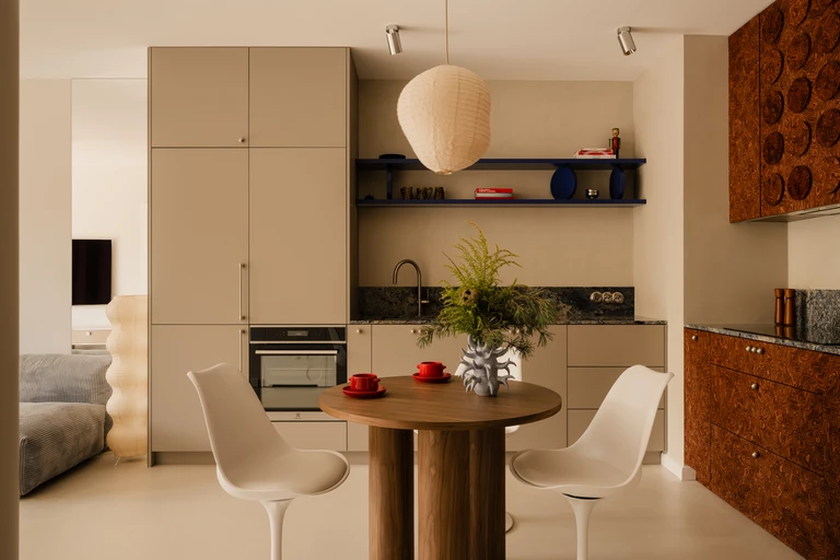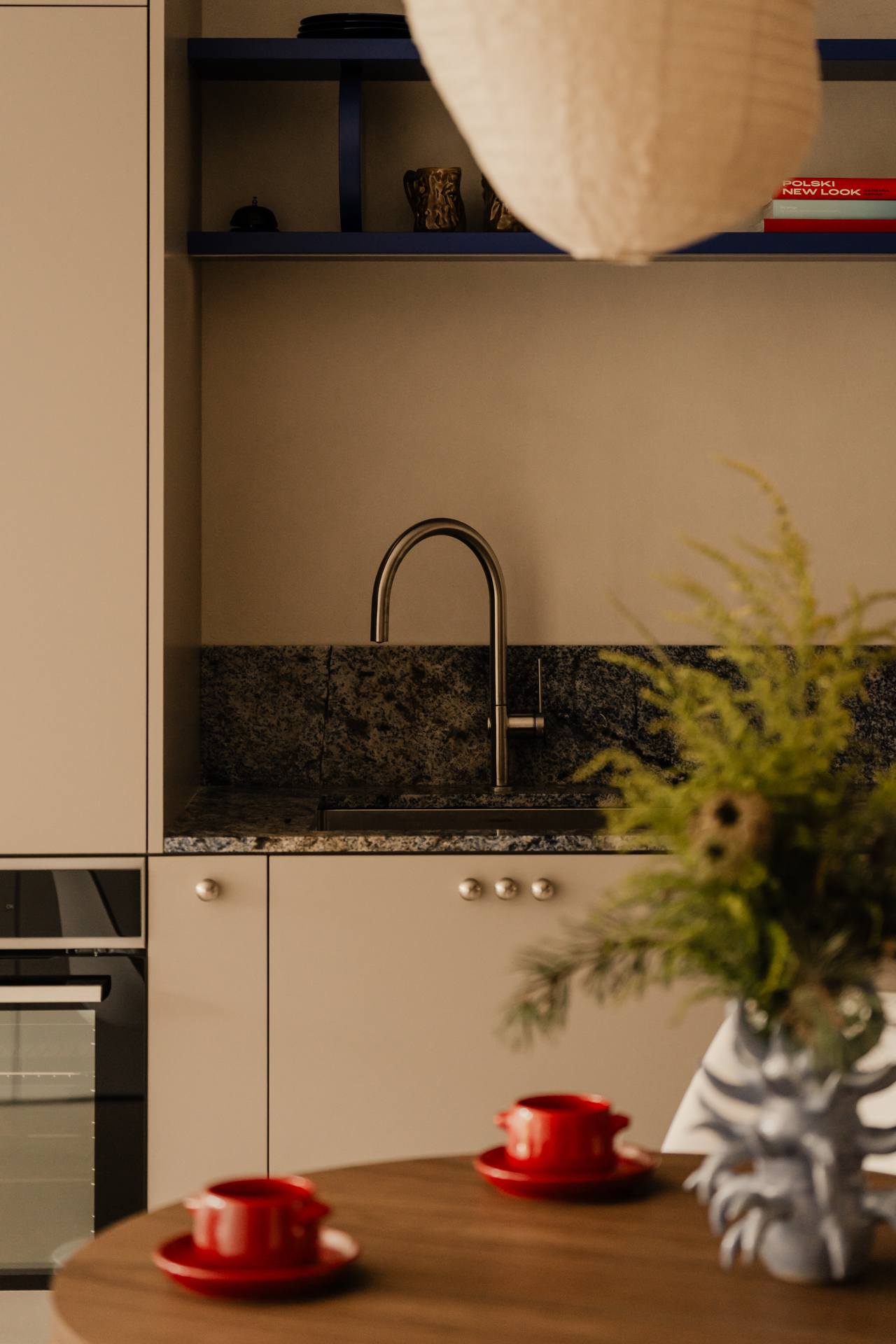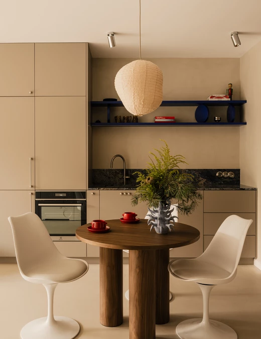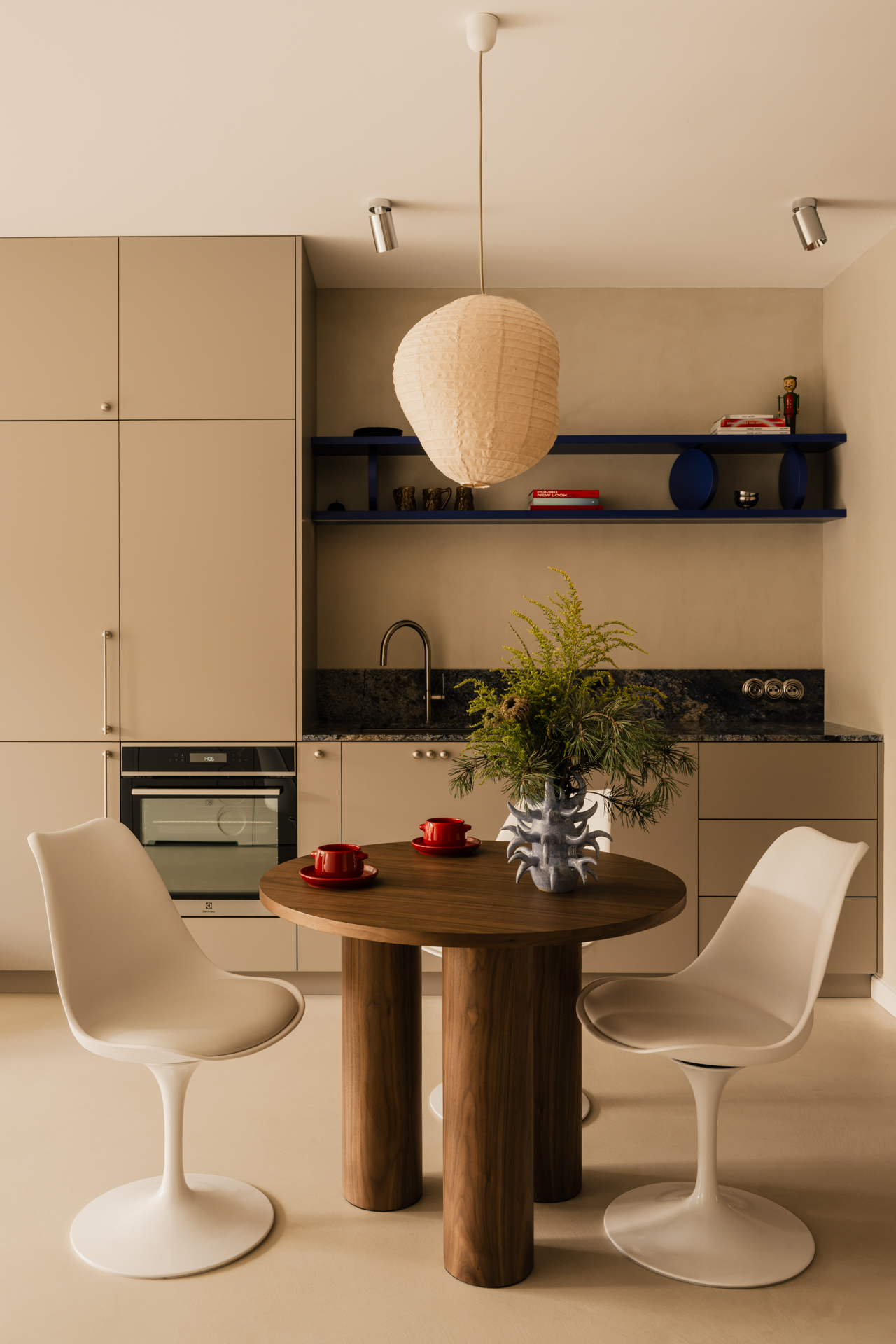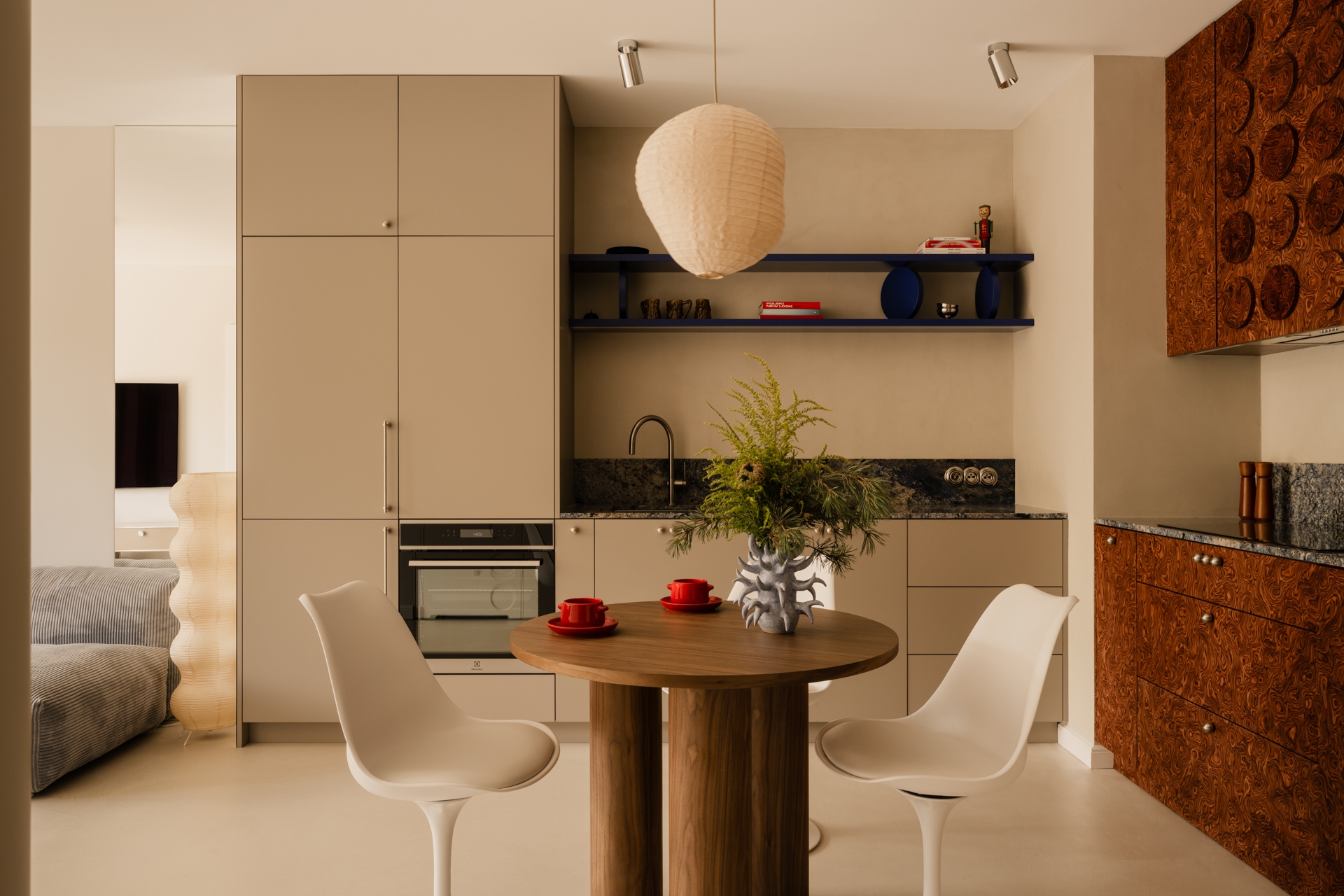 W kuchni dominują drewniane fronty z wyraźnym rysunkiem słojów, nawiązujące do stylistyki lat 60. Zestawiono je z niebieskim, granitowym blatem – chłodnym akcentem, który nadaje przestrzeni głębi i elegancji. Całość uzupełniają kultowe krzesła Tulip projektu Eero Saarinena, które są lekkie wizualnie, a przy tym rzeźbiarskie, dzięki pojedynczej, płynnie wyprowadzonej nodze.
