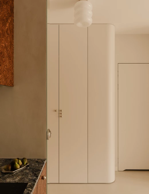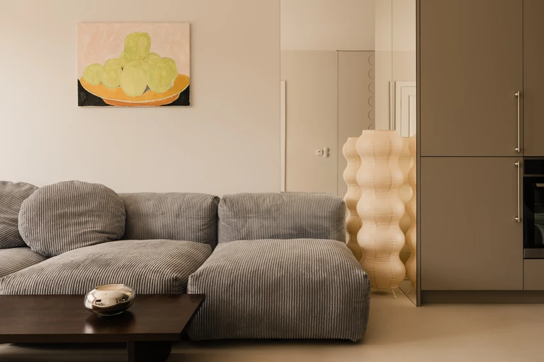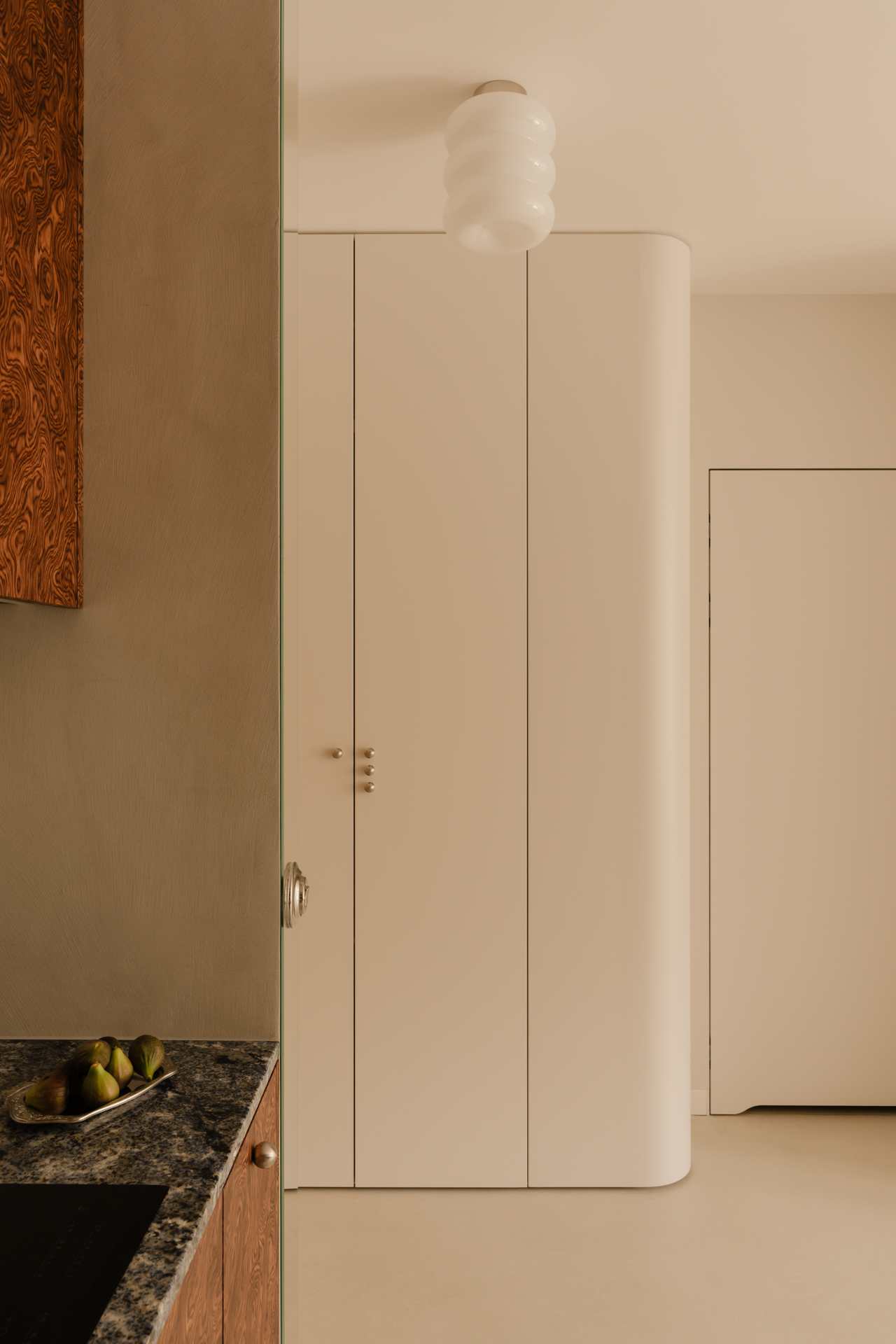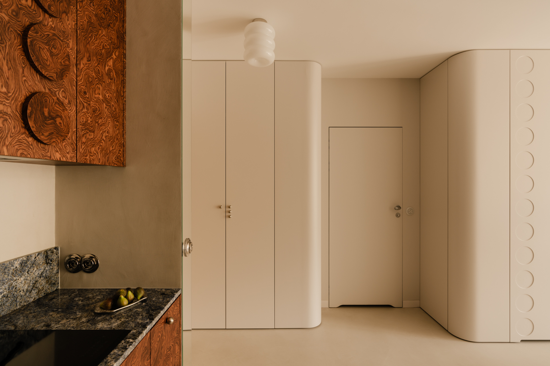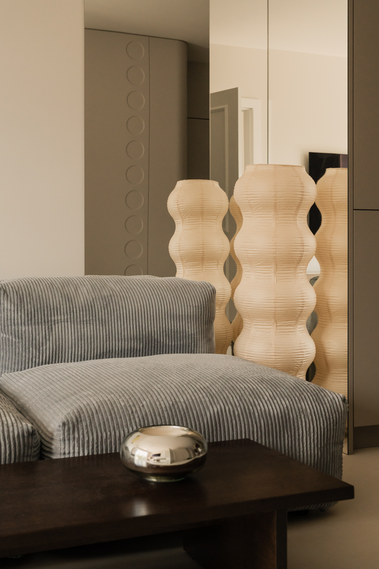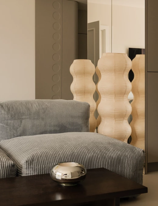 Projekt mieszkania opiera się na estetyce, w której minimalistyczne formy zyskują życie dzięki dopracowanym detalom. Bazą stały się naturalne materiały i harmonijna paleta barw, wśród których wyróżnia się ciepły, korzenny fornir oraz obłe, kuliste kształty inspirowane wzornictwem połowy XX wieku.