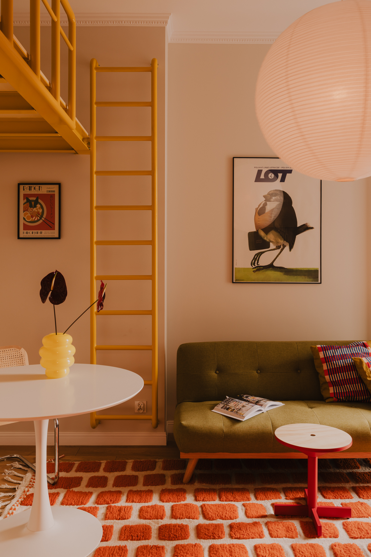 Do mieszkania wkracza się jak przez kurtynę w teatrze, ponieważ już od progu uwagę przyciągają intensywnie czerwone drzwi. Kolejny intensywny akcent kolorystyczny znajduje się niewiele dalej – sercem strefy dziennej jest żółta, stalowa konstrukcja antresoli. Wyrazista, niemal graficzna linia przecina przestrzeń i nadaje jej rytm, ma przy tym w sobie coś z przemysłowej surowości, którą równoważy miękkość dużego, papierowego klosza zawieszonego nisko nad salonem.