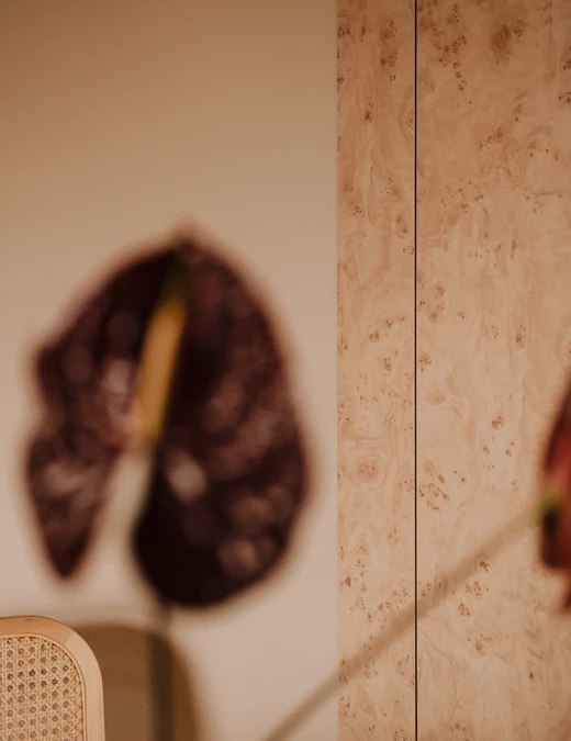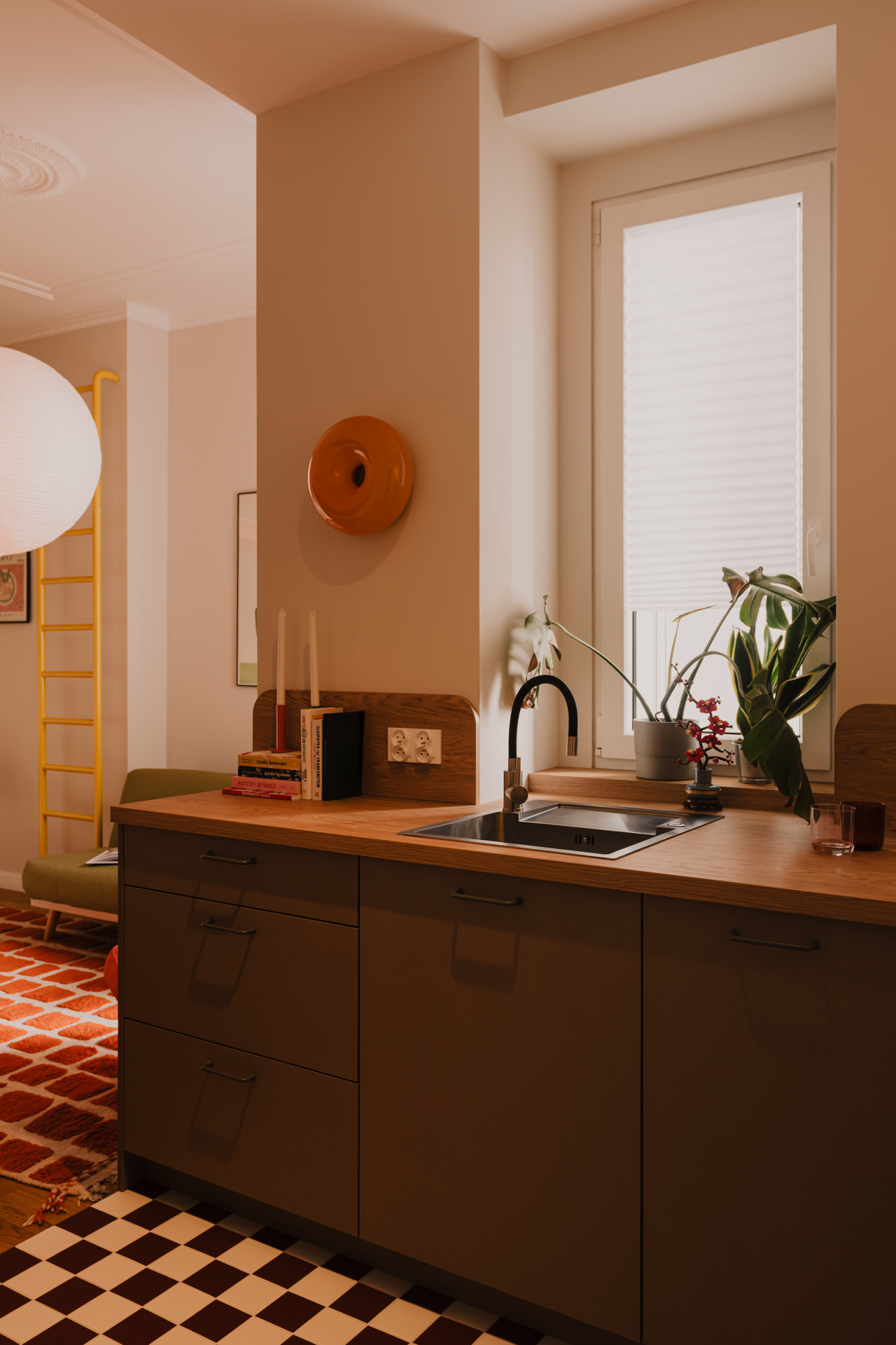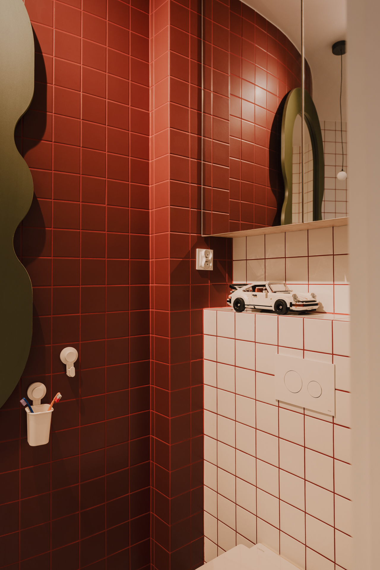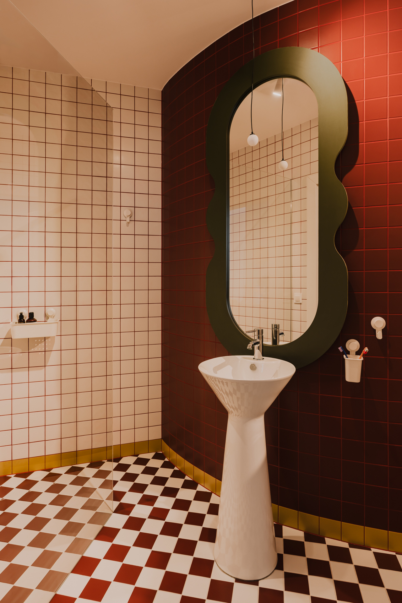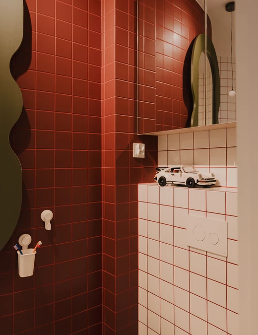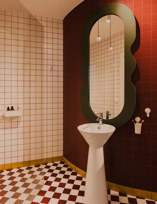 Jednak to właśnie łazienka jest najbardziej zaskakującym elementem tego projektu. Drobna siatka płytek buduje niemal scenograficzny efekt. Faliste lustro w głębokiej zieleni, zawieszone na czerwonej ścianie, przyciąga wzrok i przełamuje geometryczność kompozycji. Smukła, wolnostojąca umywalka o kielichowej formie dodaje całości niemal ceremonialnego charakteru. Posadzka w biało-bordową szachownicę przywodzi na myśl włoskie wnętrza z połowy XX wieku.