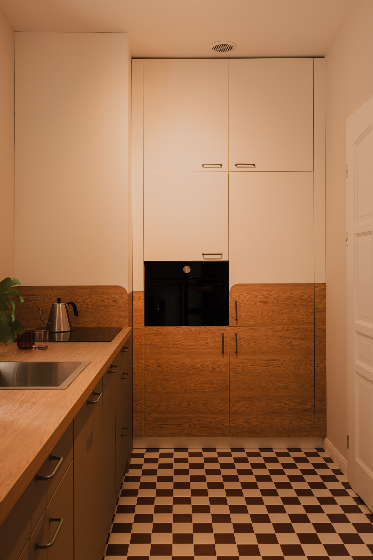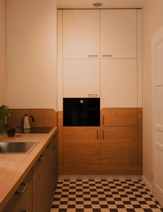 Kuchnia stylistycznie koresponduje z łazienką. Podłogę wykończono płytkami ułożonymi w szachownicę, a motyw ten powraca również w strefie kąpielowej.