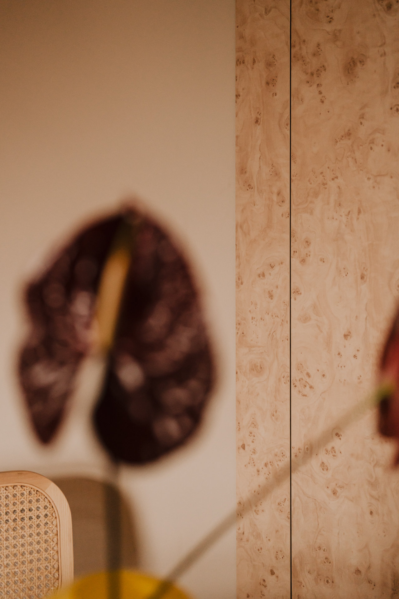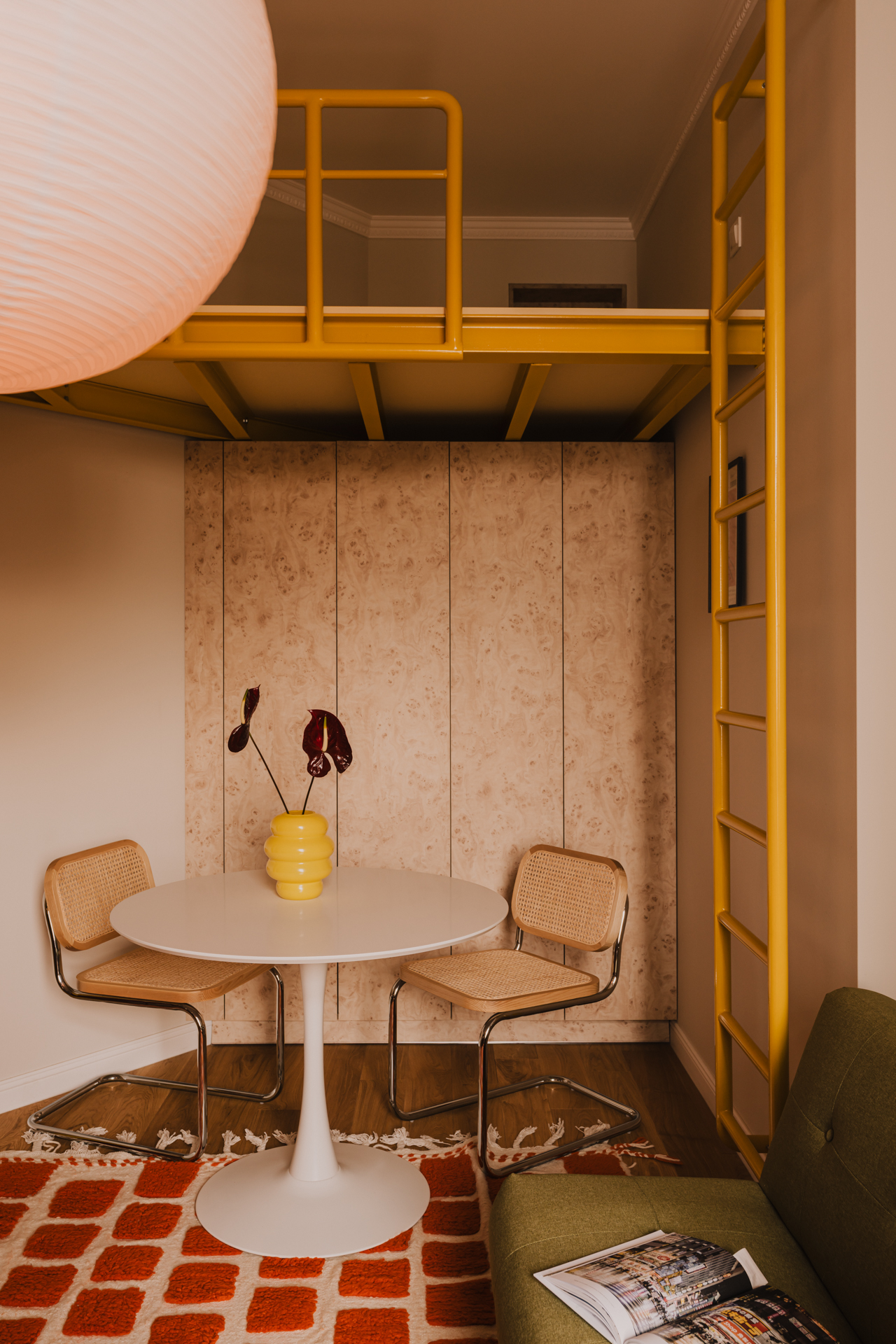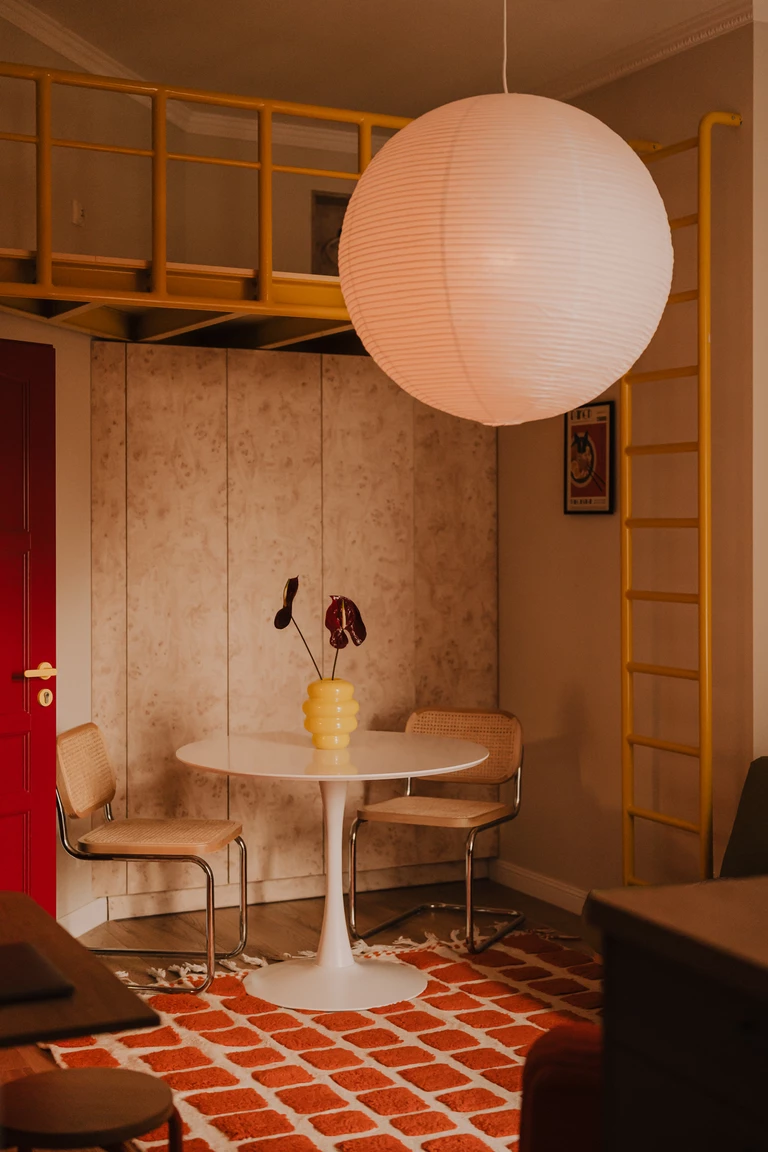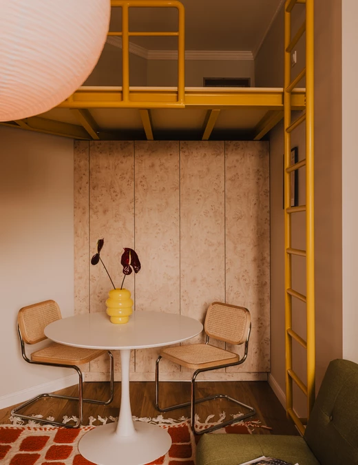Pod żółtą konstrukcją urządzono niewielką jadalnię. Okrągły, biały stół na tulipanowej nodze zestawiono z krzesłami o plecionych siedziskach i chromowanych podstawach. To połączenie lekkości i subtelnego retro. Pod stopami rytm przestrzeni nadaje dywan w ceglastą kratę, w którym można dostrzec modernistyczny charakter. W tle pojawia się jasna zabudowa o rysunku naturalnej czeczoty.