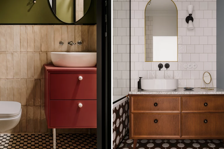 Projektantki z taka pracownia zdecydowały się położyć na podłodze w łazience gorseciki – kafelki typowe dla przedwojennej architektury. Beżowe płytki współgrają ze złamaną zielenią na ścianach, a aranżację dopełnia szafka umywalkowa w kolorze zgaszonej czerwieni.