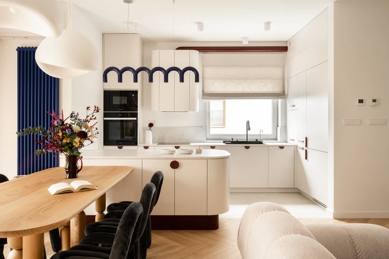Ważną funkcję w aranżacji pełnią miękkie kształty, w tym obłości, które łagodzą geometryczne linie architektoniczne wnętrza. Pikowana sofa, nietypowe antracytowe krzesła czy drewniany stół z zaokrąglonymi brzegami i fantazyjnymi nogami tworzą razem harmonijną całość. Łagodne formy są widoczne nie tylko w meblach, ale także w dodatkach. Można je dostrzec w okrągłych lustrach, subtelnych łukach w oświetleniu czy miękkich liniach uchwytów. Projektantka zaznacza, że: „To wnętrze jest zaprzeczeniem ostrych krawędzi, a jego kształty zdają się niemal zapraszać do dotyku”.