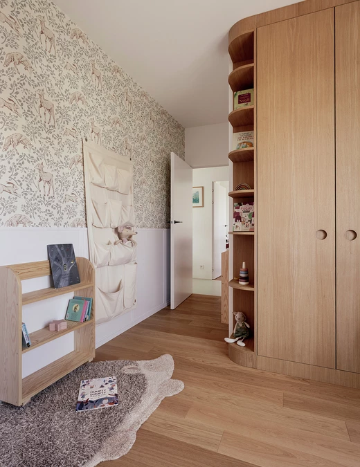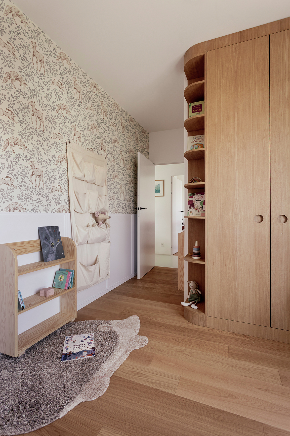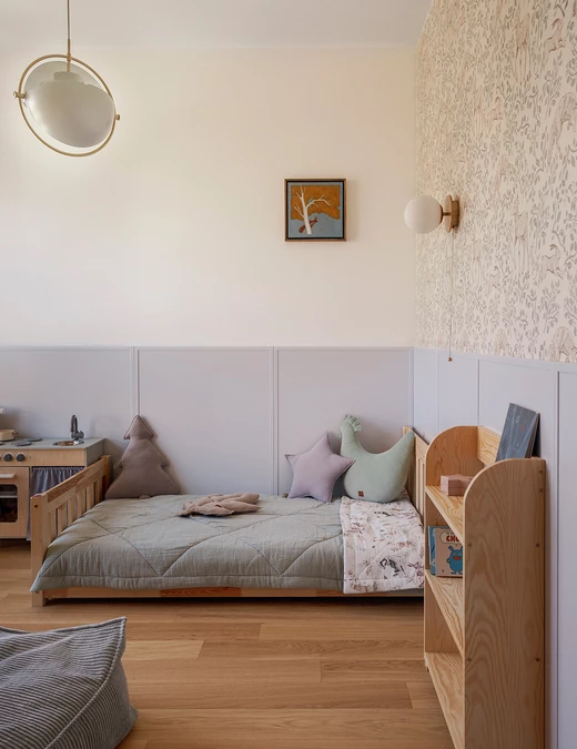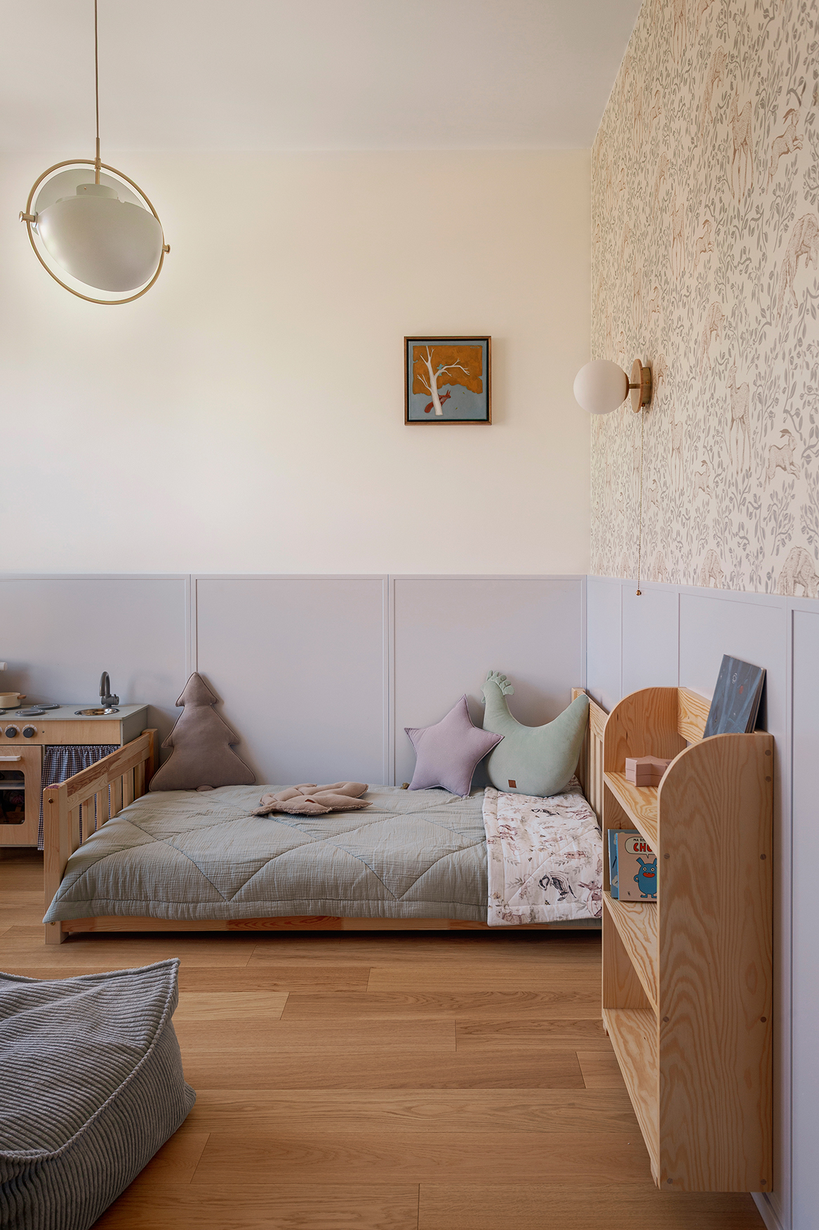 W pokoju córki również pojawił się pastelowy akcent, starannie dobrany tak, by nie przytłoczyć niewielkiej przestrzeni i zachować neutralny, łagodny charakter. Szafa zaprojektowana na zamówienie została dopasowana do potrzeb małego użytkownika. Jest ergonomiczna, funkcjonalna i estetyczna.