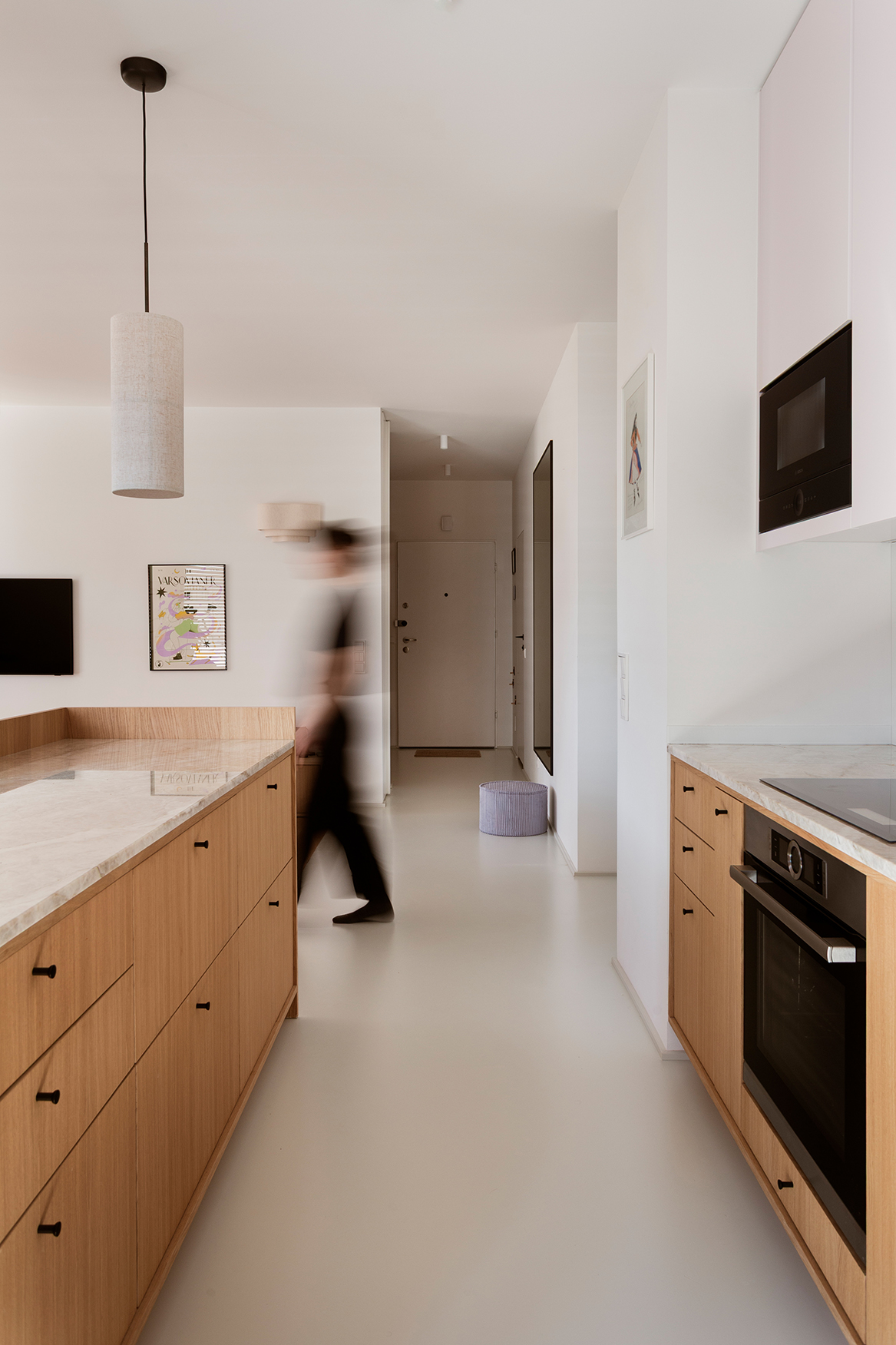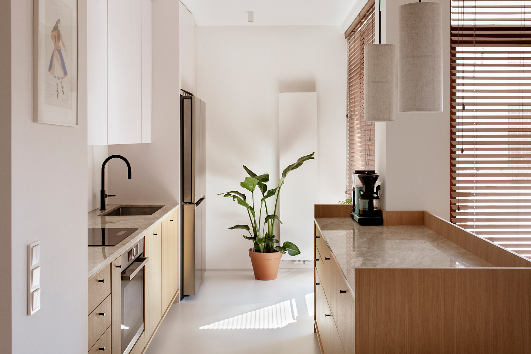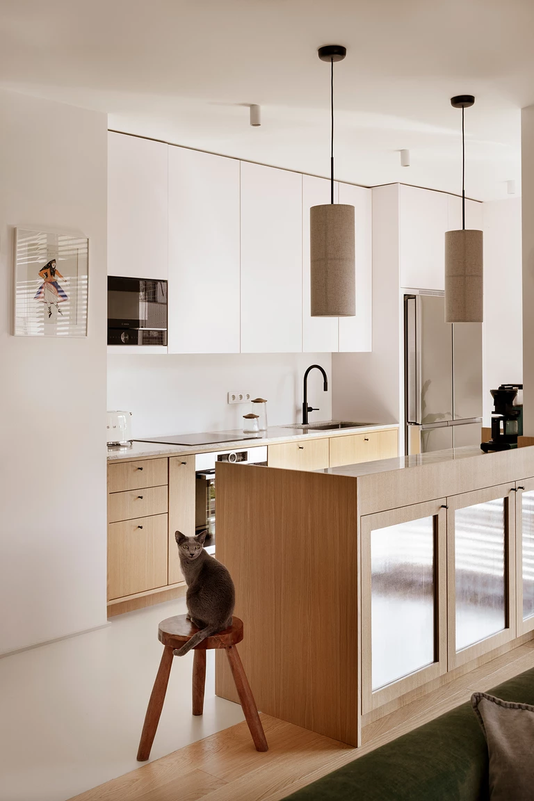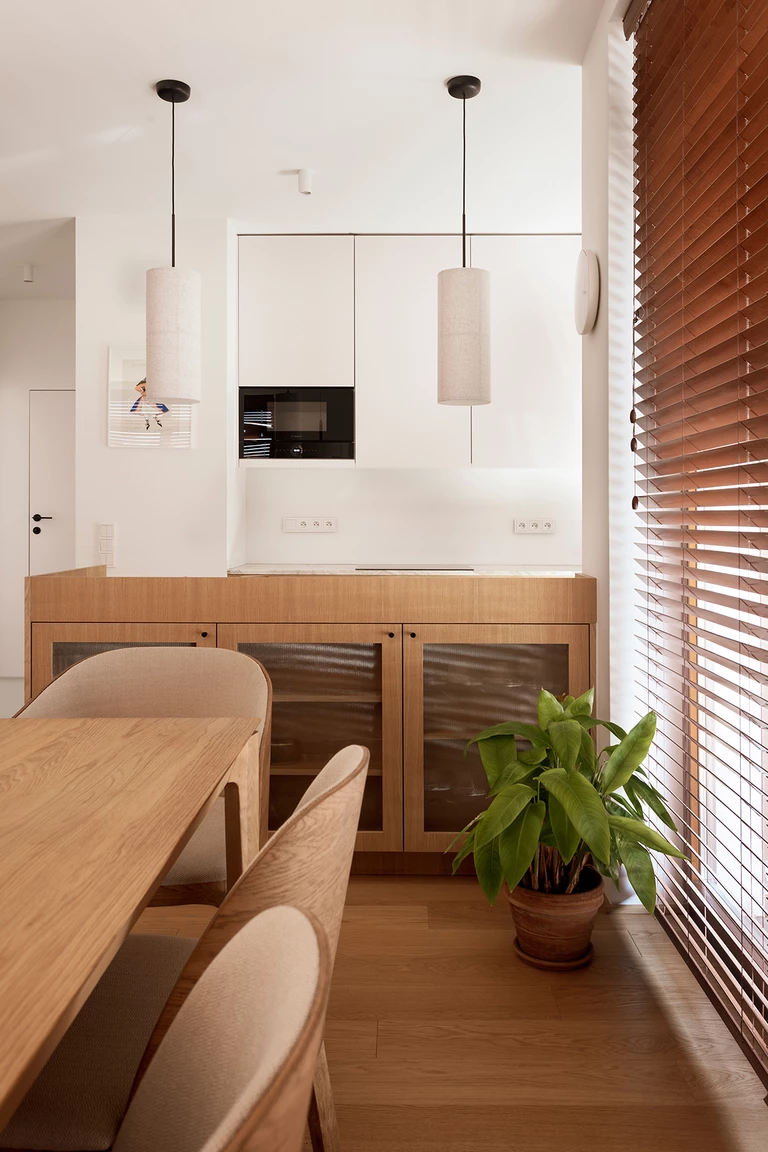 Serce mieszkania stanowi kuchnia zaprojektowana na wymiar, z frontami z naturalnego, lekko bielonego dębu i blatem z kwarcytu Taj Mahal. Całość dopełniają lniane lampy, subtelnie nawiązujące do stylu Japandi – ocieplające wnętrze i dodające mu przytulności mimo oszczędnej formy.