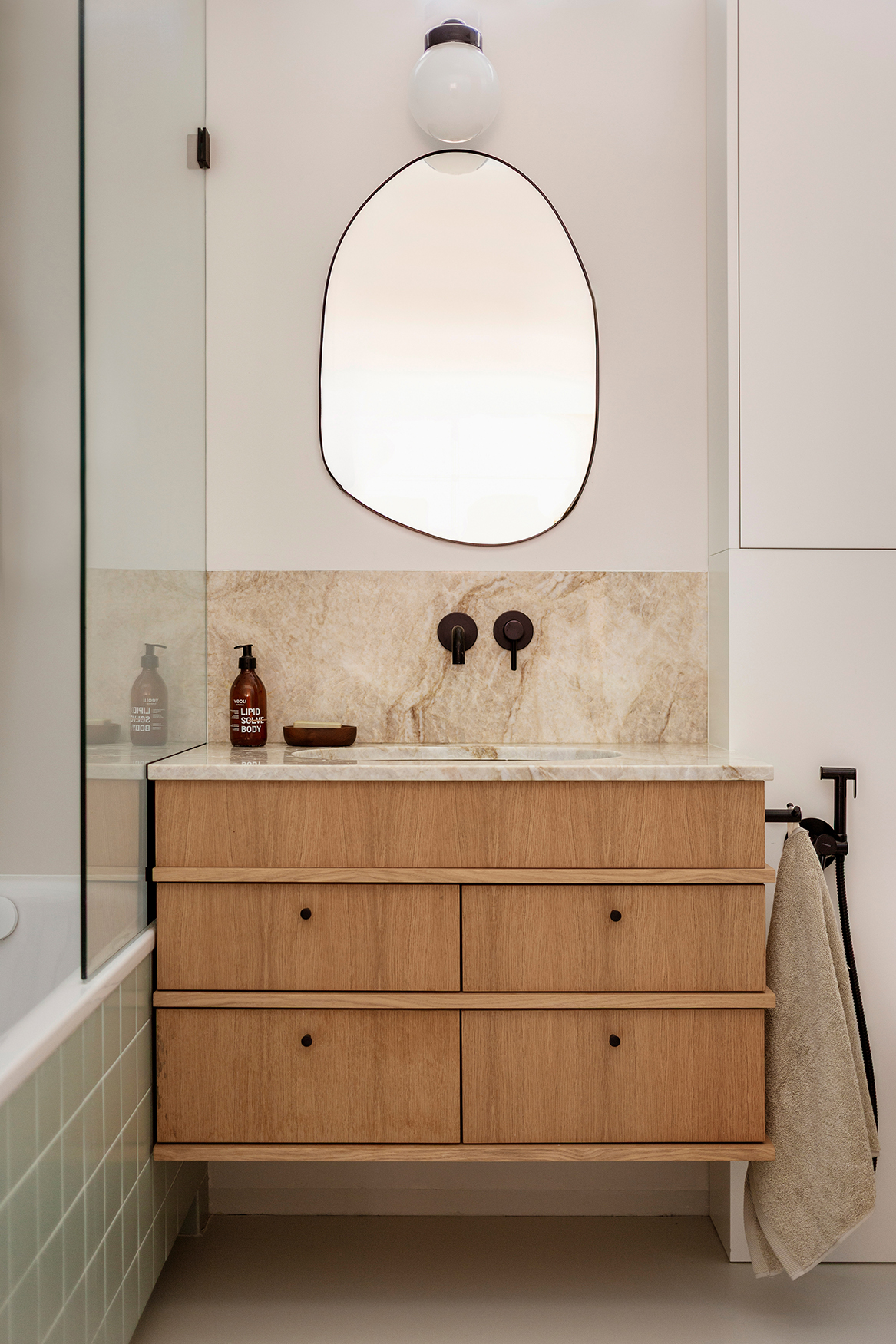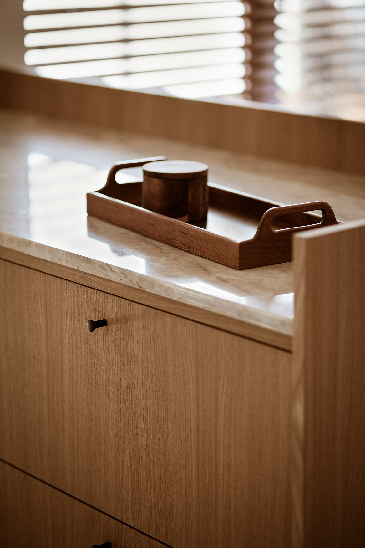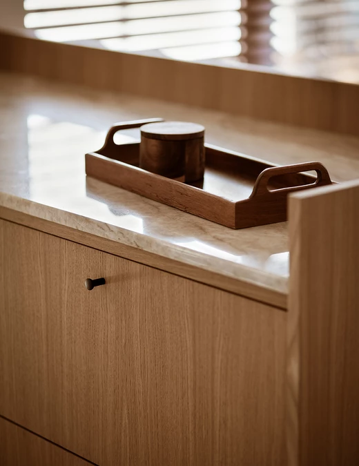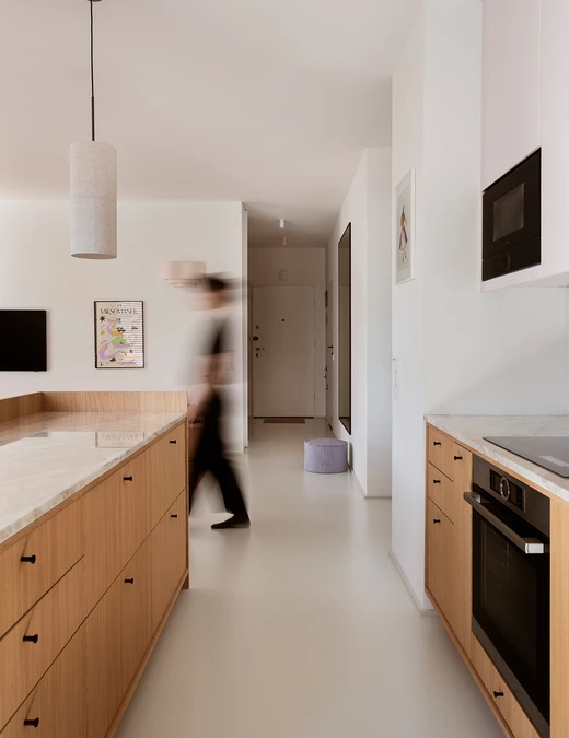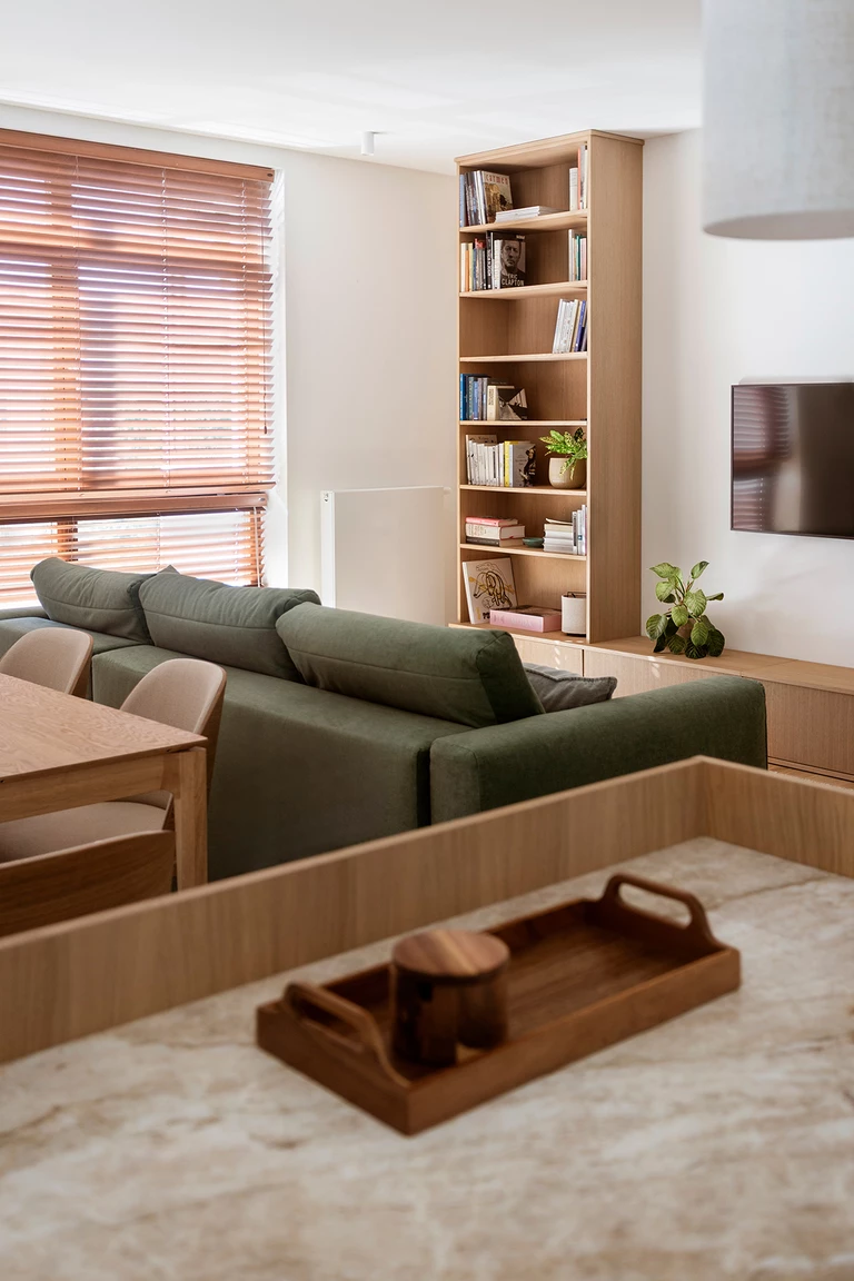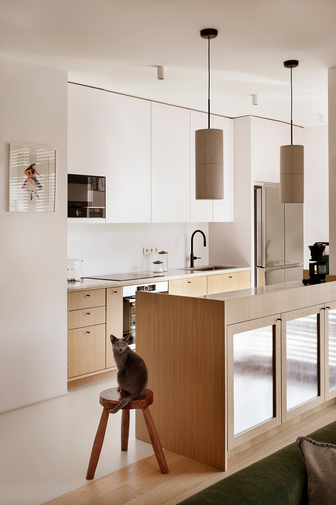 Serce mieszkania stanowi kuchnia zaprojektowana na wymiar, z frontami z naturalnego, lekko bielonego dębu i blatem z kwarcytu Taj Mahal. Całość dopełniają lniane lampy, subtelnie nawiązujące do stylu Japandi – ocieplające wnętrze i dodające mu przytulności mimo oszczędnej formy.