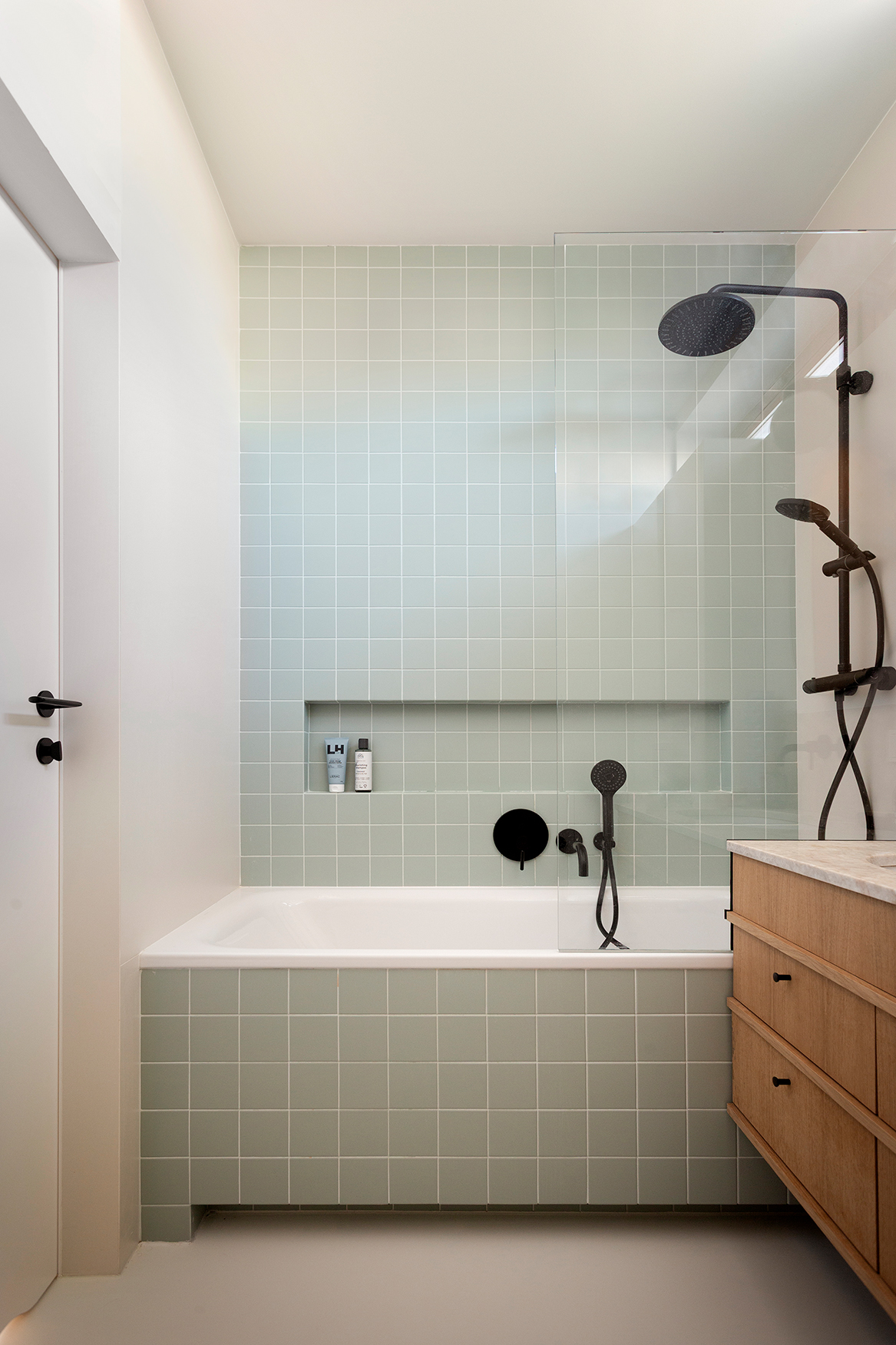 Wszystkie materiały miały zostać użyte oszczędnie, za to bez cięcia budżetu na ich jakości. Stąd wybór płytek włoskiego producenta Cesi w wc i łazience. Na posadzce w części wejściowej i łazienek położono żywicę, która bardzo dobrze sprawdza się nam we wnętrzach – wyjaśniaja autorki.