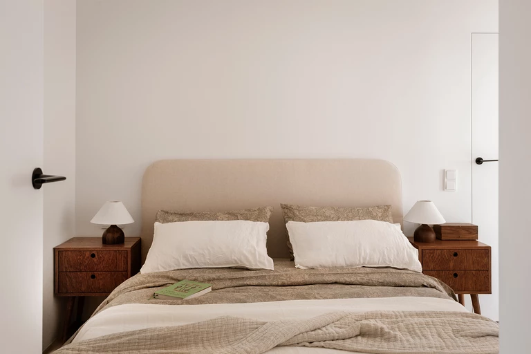 W sypialni jasne, miękkie tkaniny kontrastują z ciemniejszym odcieniem drewna.