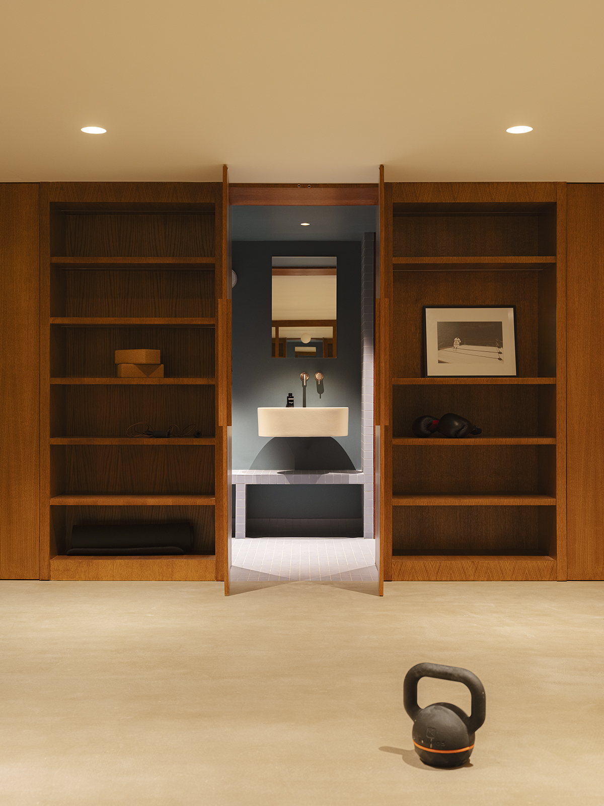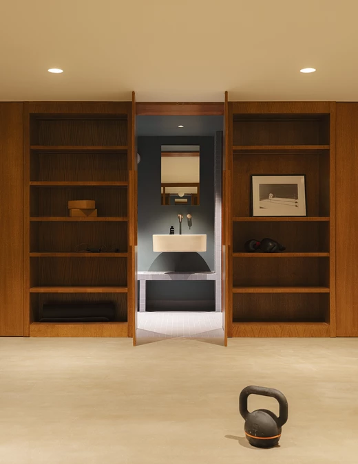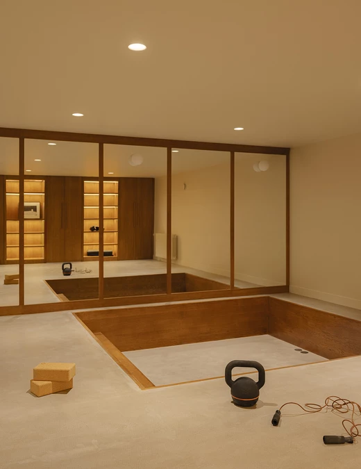 Projektantki zaplanowały w kondygnacji podziemnej też domową siłownię. Aby zadbać o spójność wnętrz, wykorzystały w tej części domu te same wykończenia, co w pozostałych strefach. Obok siłowni znalazło się również miejsce na łazienkę.