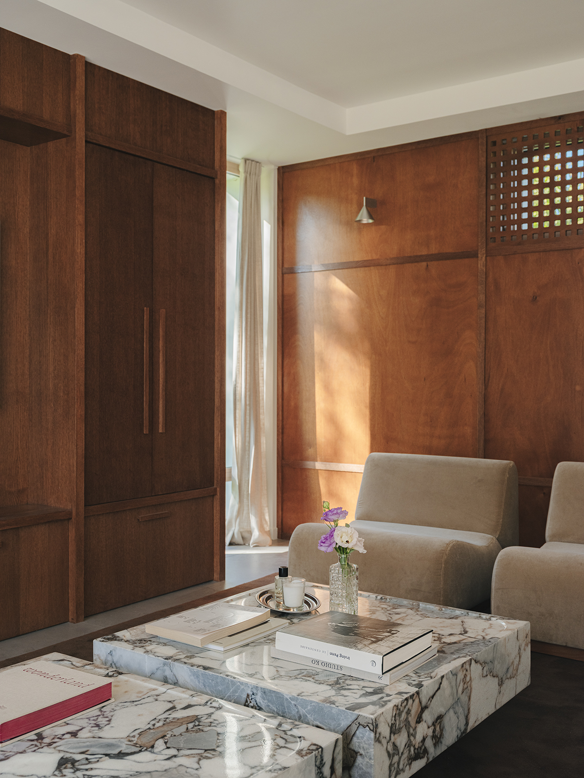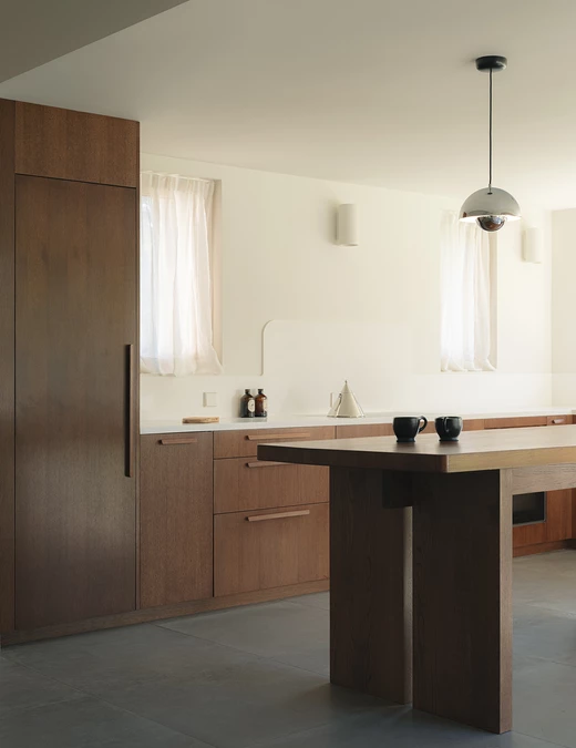 Punktem wyjścia stała się praca nad ciągłością wnętrza. Projektantki oparły projekt na połączeniu dwóch gatunków drewna o różnym usłojeniu i temperaturze barwy – dębie i okoumé. Z tego zestawienia powstał motyw przewodni, który wraca w boazeriach, portalach przejść i zintegrowanych schowkach.