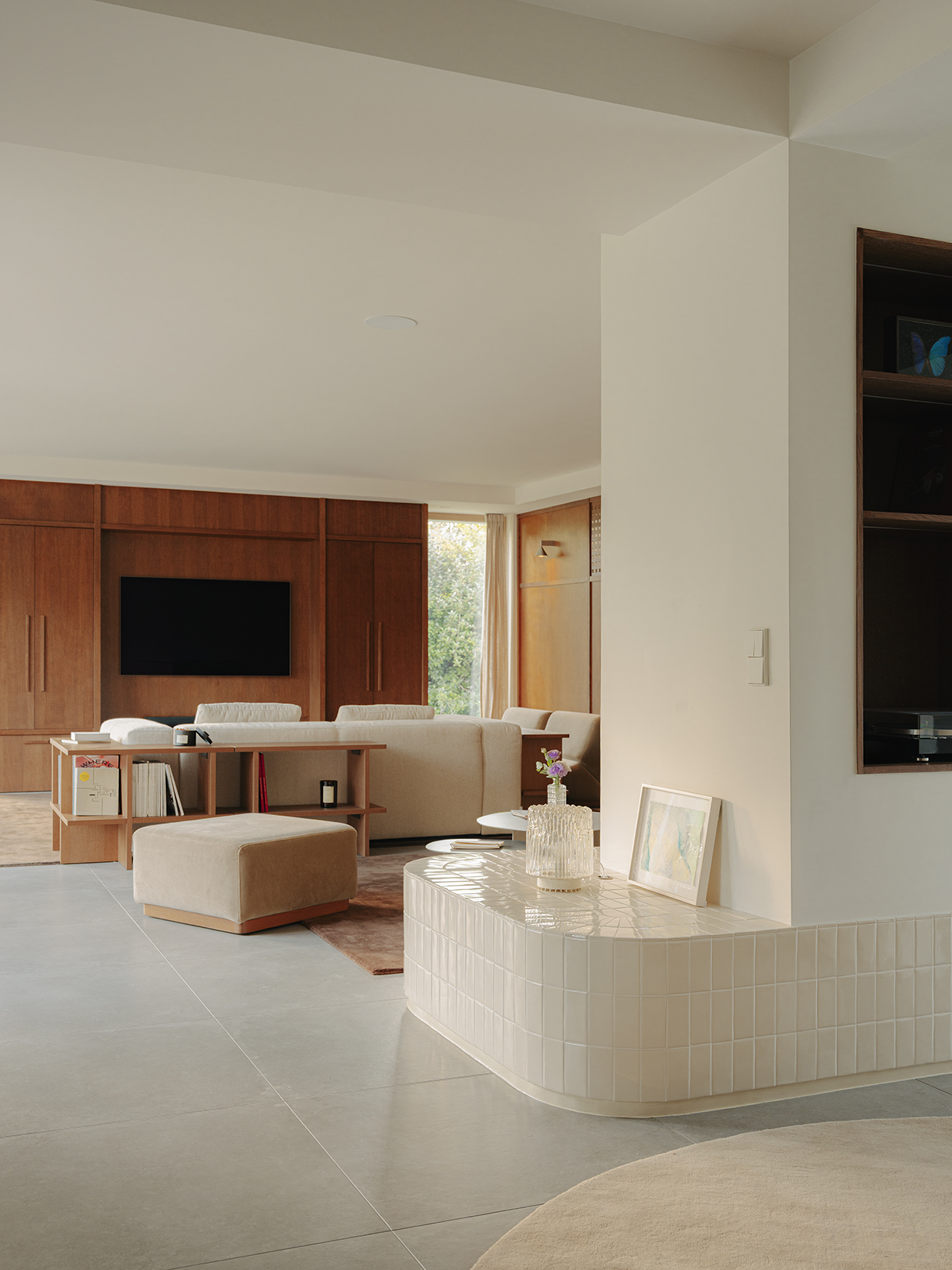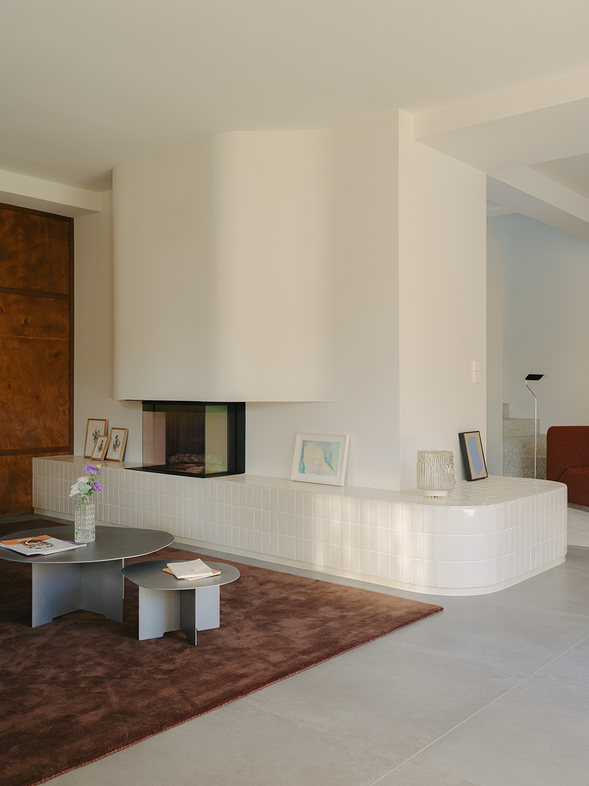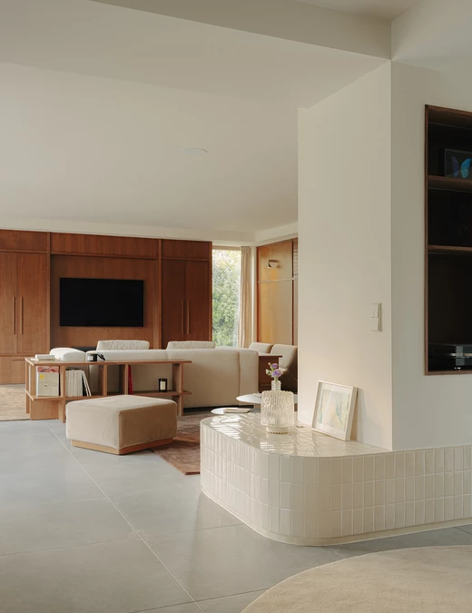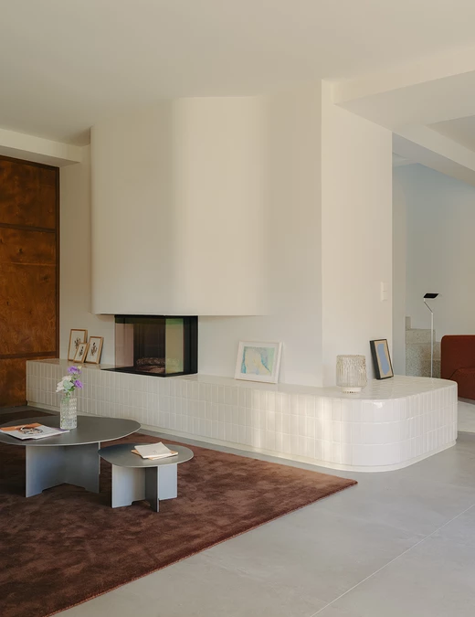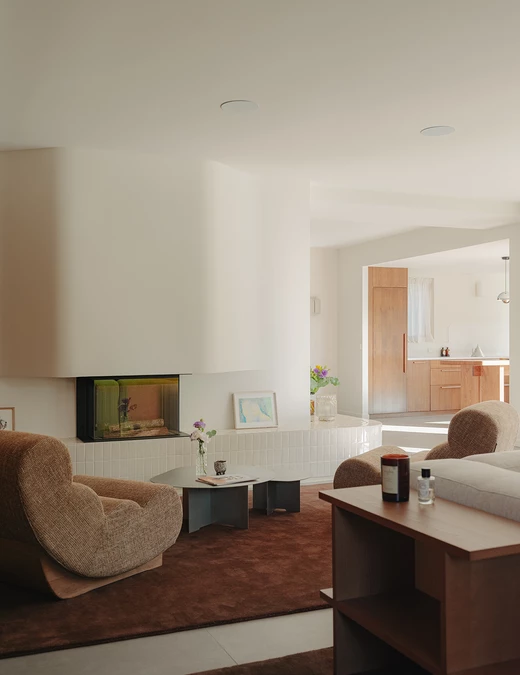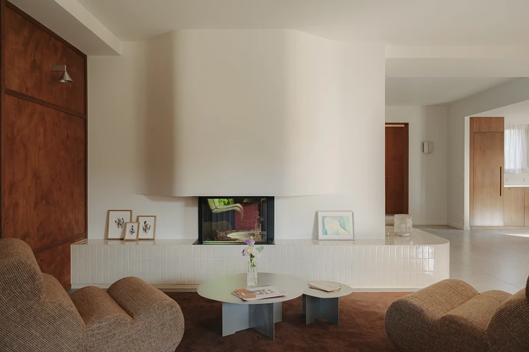 Salon i kuchnia zostały ujednolicone okładzinami drewnianymi, dzięki czemu przestrzeń zyskała wyraźną ramę. W salonie dębowe panele budują proporcje ścian i rozmieszczenie przejść. Kontrastem dla drewna jest kominek obłożony jasnymi płytkami ceramicznymi, które miękko odbijają światło dzienne i rozpraszają je po pomieszczeniu.